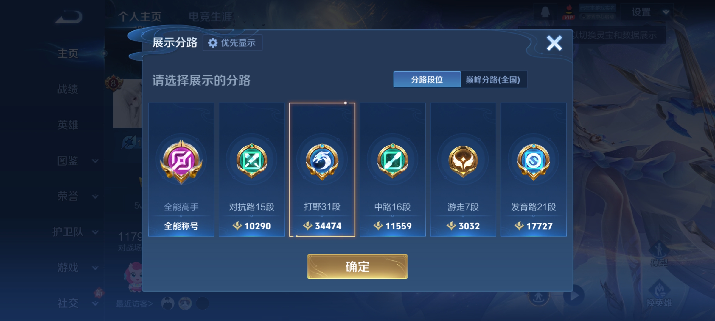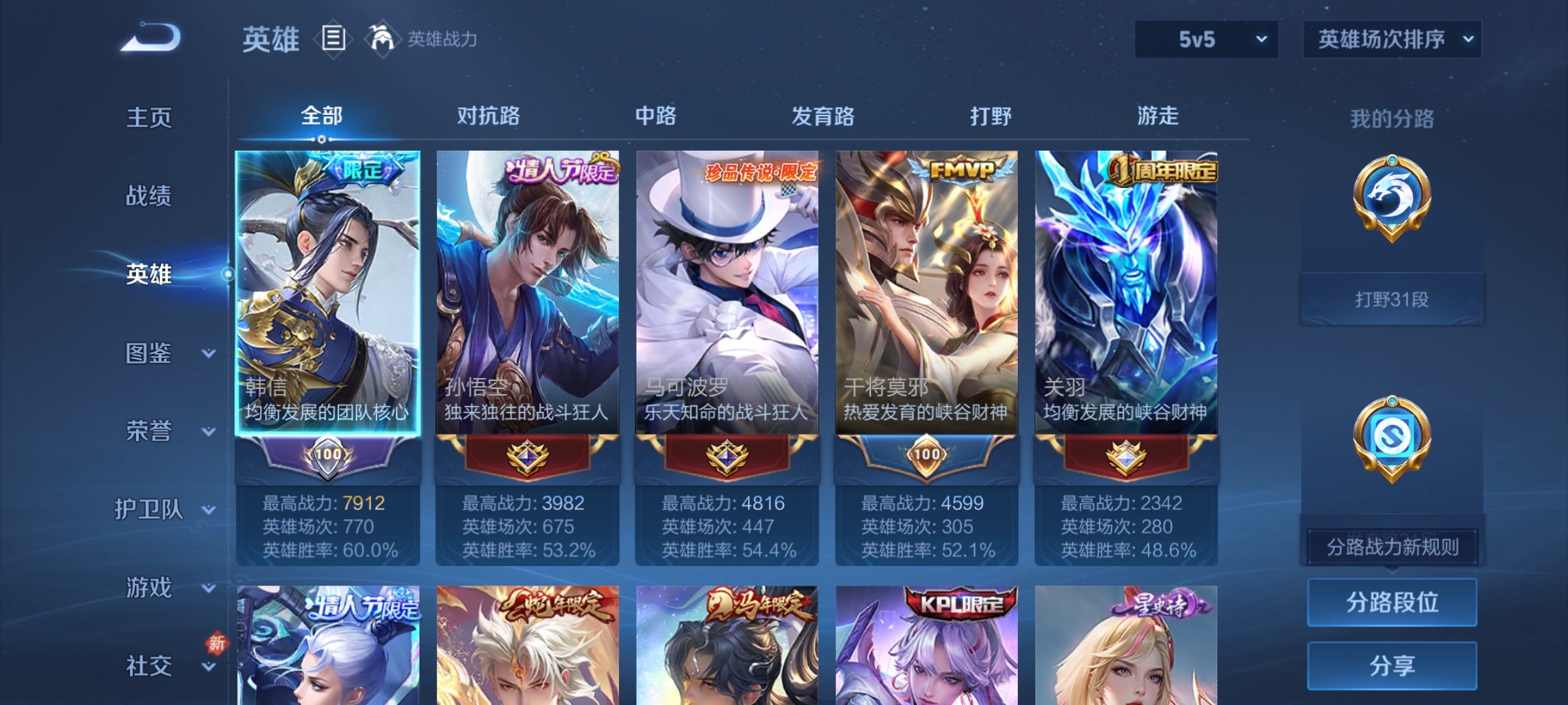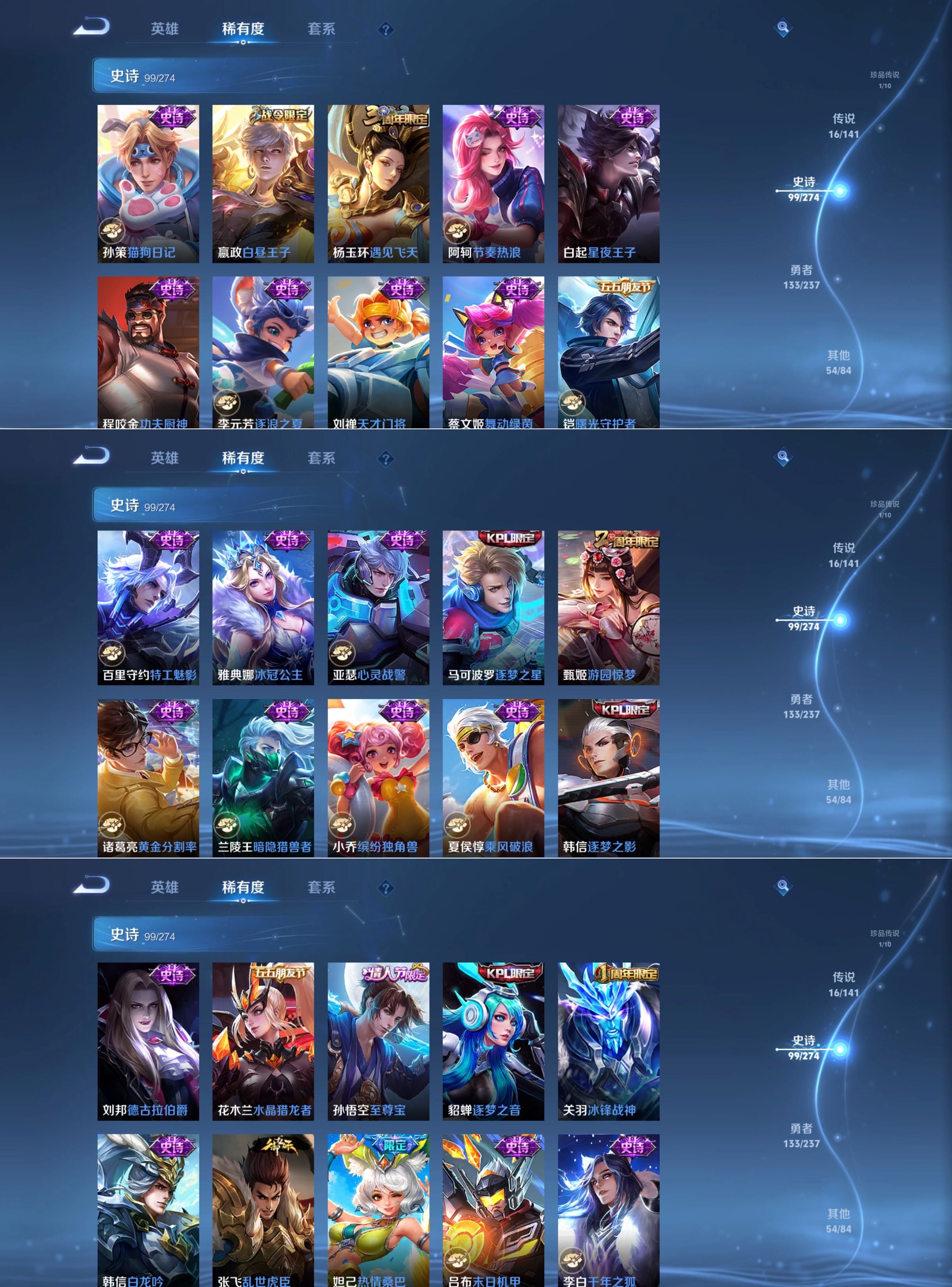 贵族等级:v8皮肤数:305传说品质16 生肖限定4 情人节限定2 珍品传说1 荣耀典藏2 英雄数:128