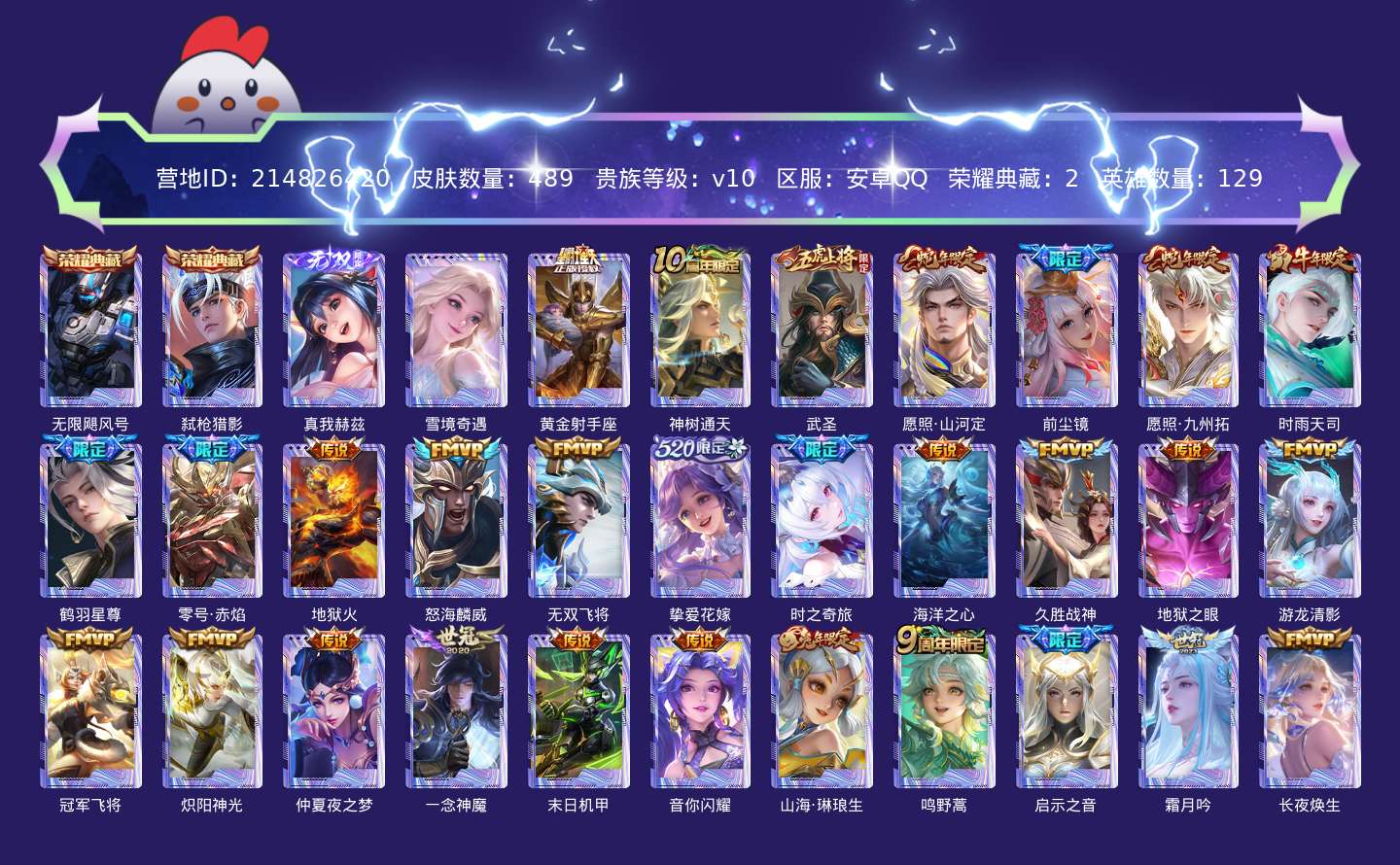 贵族等级:v10皮肤数:489传说品质54 生肖限定17 情人节限定6 荣耀典藏2 无双2 英雄数:129