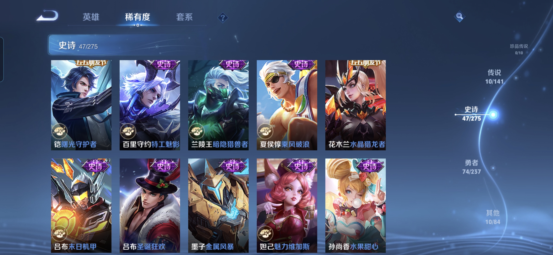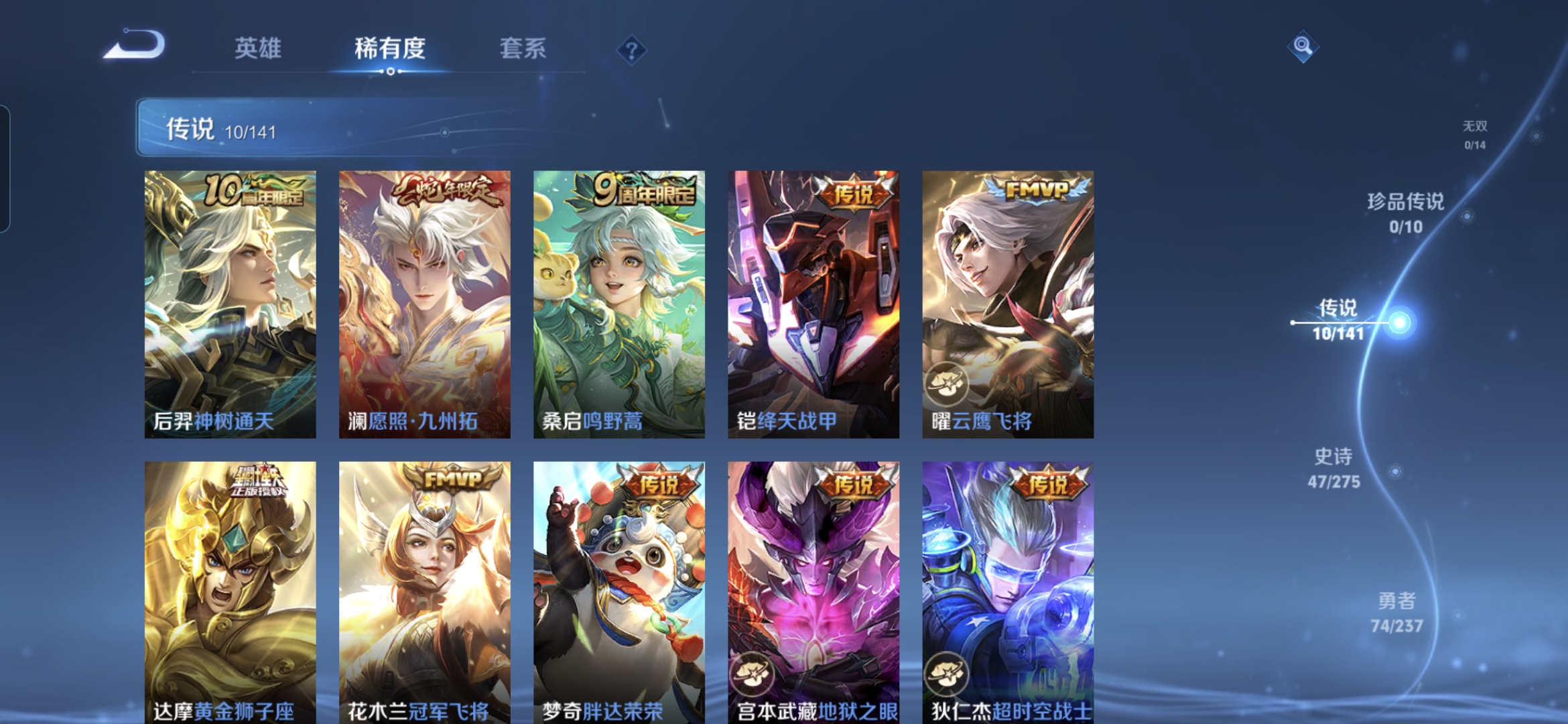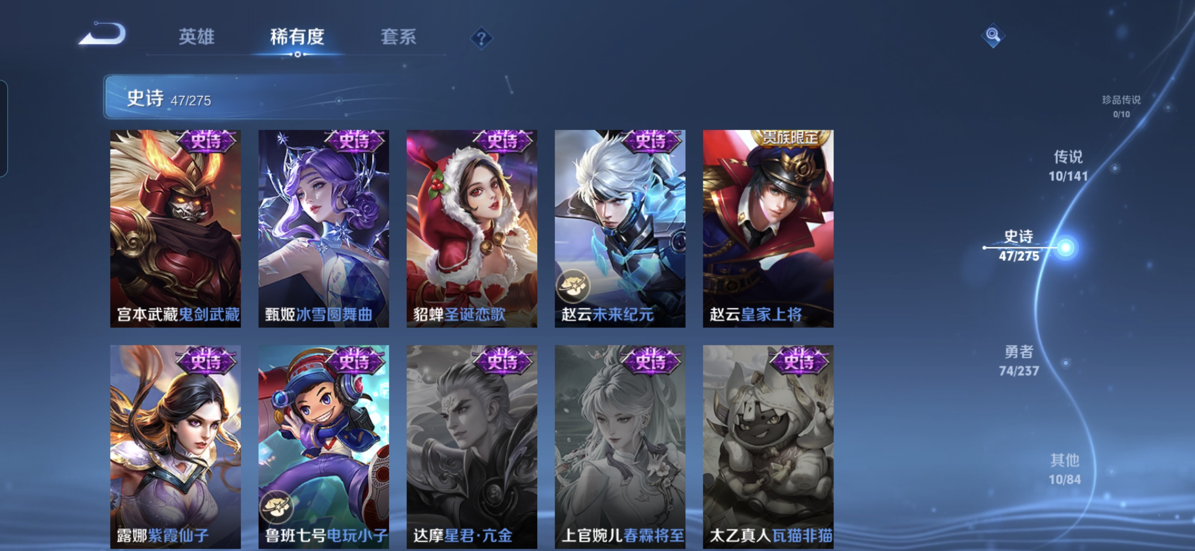 贵族等级:v5皮肤数:141传说品质10 生肖限定1 英雄数:127
