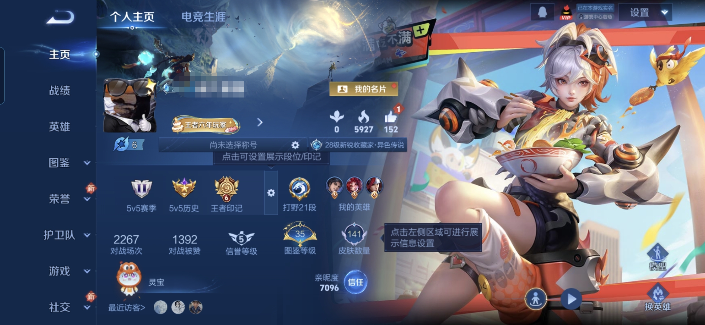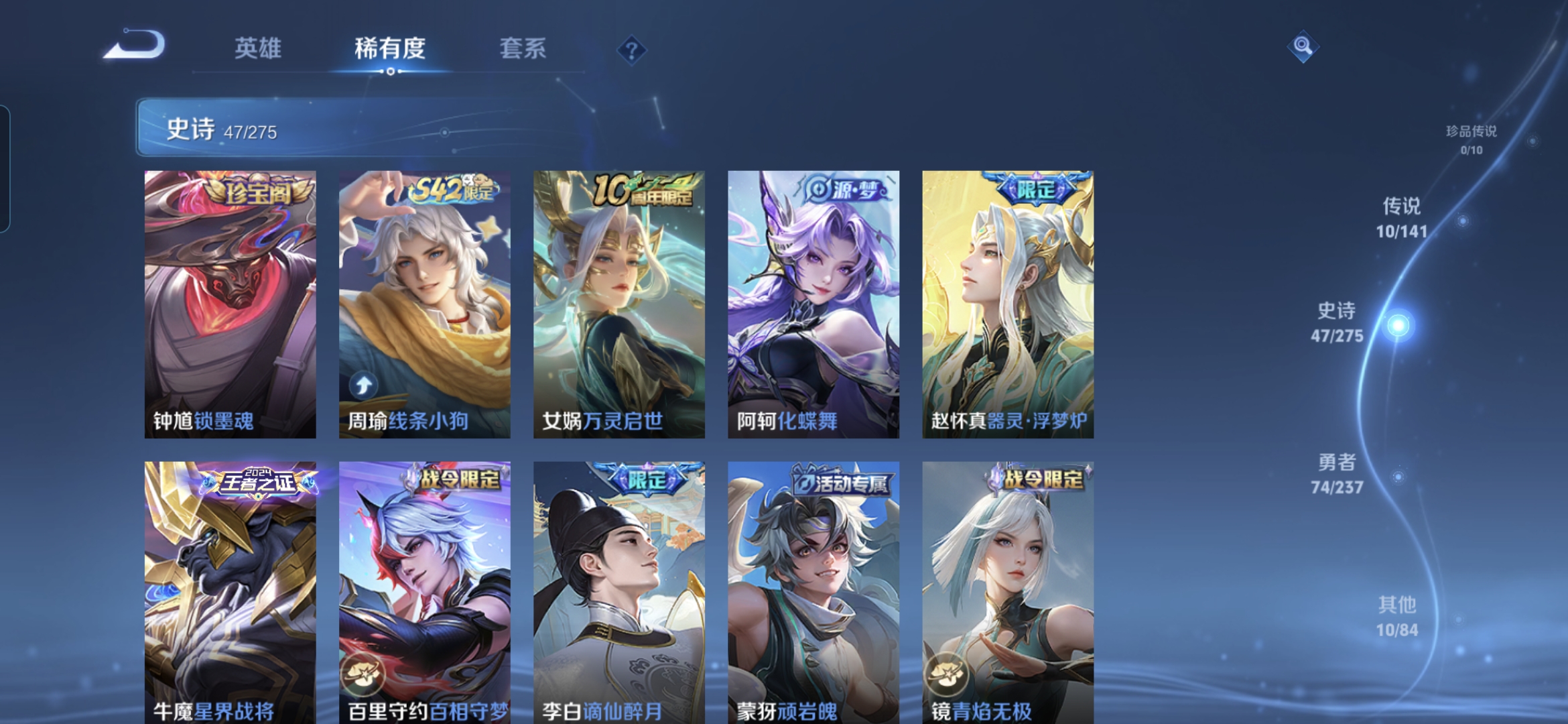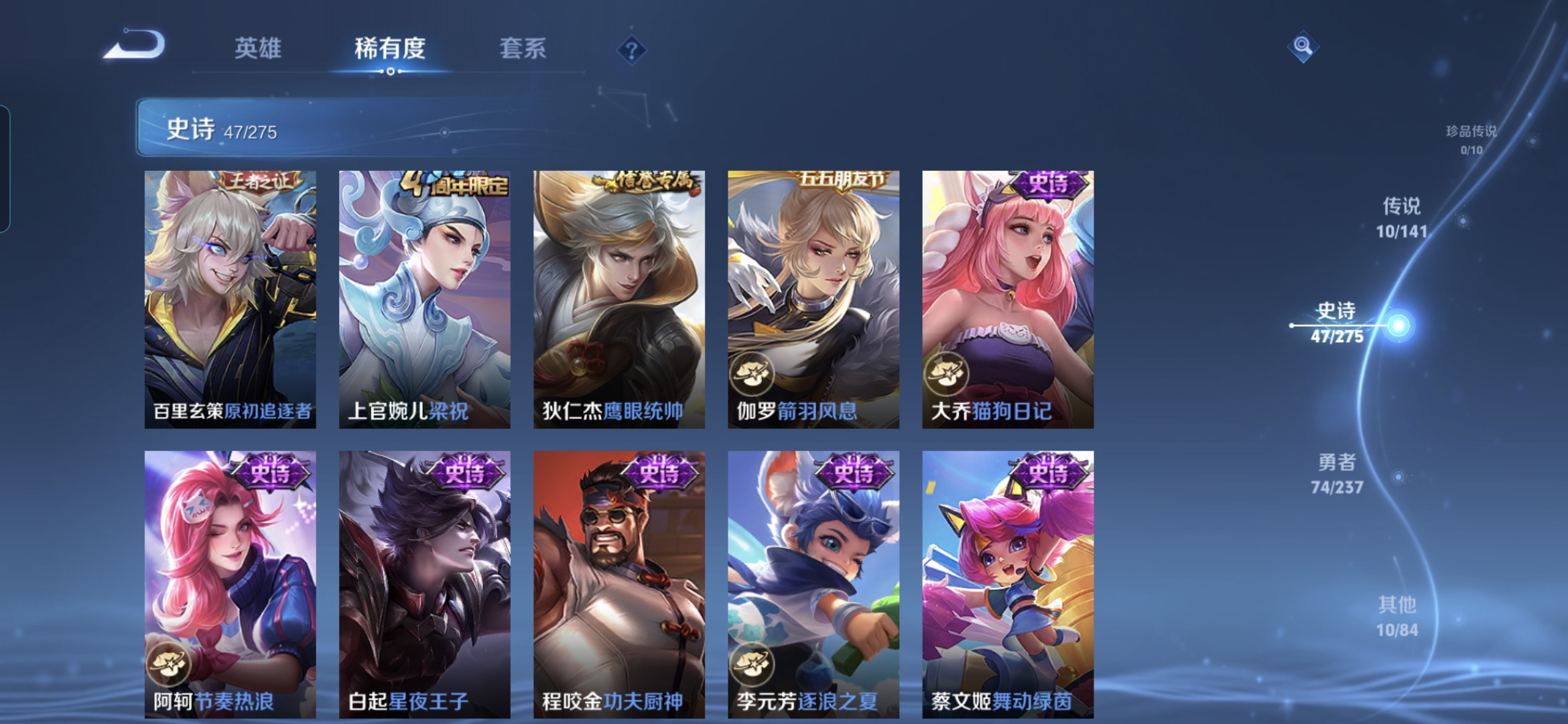 贵族等级:v5皮肤数:141传说品质10 生肖限定1 英雄数:127