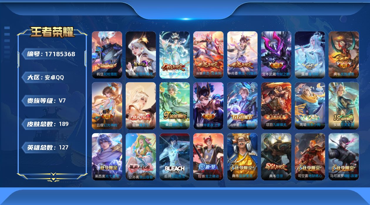 贵族等级:v7皮肤数:189生肖限定5 传说品质11 情人节限定1 荣耀典藏1 英雄数:127