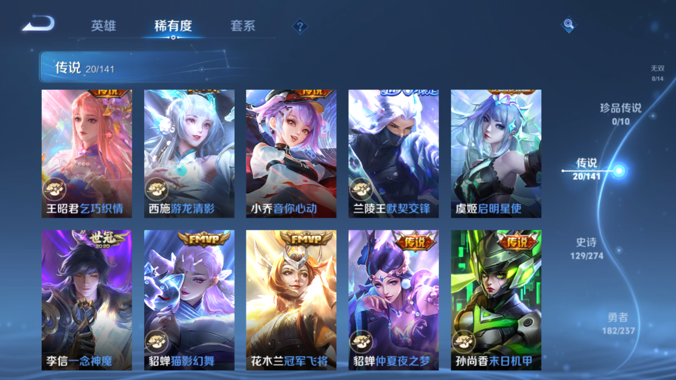 贵族等级:v9皮肤数:414情人节限定6 传说品质20 生肖限定6 荣耀典藏3 英雄数:128
