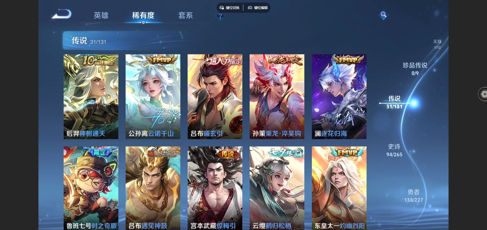 传说品质_后羿_神树通天传说品质_关羽_武圣传说品质_澜_逐花归海传说品质_诸葛亮_时雨天司传说品质_诸葛亮_鹤羽星尊传说品质_孙悟空_地狱火传说品质_吕布_曦玄引传说品质_吕布_遇见神鼓传说品质_吕布_怒海麟威传说品质_马超_无双飞将传说品质_干将莫邪_久胜战神传说品质_宫本武藏_地狱之眼传说品质_宫本武藏_惊梅引传说品质_西施_游龙清影传说品质_周瑜_音你心动传说品质_镜_炽阳神光传说品质_梦奇_胖达荣荣传说品质_东皇太一_灼幽烈阳传说品质_刘备_时之恋人传说品质_项羽_无限倾心传说品质_云缨_鹤归松栖传说品质_李白_诗剑行传说品质_公孙离_云诺千山传说品质_夏洛特_浮生妄传说品质_曜_云鹰飞将传说品质_孙策_乘龙·淬吴钩传说品质_狄仁杰_超时空战士传说品质_鲁班七号_时之奇旅传说品质_虞姬_云霓雀翎传说品质_虞姬_启明星使传说品质_王昭君_乞巧织情