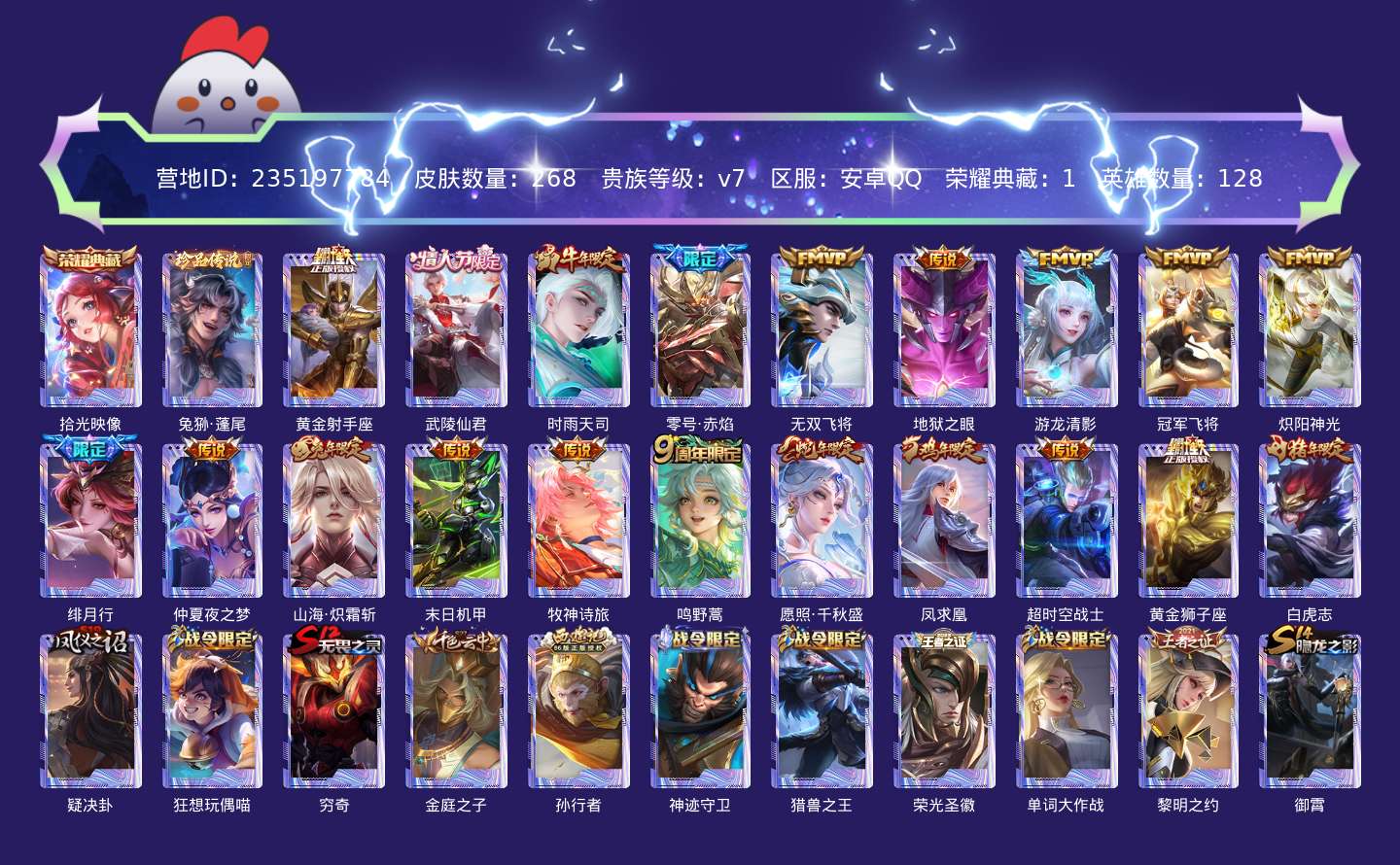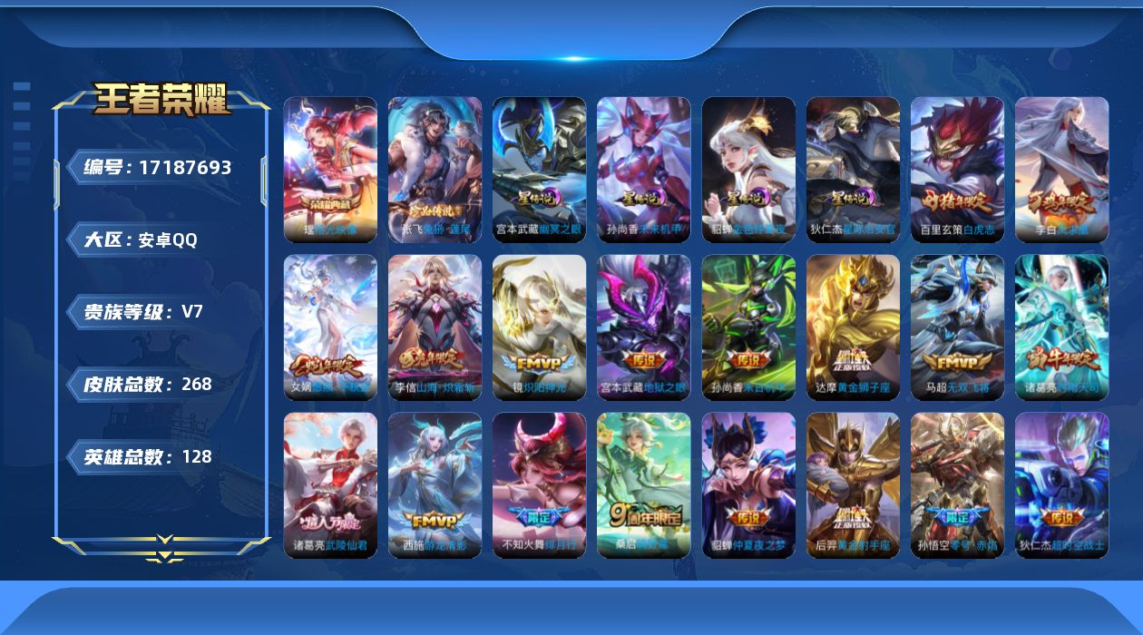 贵族等级:v7皮肤数:268传说品质20 情人节限定2 生肖限定5 荣耀典藏1 珍品传说1 英雄数:128