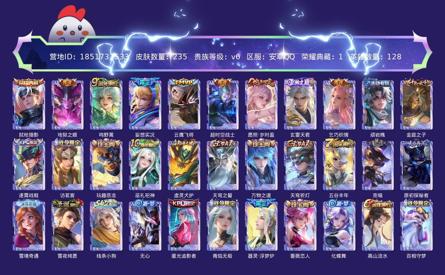 贵族等级:v6皮肤数:235传说品质8 生肖限定2 荣耀典藏1 英雄数:128
