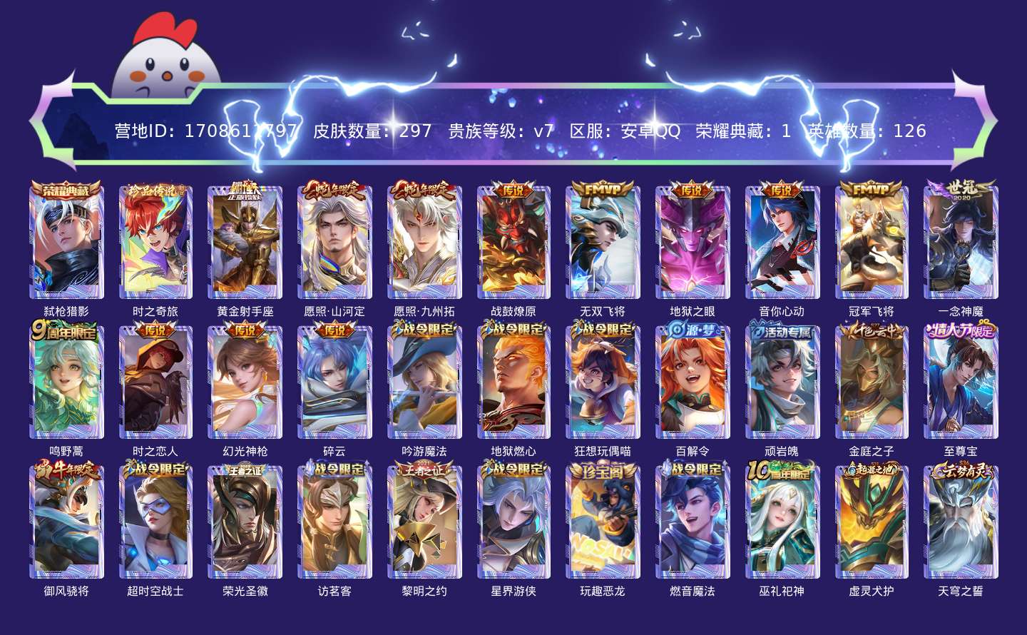贵族等级:v7皮肤数:297传说品质13 生肖限定4 情人节限定1 珍品传说1 荣耀典藏1 英雄数:126