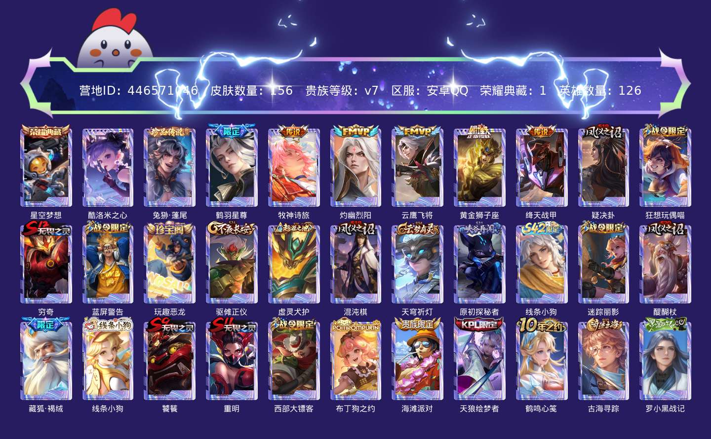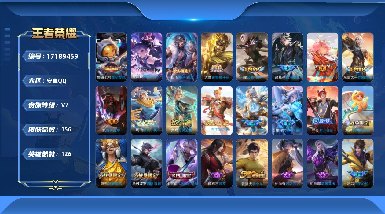 贵族等级:v7皮肤数:156传说品质6 珍品传说2 荣耀典藏1 英雄数:126