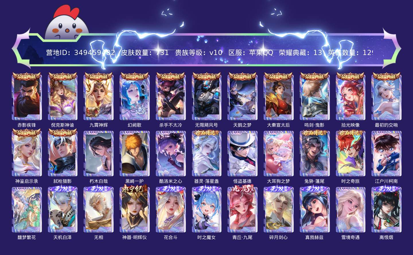贵族等级:v10皮肤数:731生肖限定40 传说品质127 情人节限定17 荣耀典藏13 无双13 珍品传说9 珍品无双1 英雄数:129