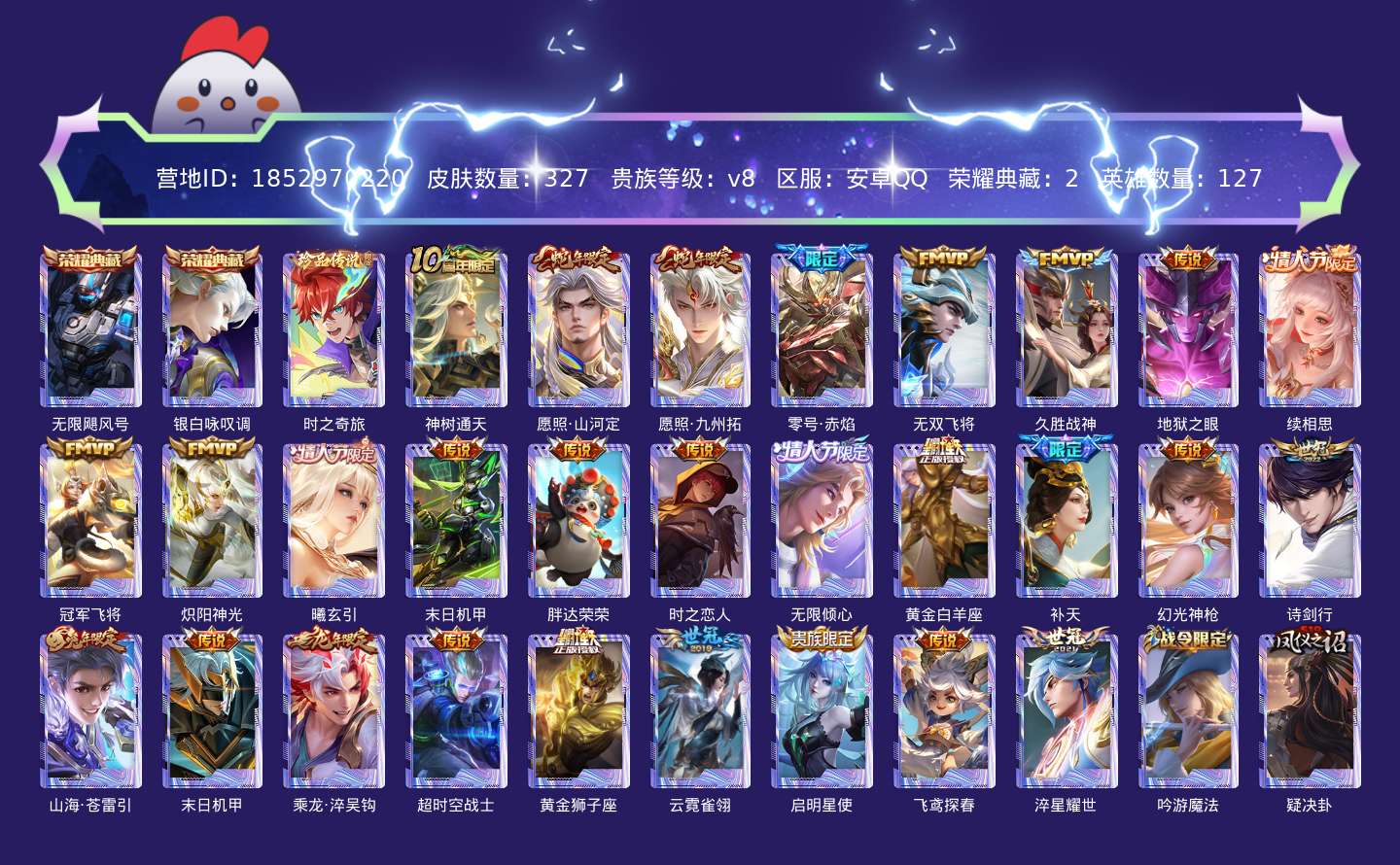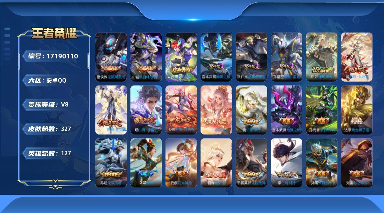 传说品质_后羿_神树通天传说品质_司空震_愿照·山河定传说品质_澜_愿照·九州拓传说品质_孙悟空_零号·赤焰传说品质_马超_无双飞将传说品质_干将莫邪_久胜战神传说品质_宫本武藏_地狱之眼传说品质_西施_续相思传说品质_花木兰_冠军飞将传说品质_镜_炽阳神光传说品质_貂蝉_曦玄引传说品质_孙尚香_末日机甲传说品质_梦奇_胖达荣荣传说品质_刘备_时之恋人传说品质_项羽_无限倾心传说品质_张良_黄金白羊座传说品质_女娲_补天传说品质_云缨_幻光神枪传说品质_李白_诗剑行传说品质_曜_山海·苍雷引传说品质_孙策_末日机甲传说品质_孙策_乘龙·淬吴钩传说品质_狄仁杰_超时空战士传说品质_达摩_黄金狮子座传说品质_虞姬_云霓雀翎传说品质_虞姬_启明星使传说品质_李元芳_飞鸢探春传说品质_赵云_淬星耀世