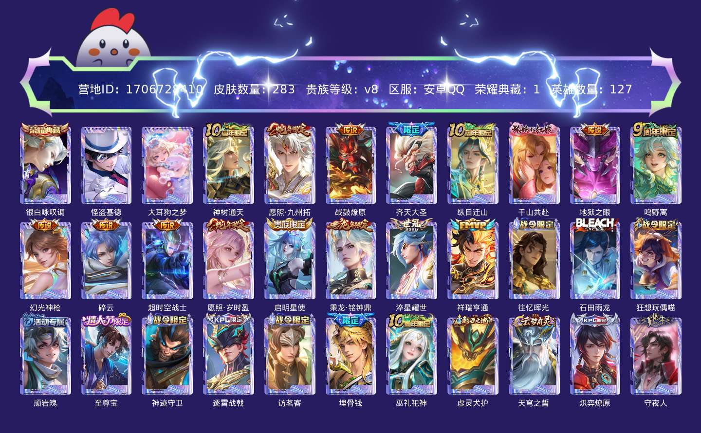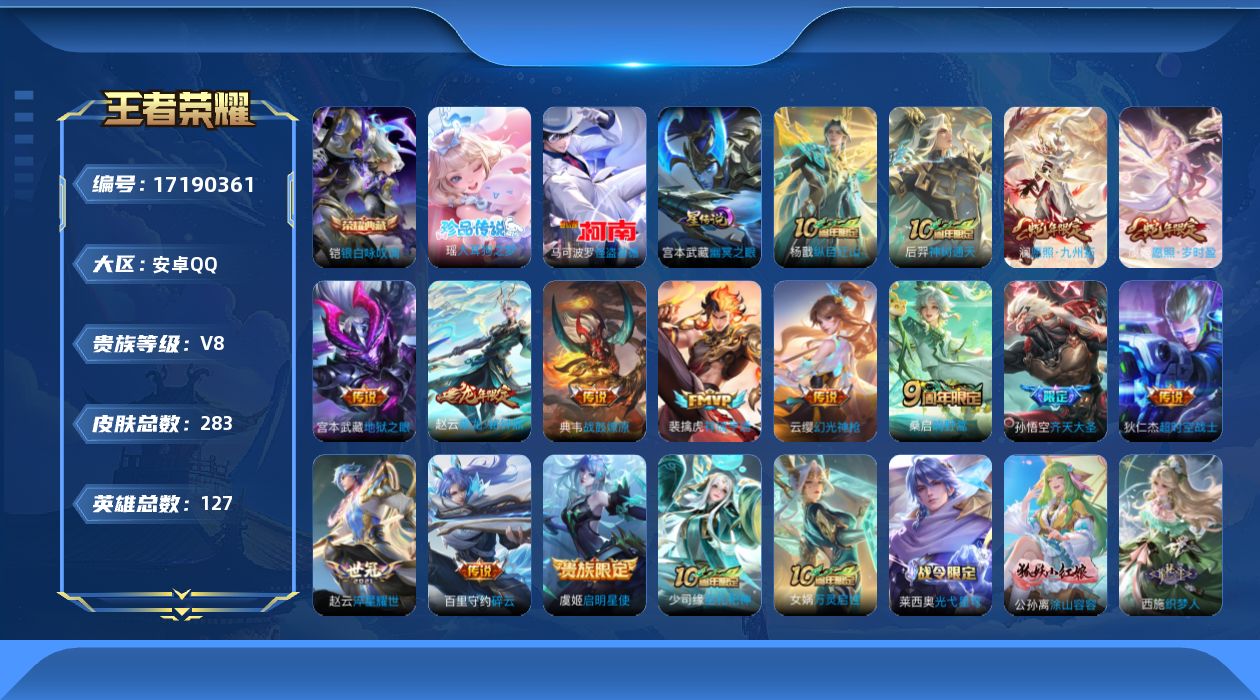 贵族等级:v8皮肤数:283传说品质16 生肖限定3 情人节限定1 珍品传说2 荣耀典藏1 英雄数:127