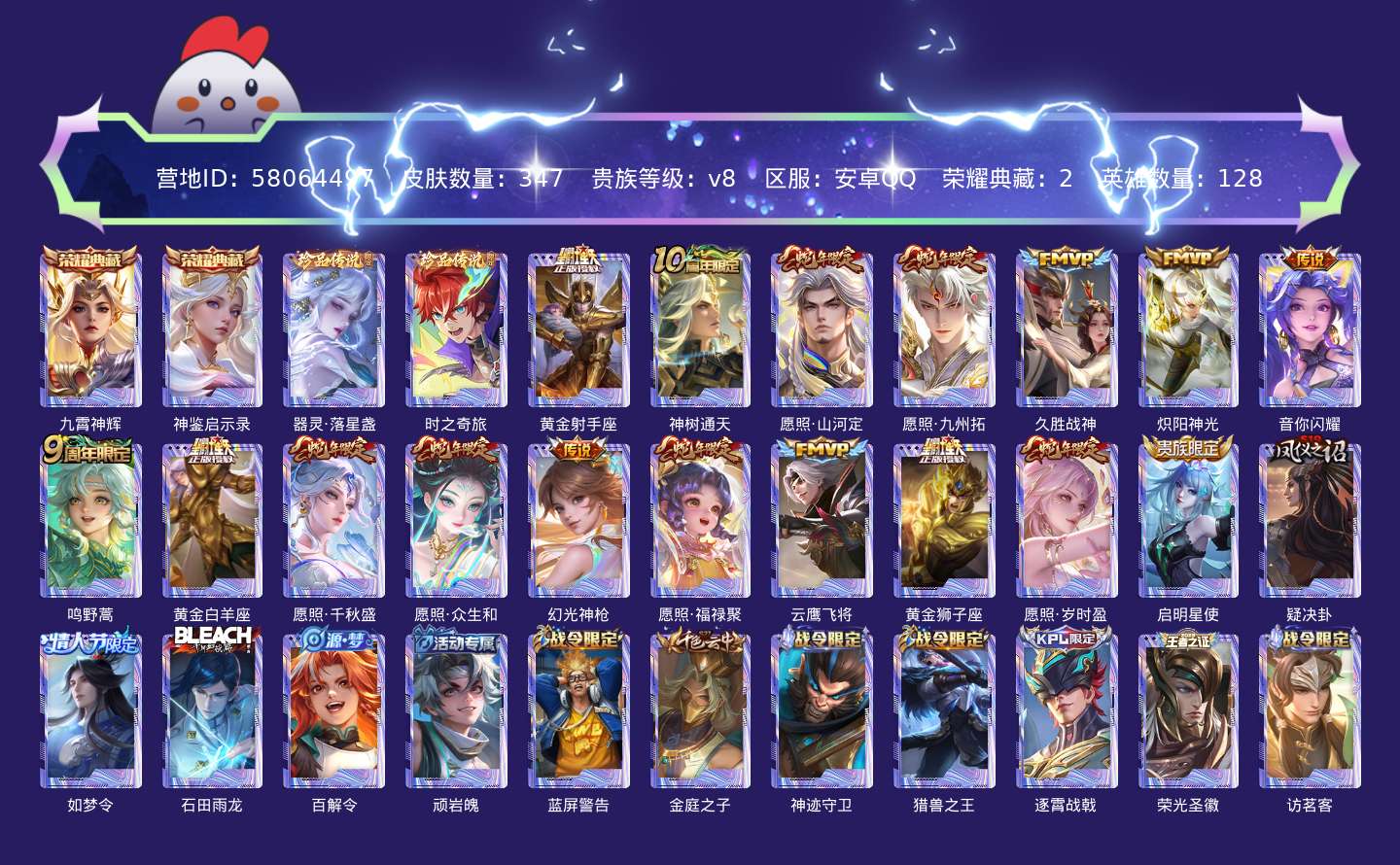 贵族等级:v8皮肤数:347传说品质17 情人节限定1 生肖限定10 荣耀典藏2 珍品传说2 英雄数:128