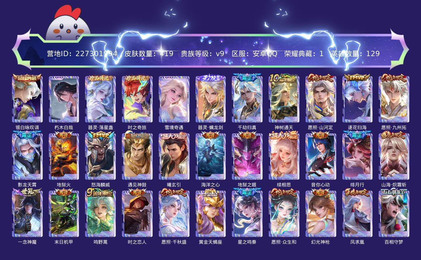贵族等级:v9皮肤数:419传说品质39 生肖限定14 情人节限定4 珍品传说3 无双2 荣耀典藏1 英雄数:129