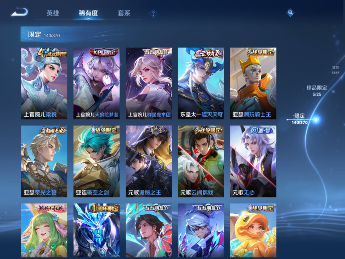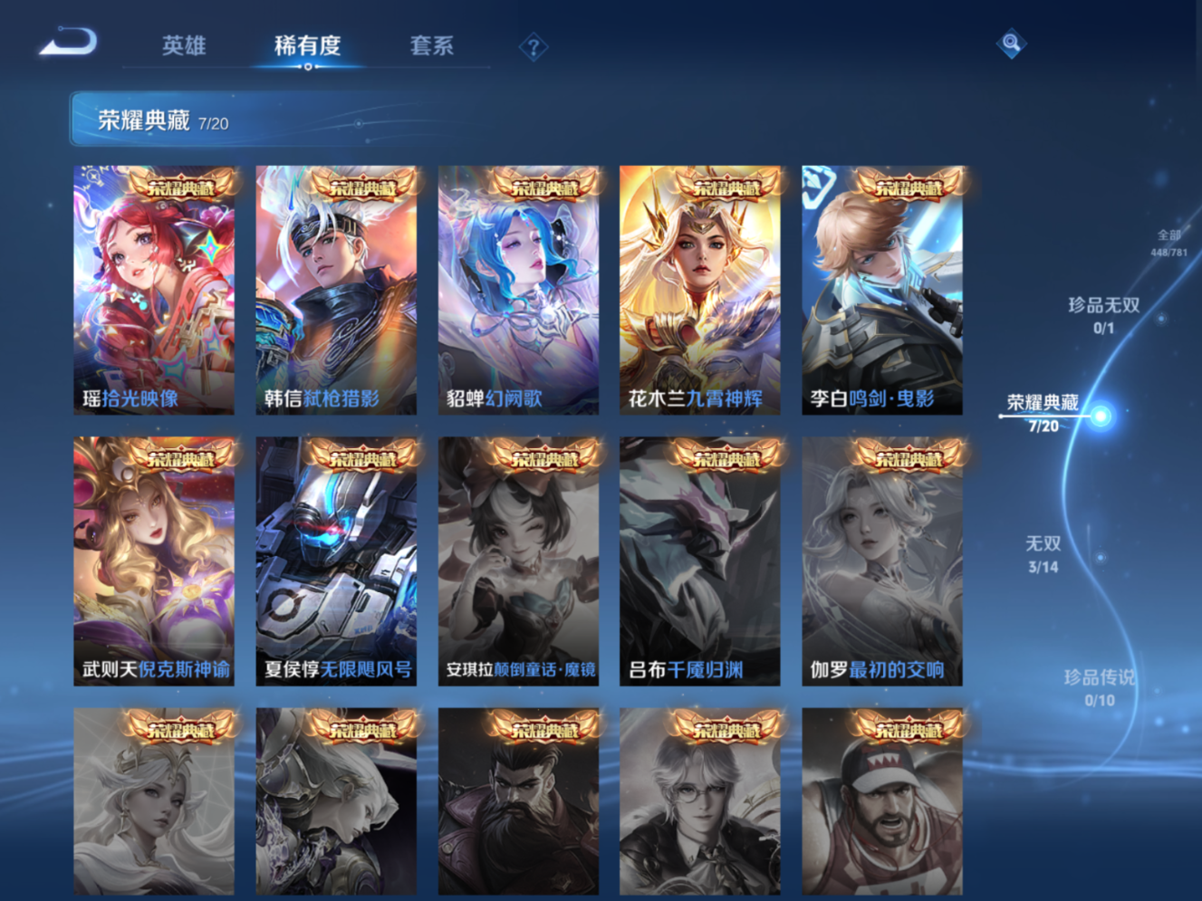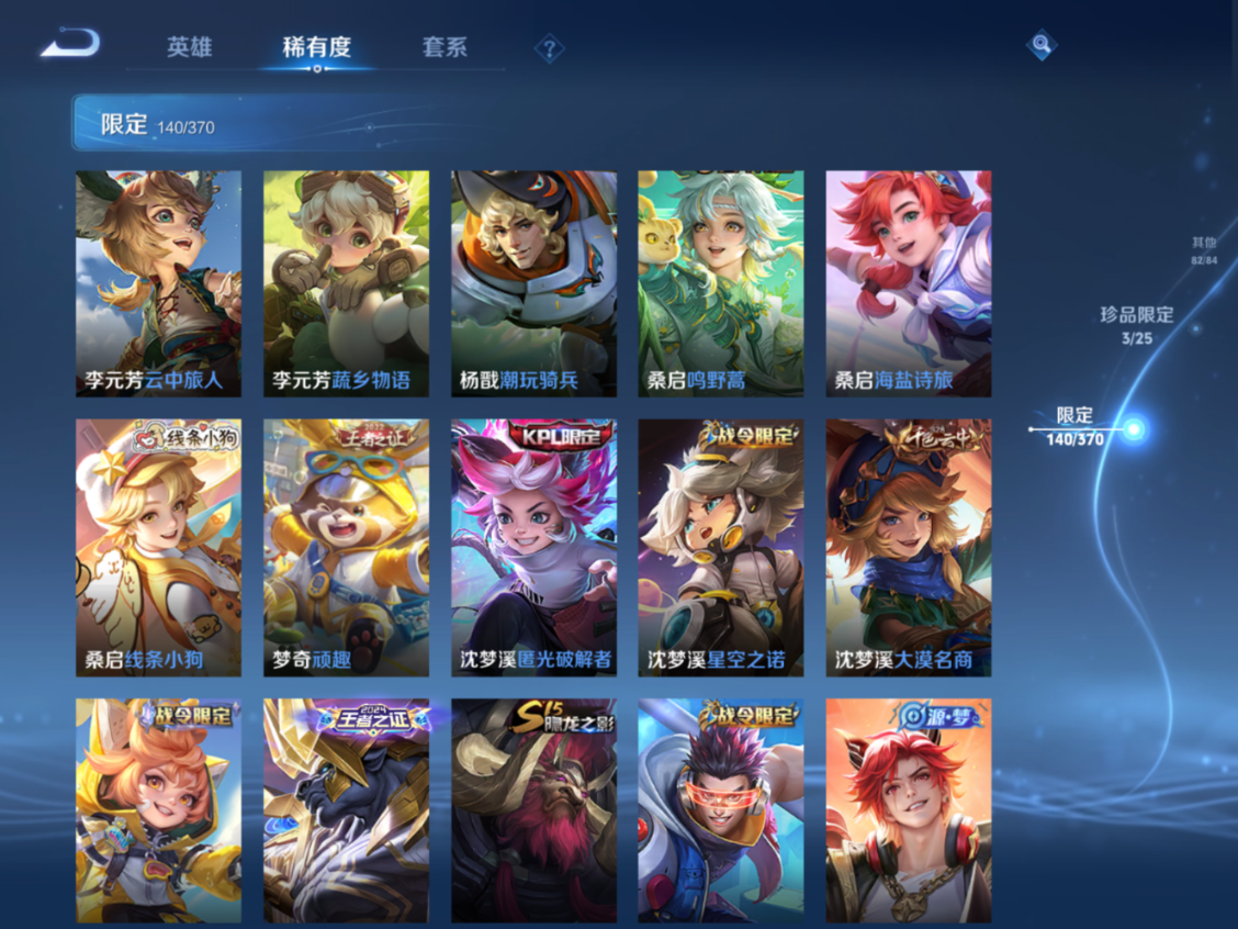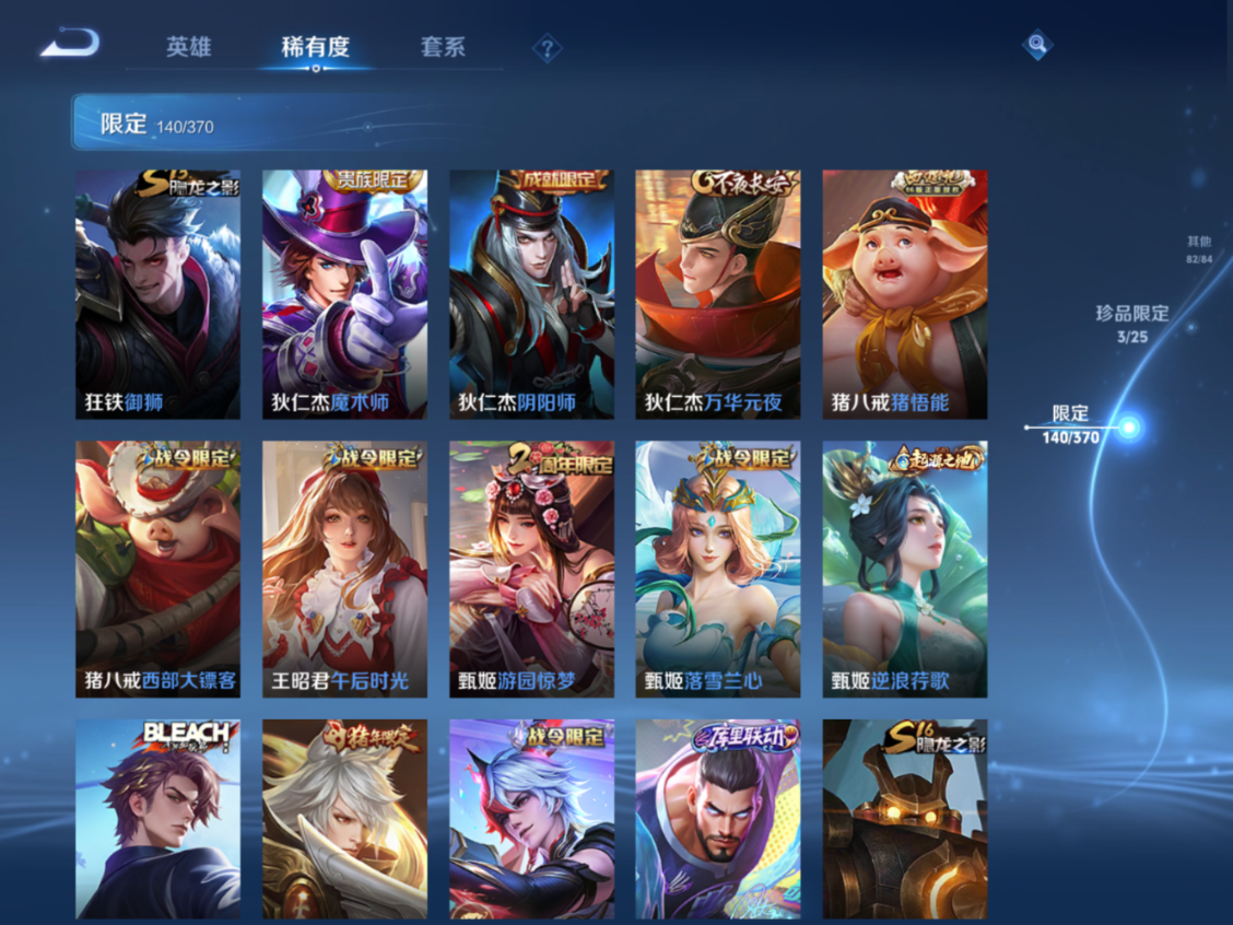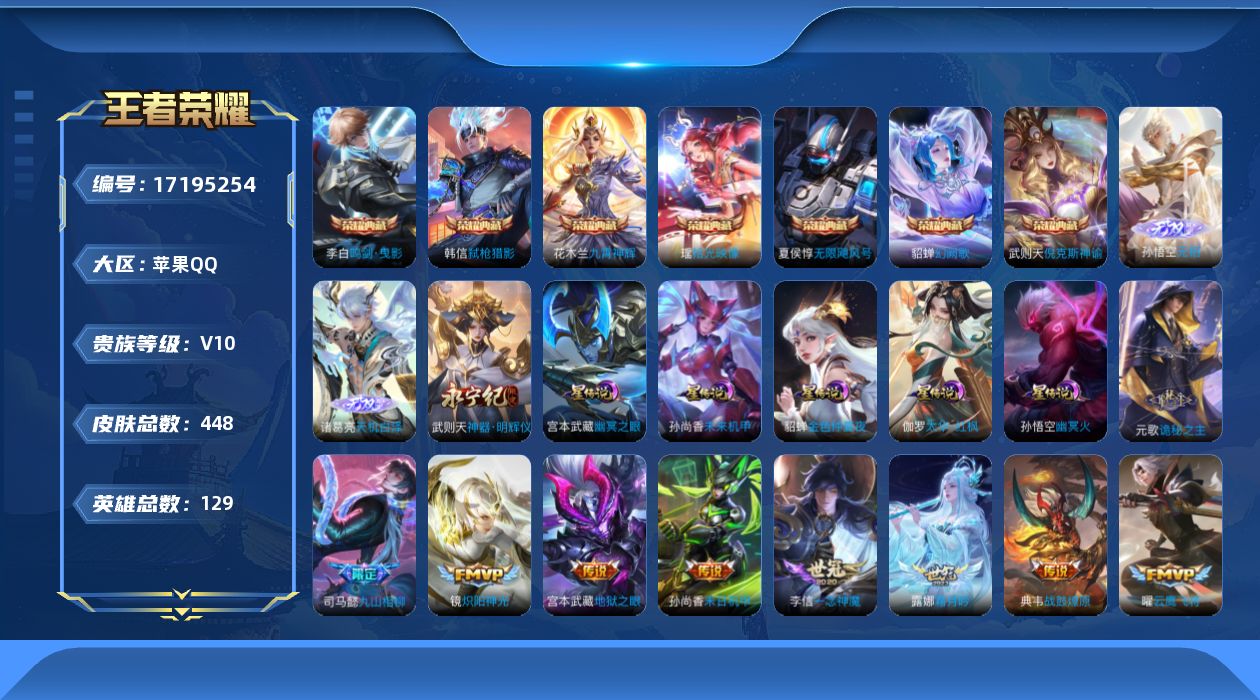 贵族等级:v10皮肤数:448生肖限定4 传说品质23 无双3 情人节限定1 荣耀典藏7 英雄数:129