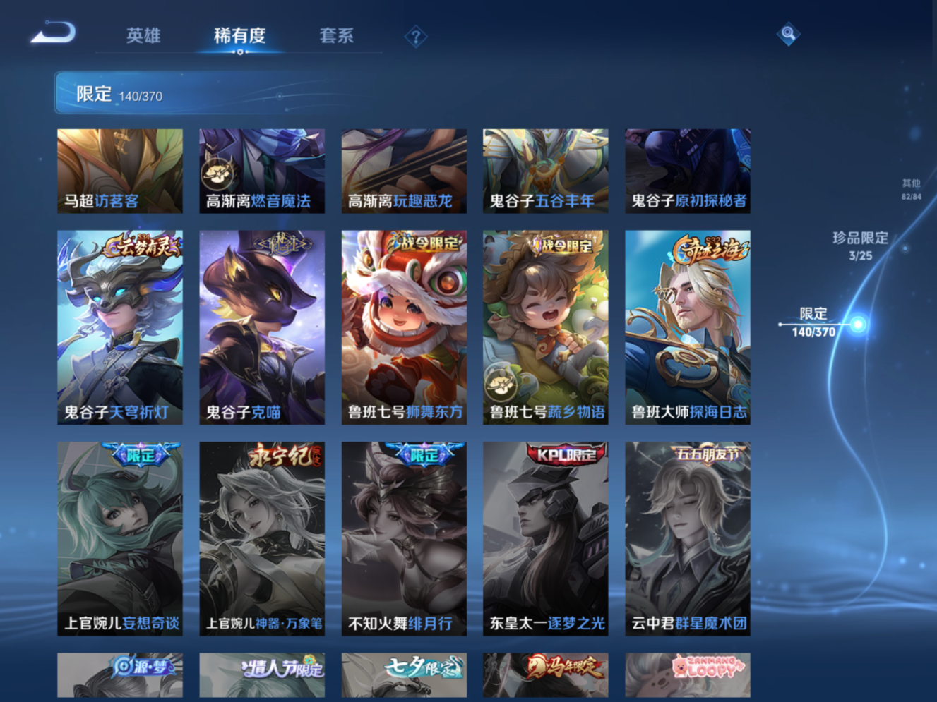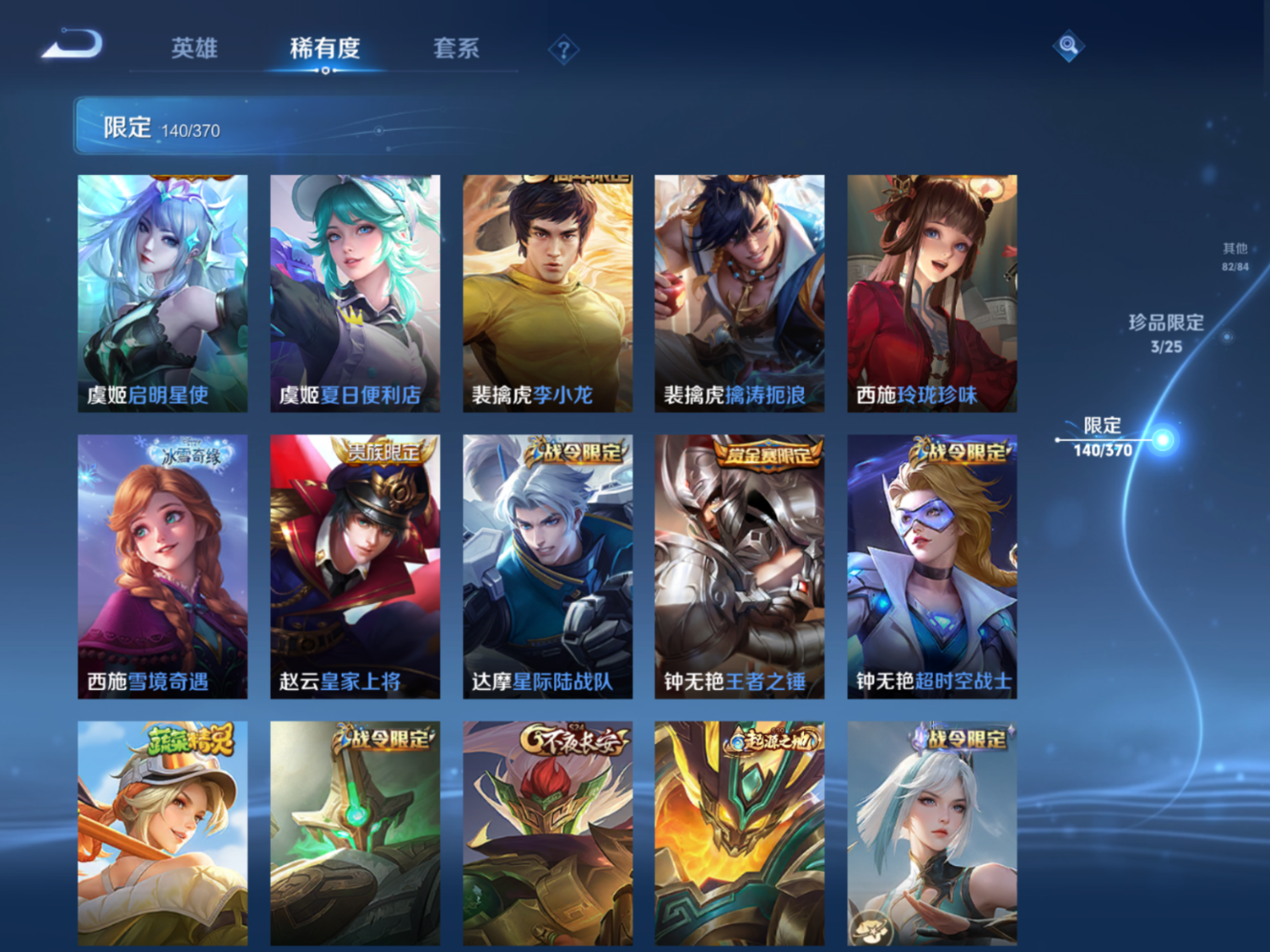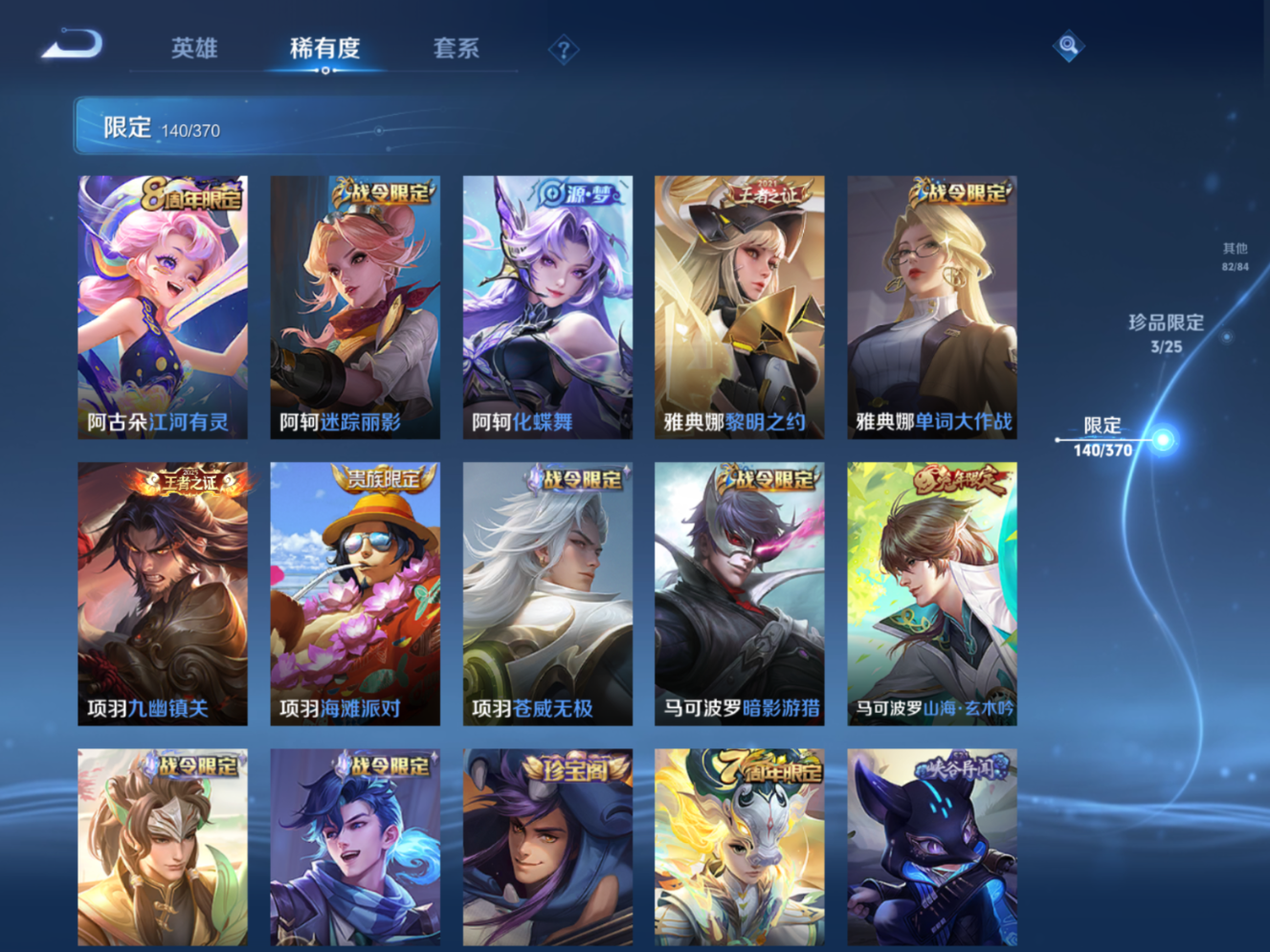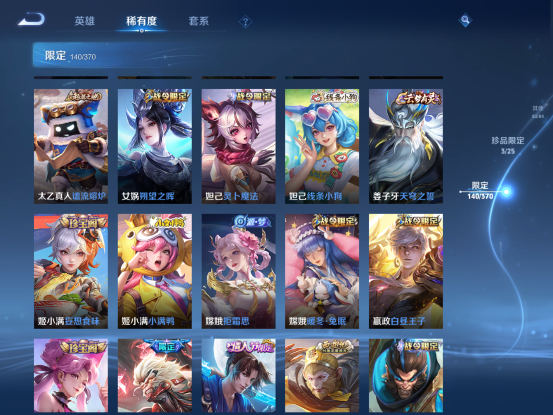 贵族等级:v10皮肤数:448生肖限定4 传说品质23 无双3 情人节限定1 荣耀典藏7 英雄数:129