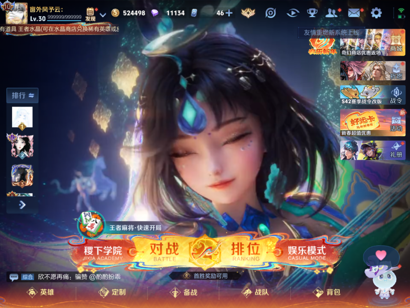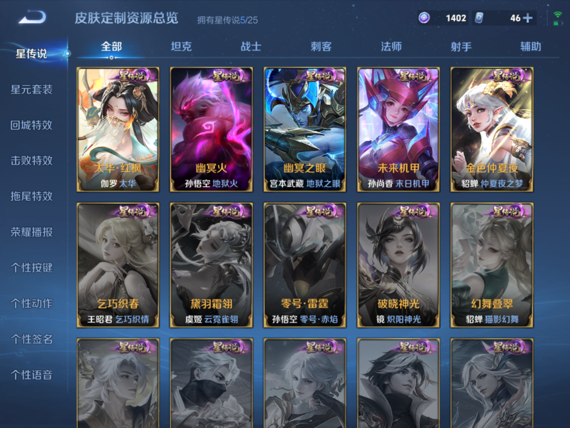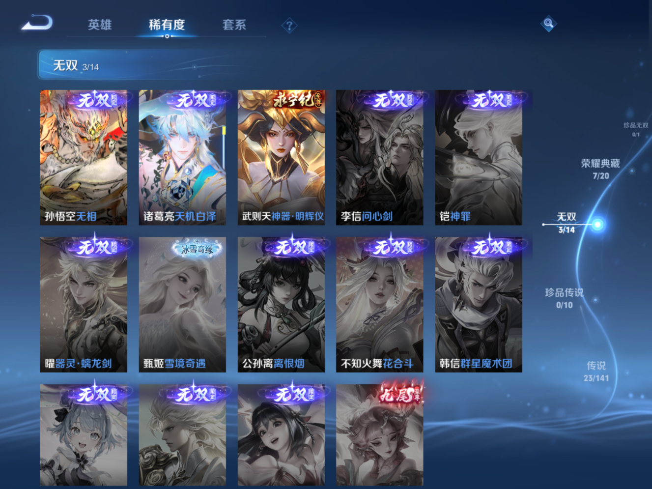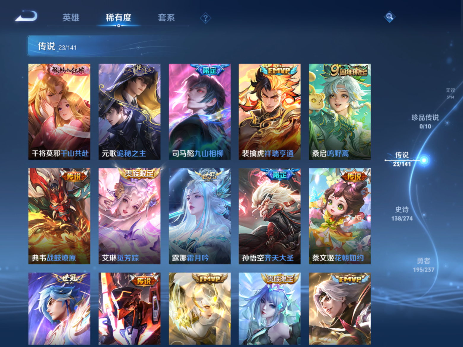 贵族等级:v10皮肤数:448生肖限定4 传说品质23 无双3 情人节限定1 荣耀典藏7 英雄数:129
