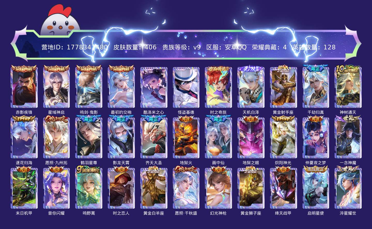 贵族等级:v9皮肤数:406传说品质26 荣耀典藏4 生肖限定4 无双1 情人节限定2 珍品传说3 英雄数:128