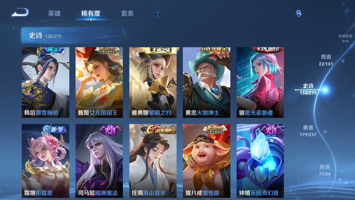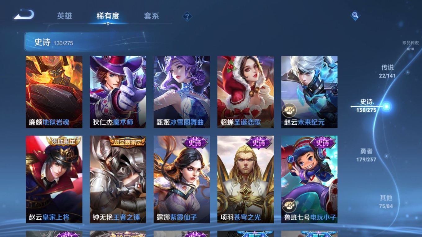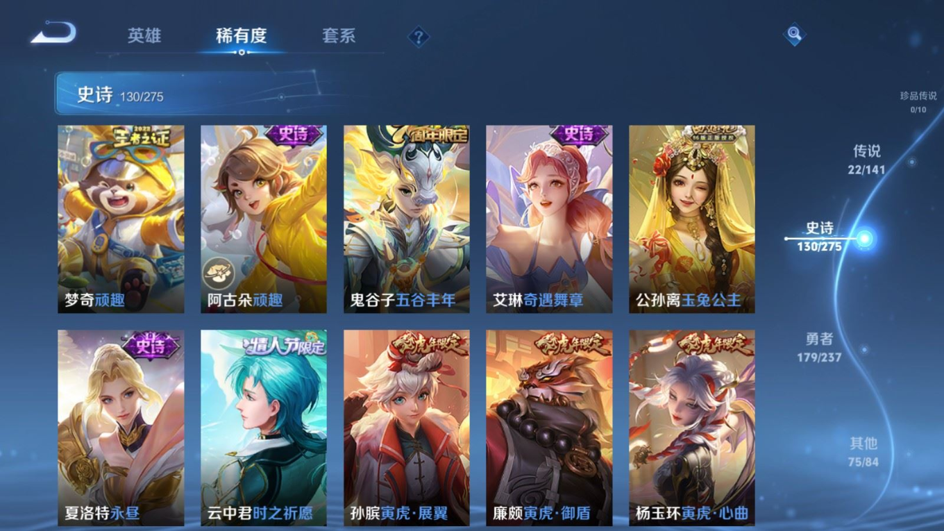 贵族等级:v8皮肤数:409生肖限定13 传说品质22 情人节限定6 荣耀典藏1 英雄数:128