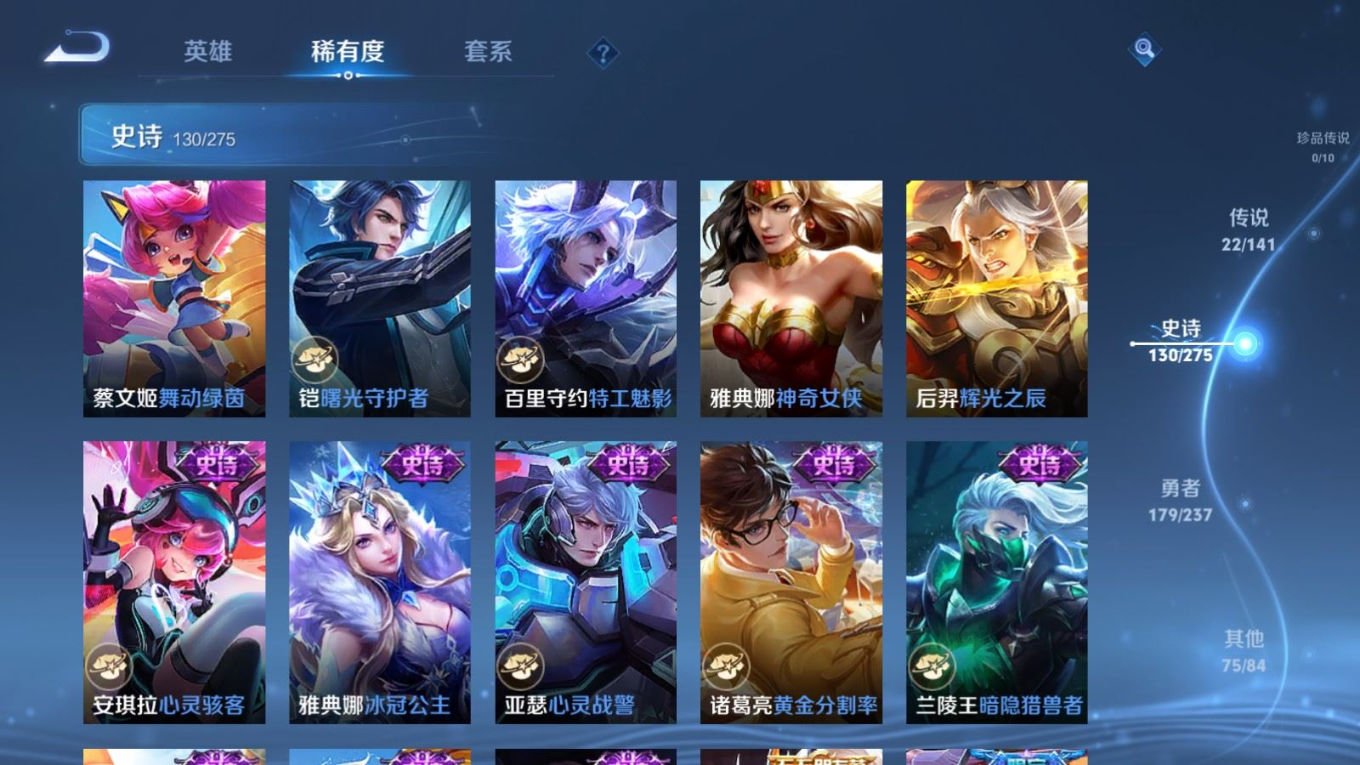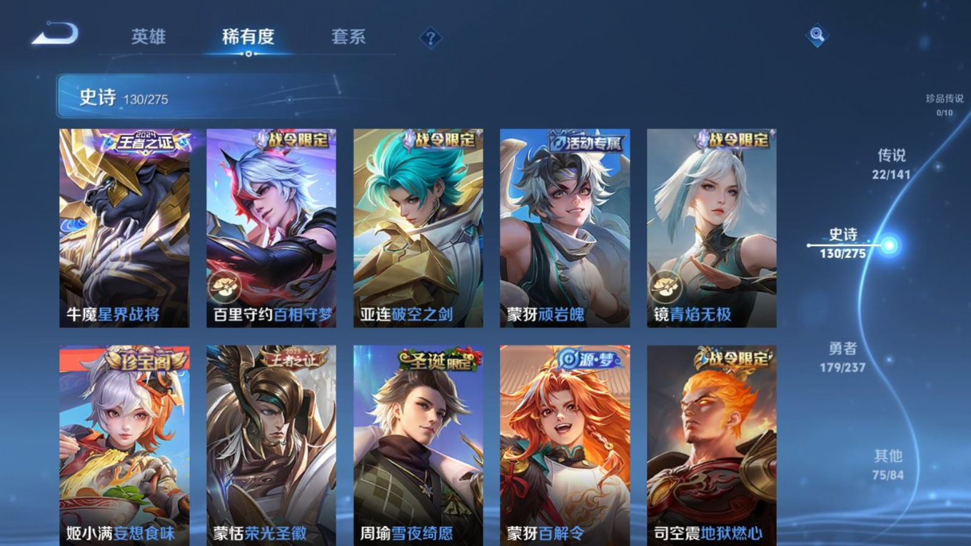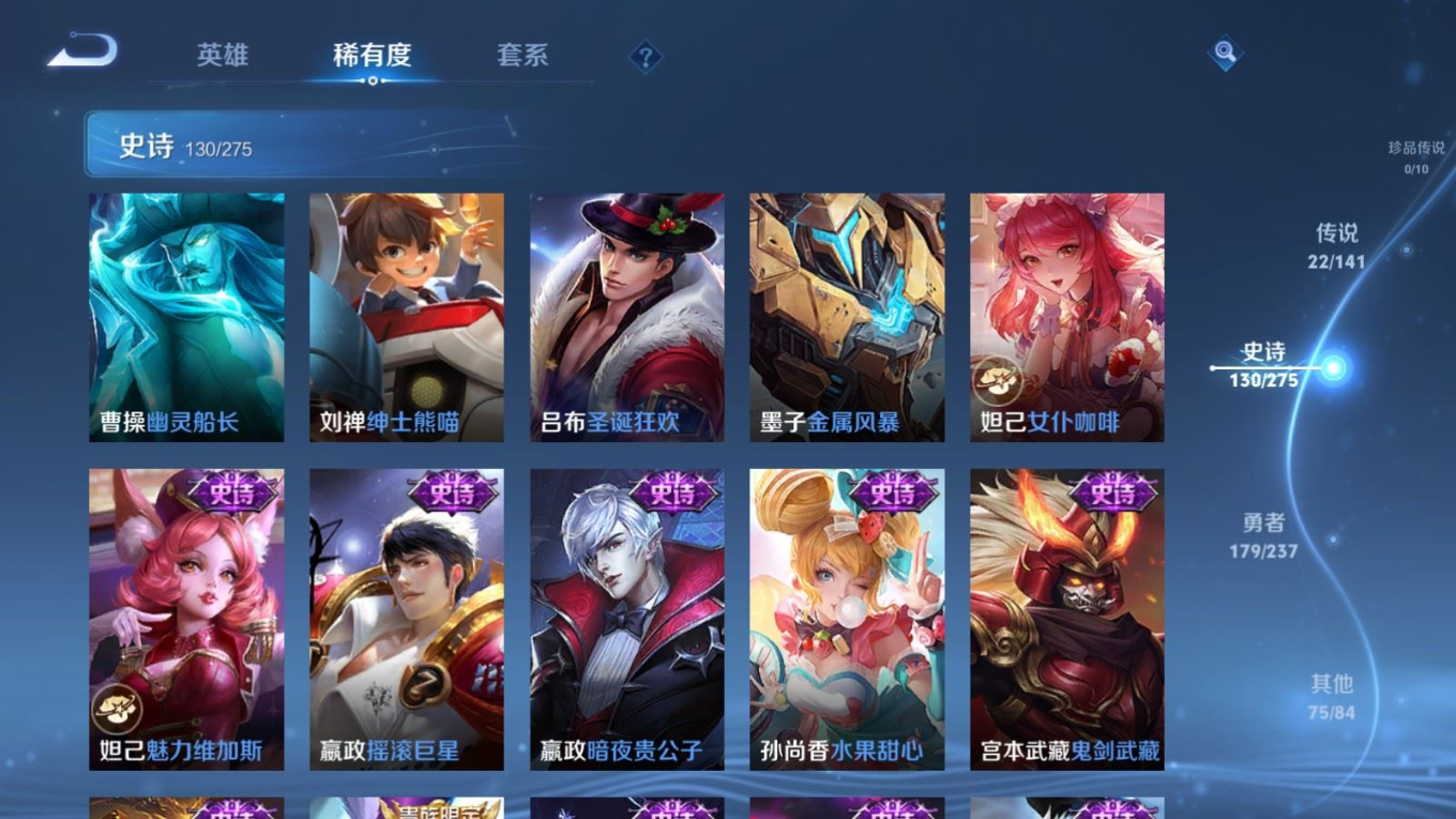 贵族等级:v8皮肤数:409生肖限定13 传说品质22 情人节限定6 荣耀典藏1 英雄数:128