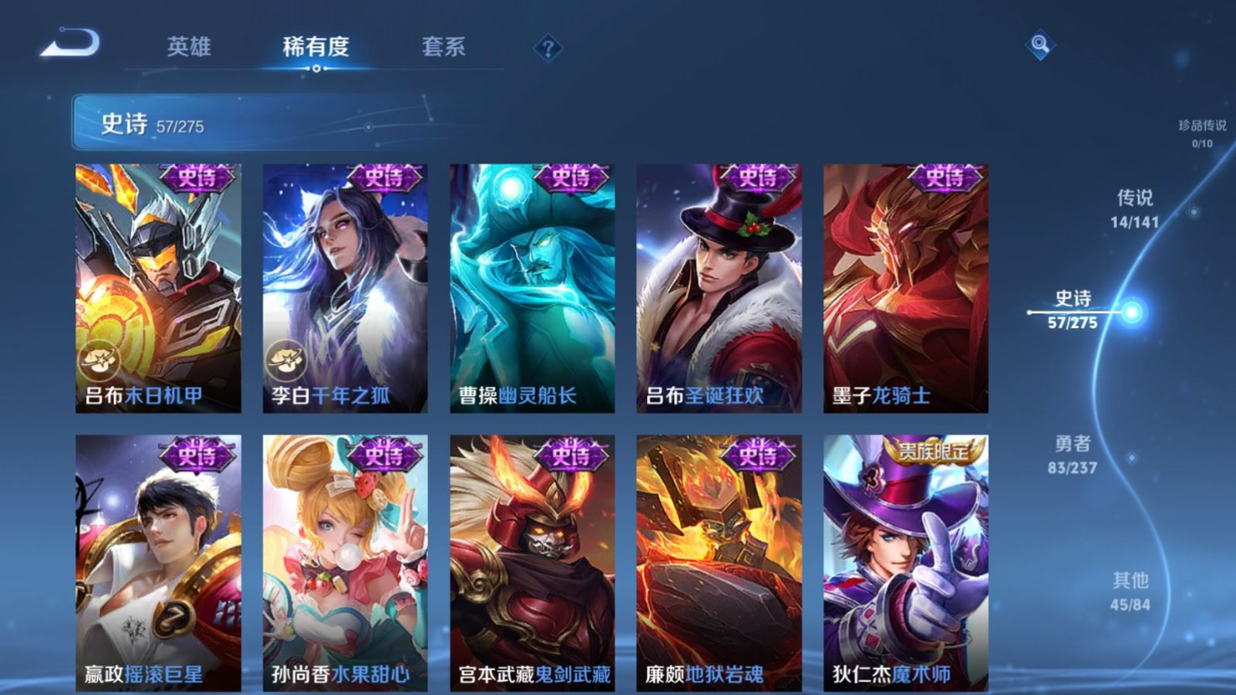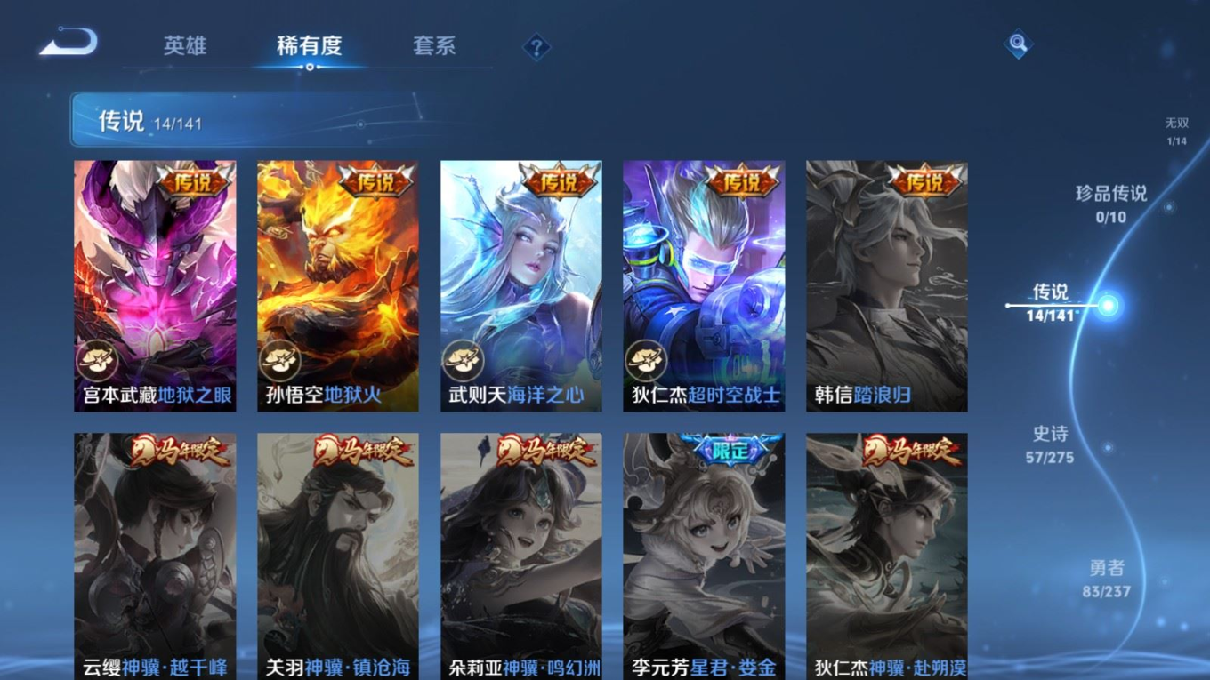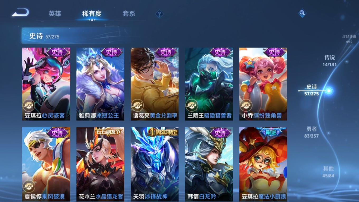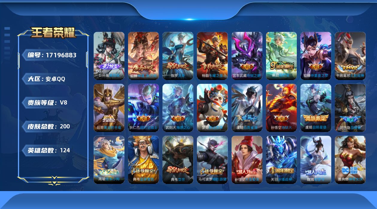 贵族等级:v8皮肤数:200传说品质14 情人节限定3 生肖限定7 无双1 英雄数:124