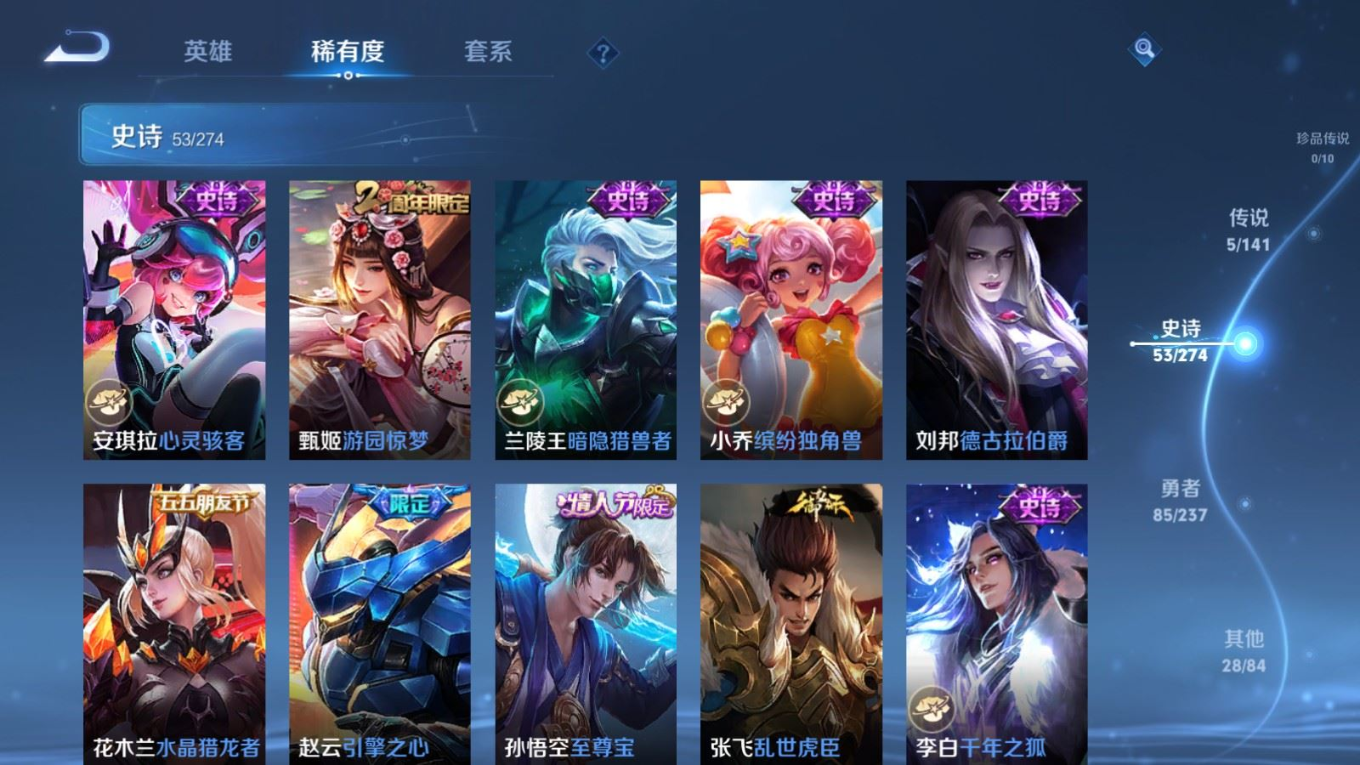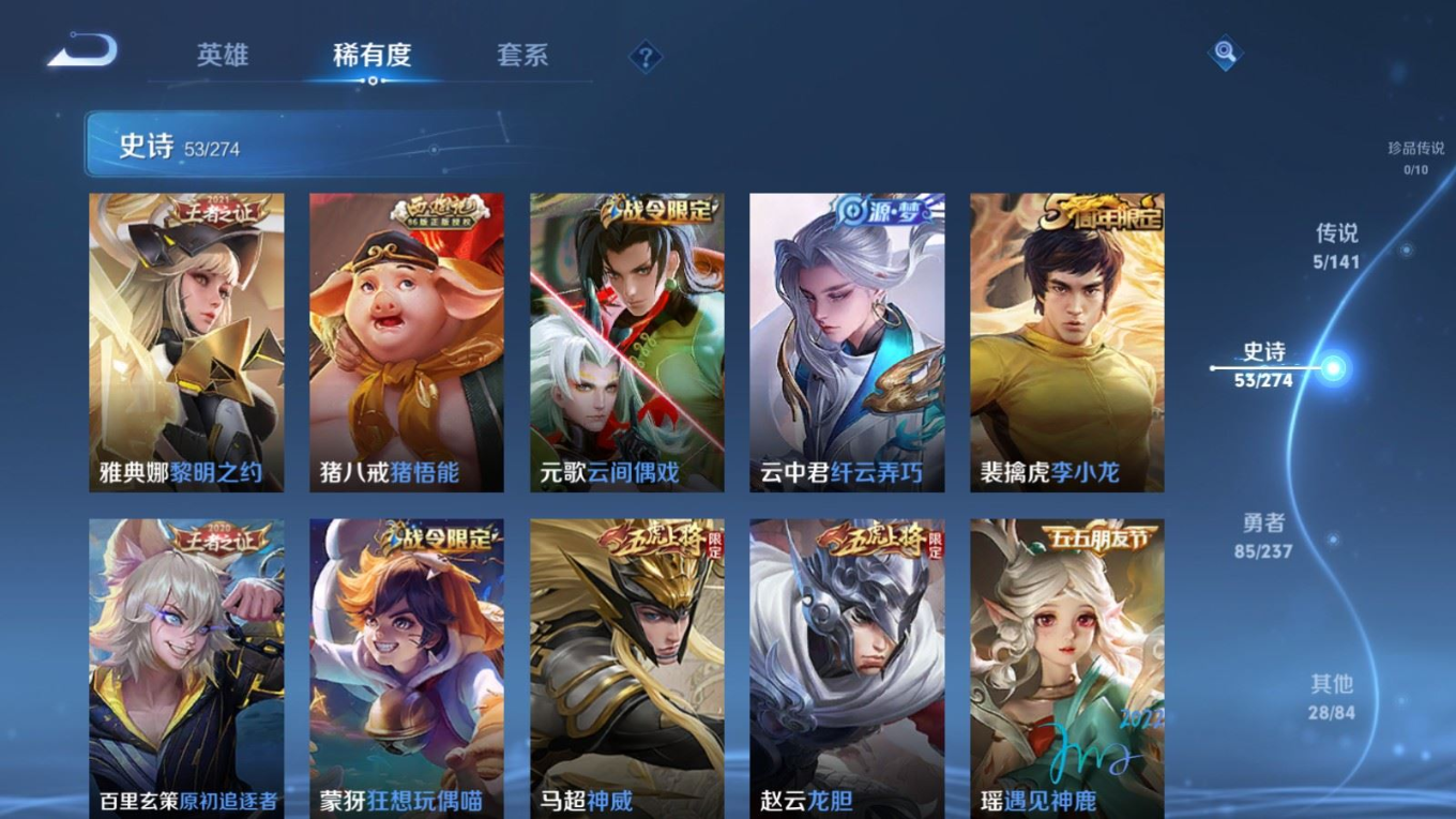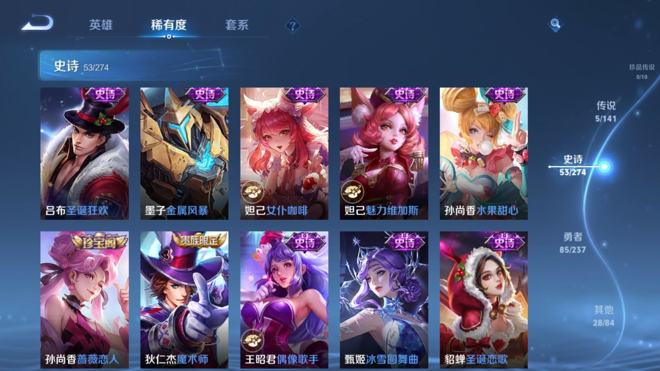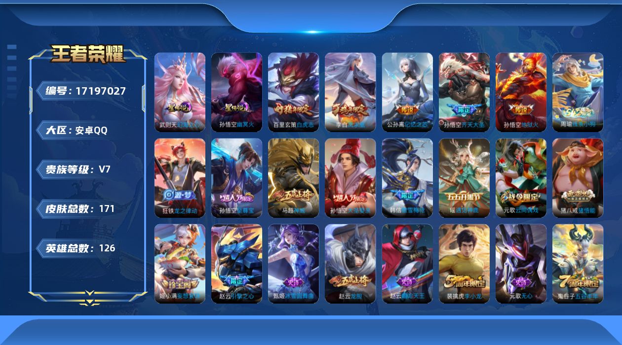 贵族等级:v7皮肤数:172情人节限定2 传说品质5 生肖限定2 英雄数:126