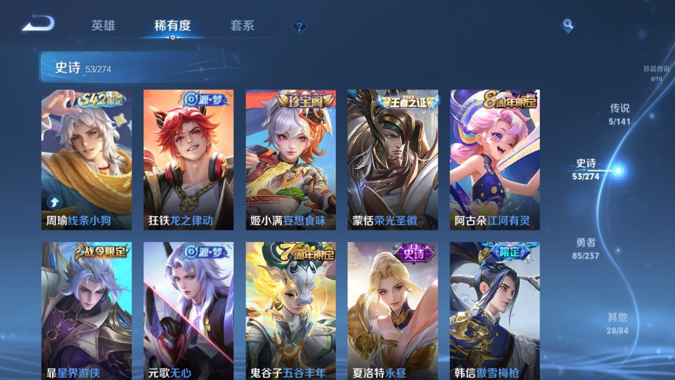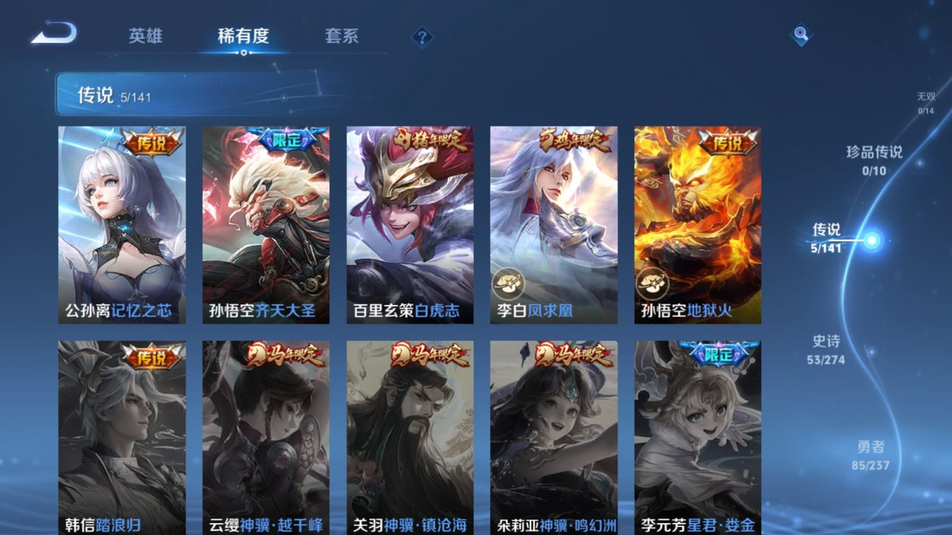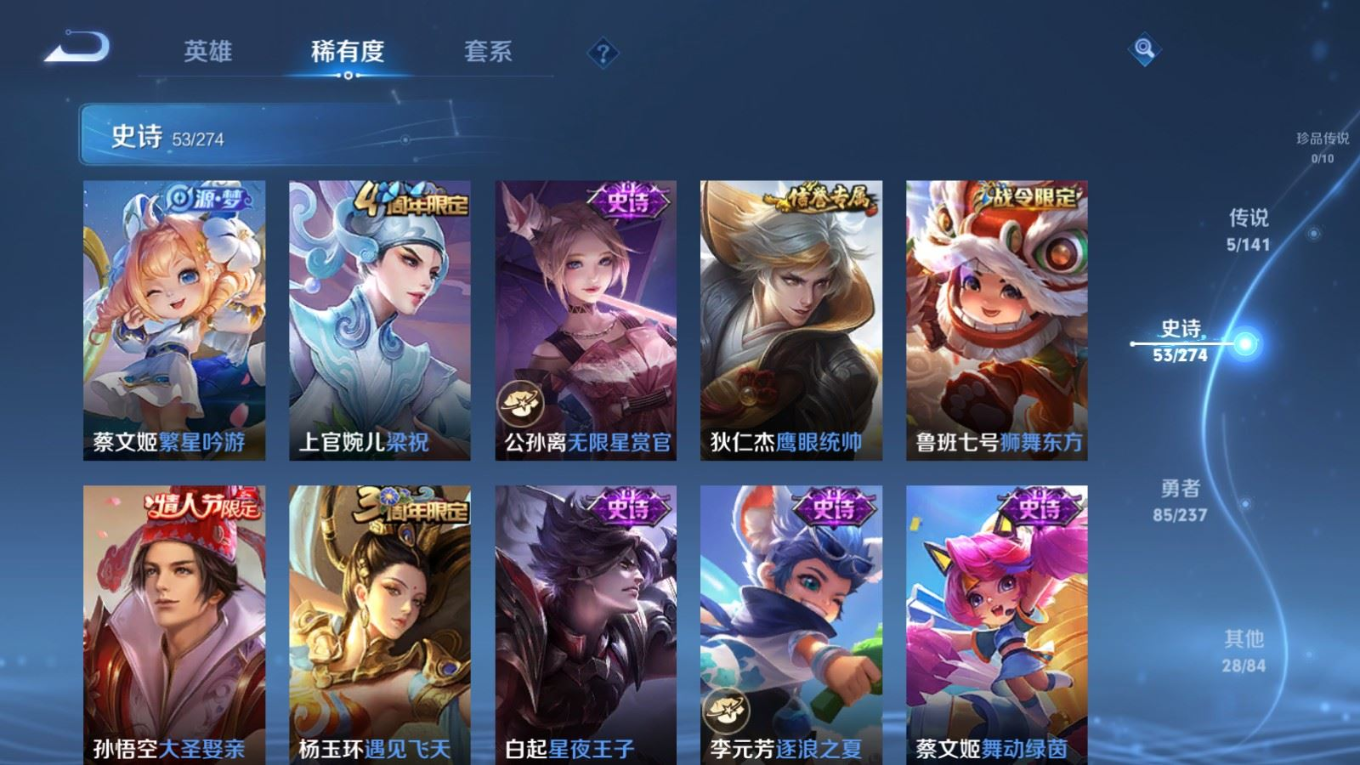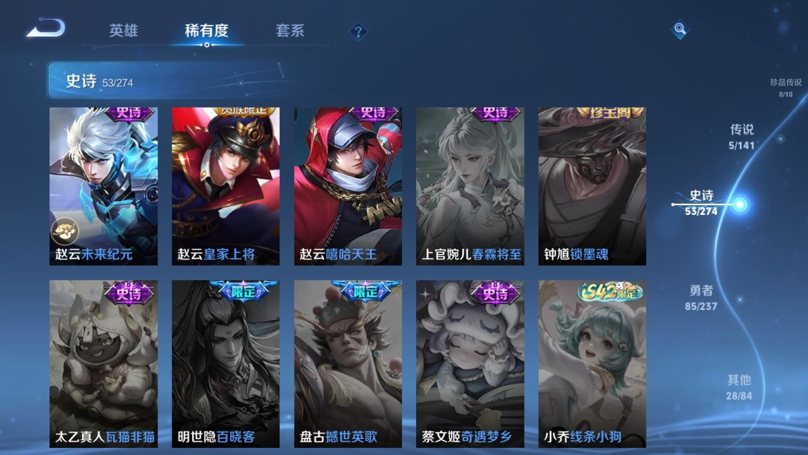 贵族等级:v7皮肤数:172情人节限定2 传说品质5 生肖限定2 英雄数:126
