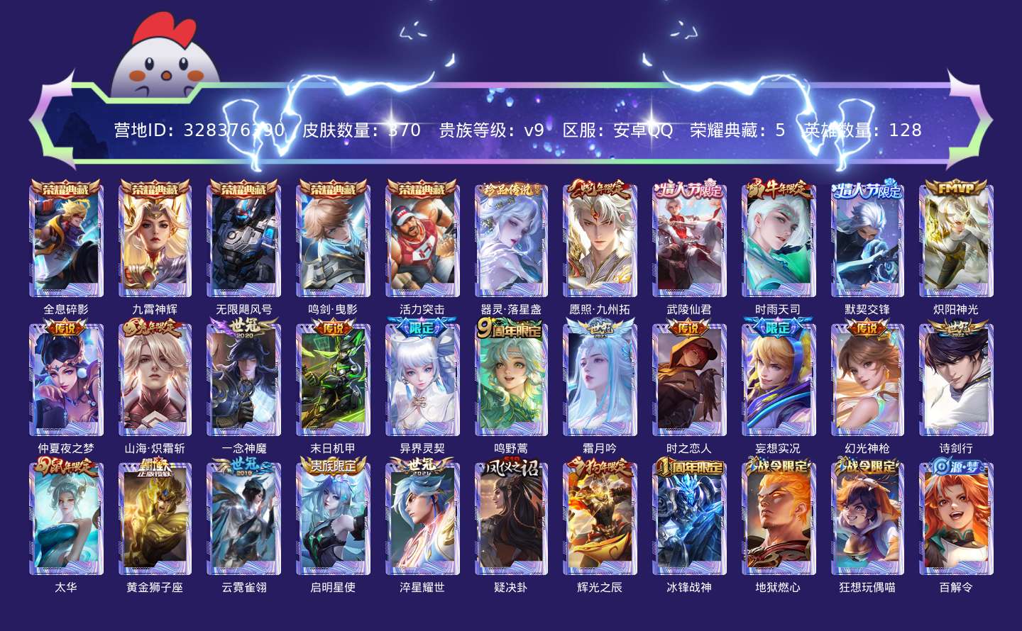 贵族等级:v9皮肤数:370生肖限定12 传说品质21 情人节限定5 荣耀典藏5 珍品传说1 英雄数:128