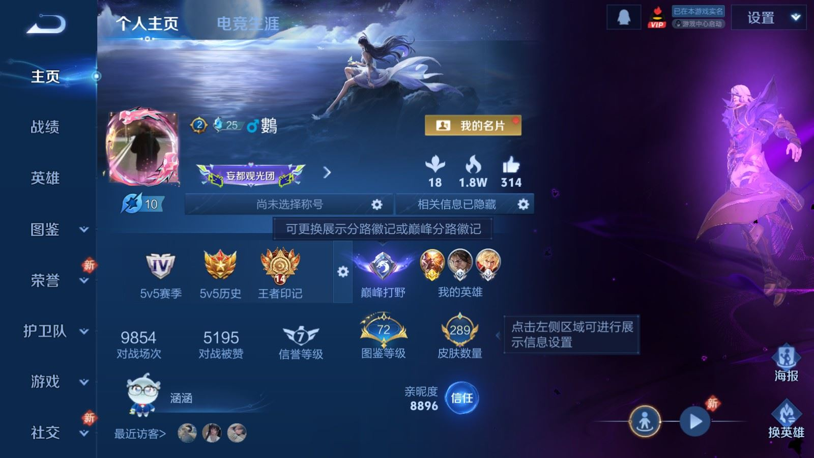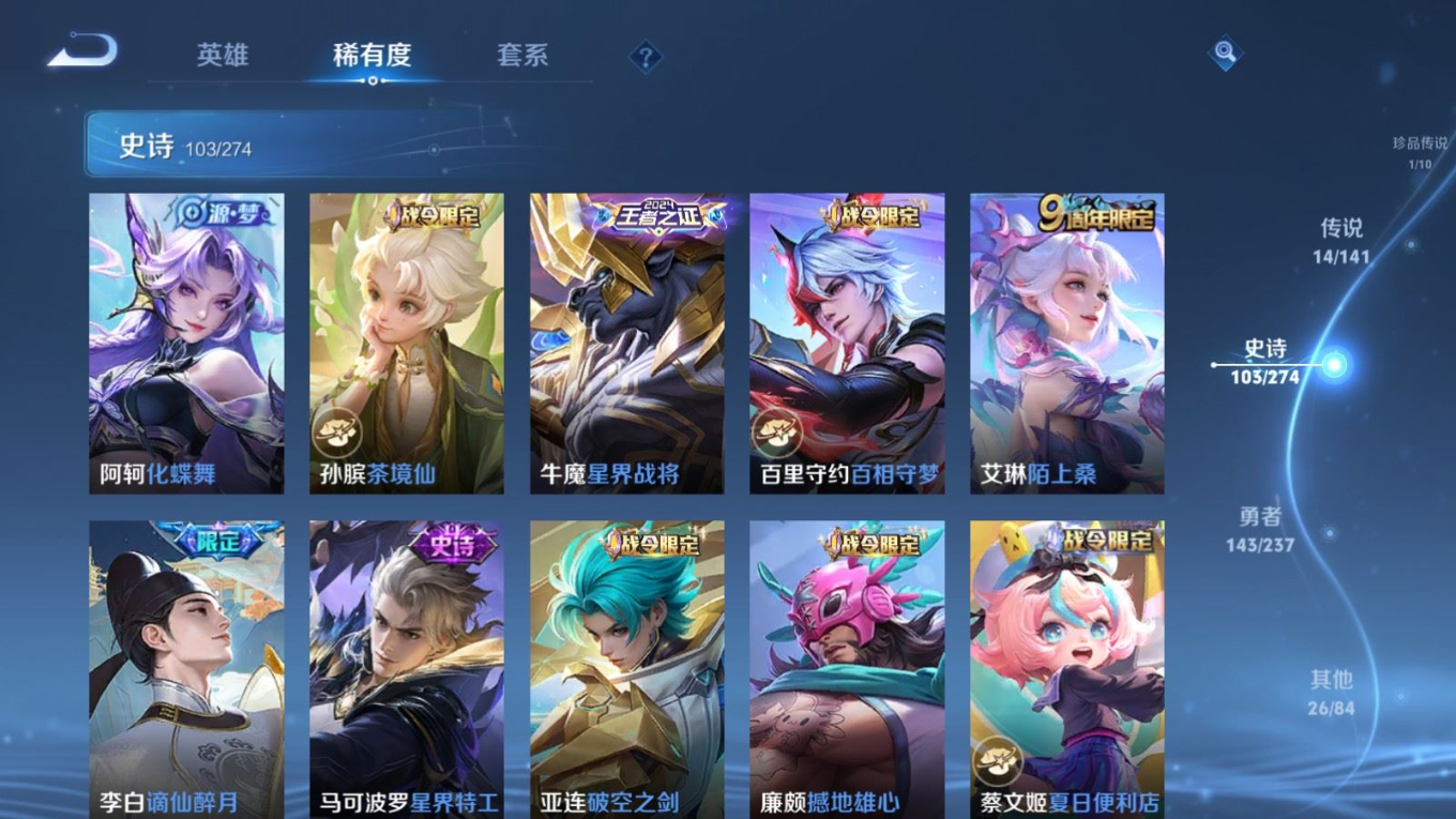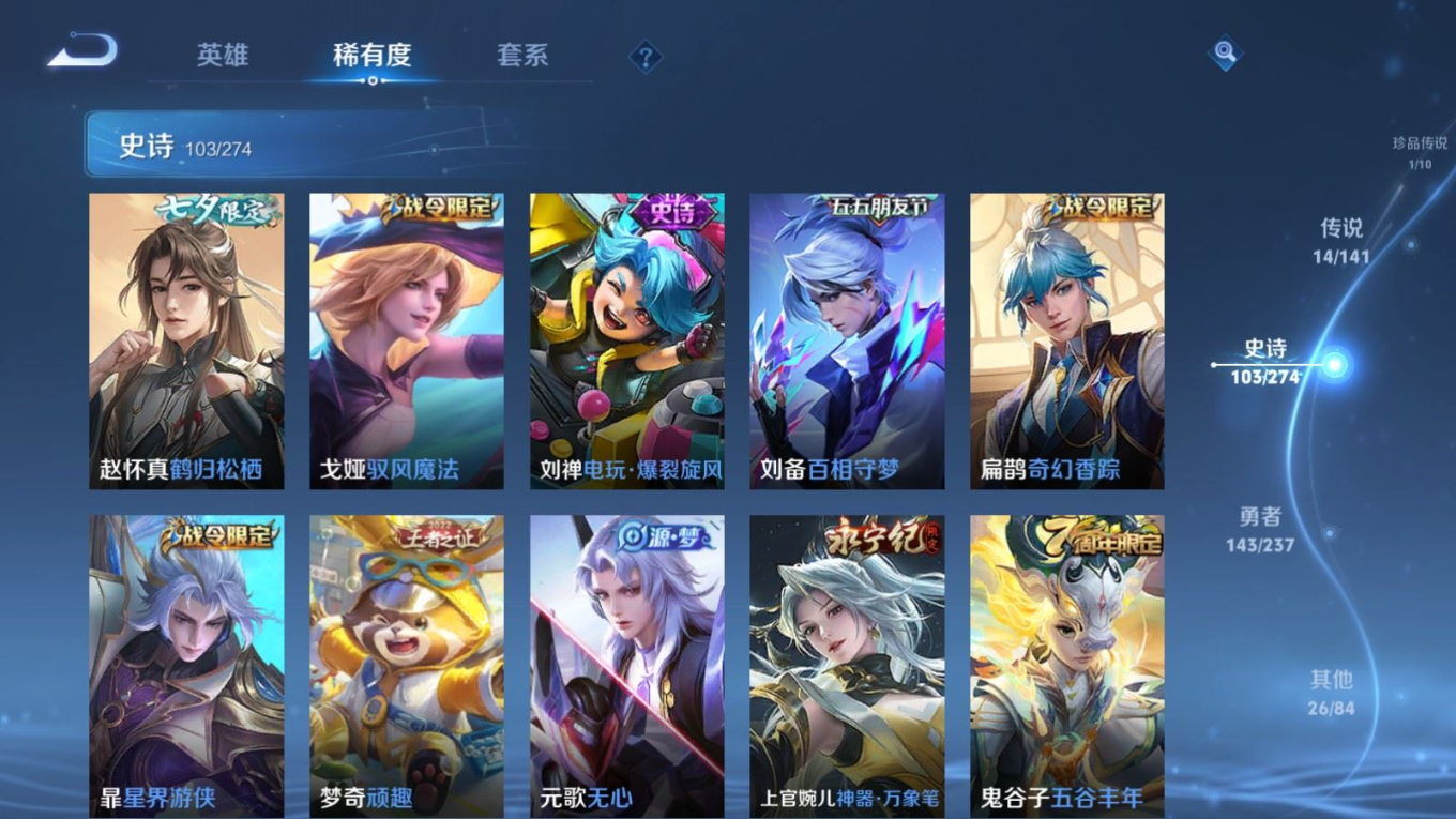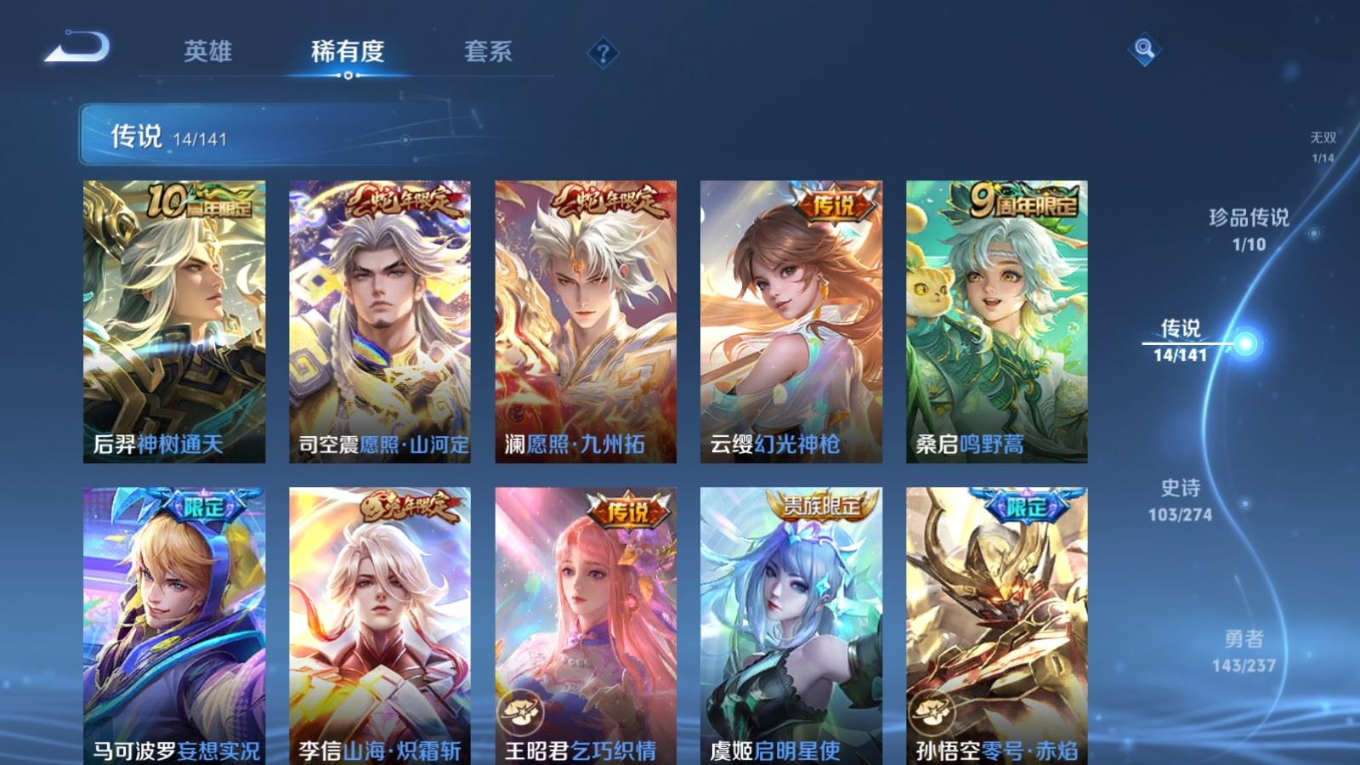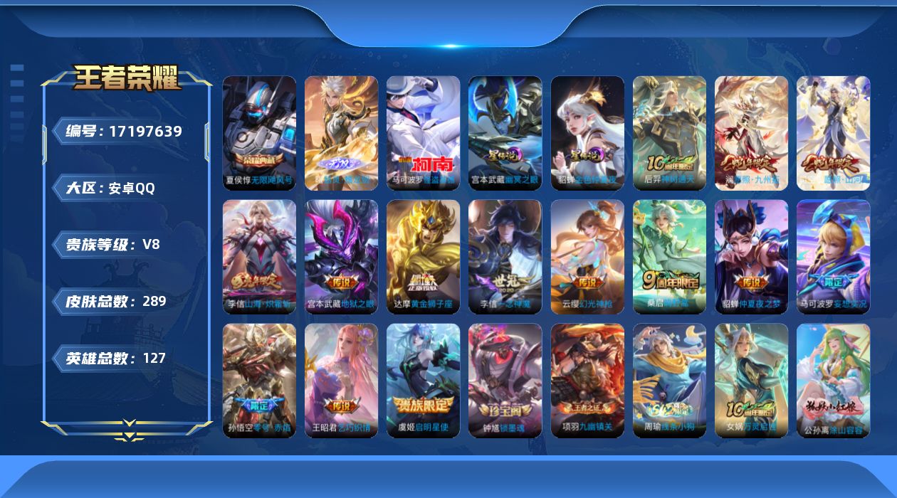 贵族等级:v8皮肤数:298传说品质14 生肖限定4 情人节限定2 荣耀典藏1 珍品传说1 无双1 英雄数:127