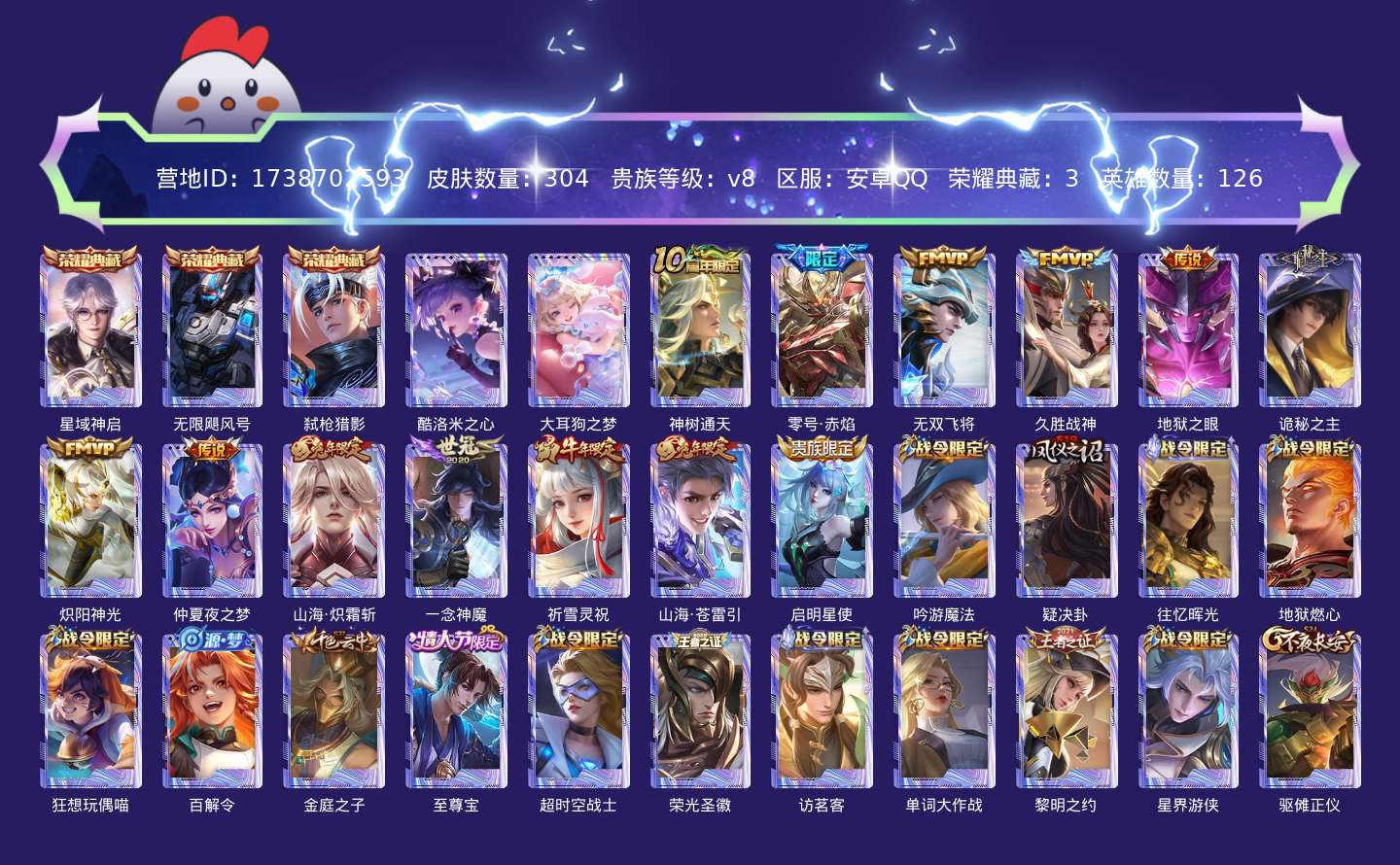 贵族等级:v8皮肤数:304传说品质13 荣耀典藏3 情人节限定1 生肖限定4 珍品传说2 英雄数:126