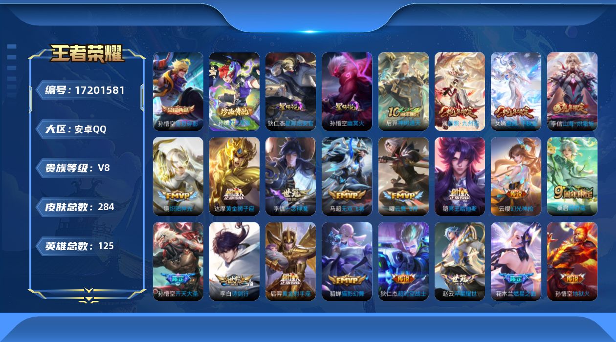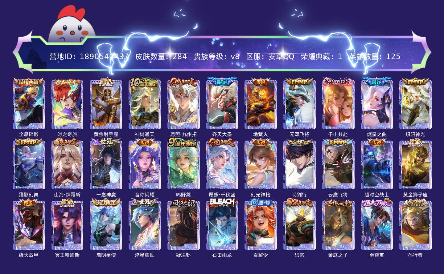 贵族等级:v8皮肤数:284传说品质24 生肖限定7 情人节限定1 荣耀典藏1 珍品传说1 英雄数:125