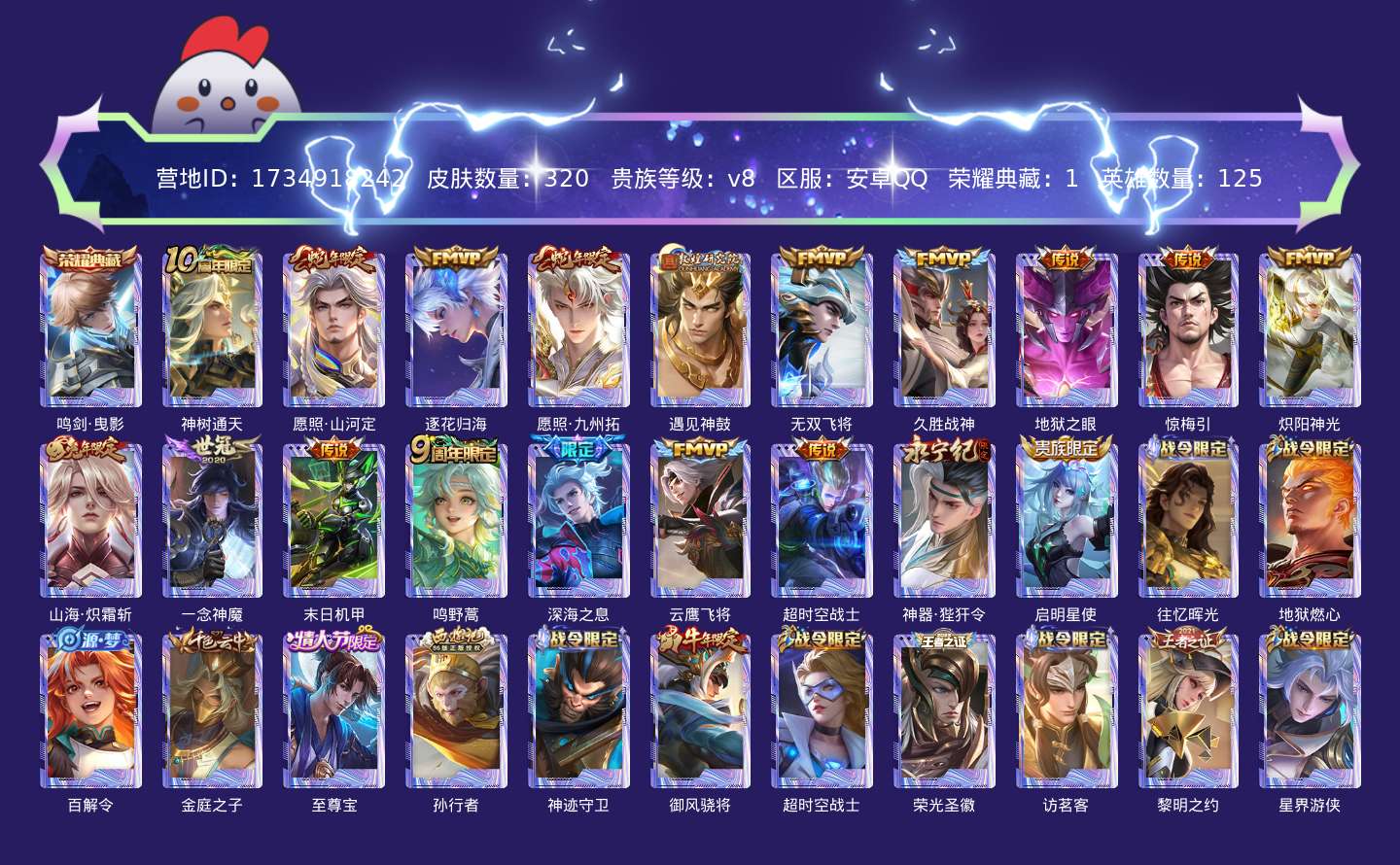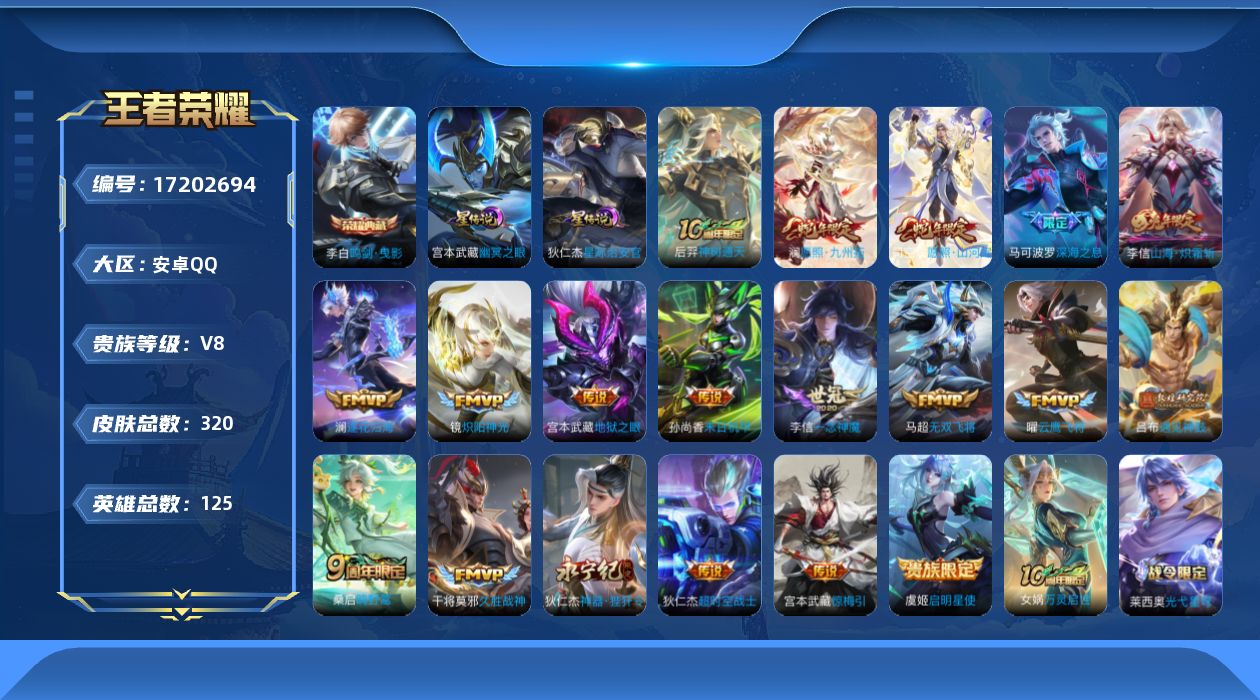 贵族等级:v8皮肤数:320传说品质19 生肖限定6 情人节限定1 荣耀典藏1 英雄数:125