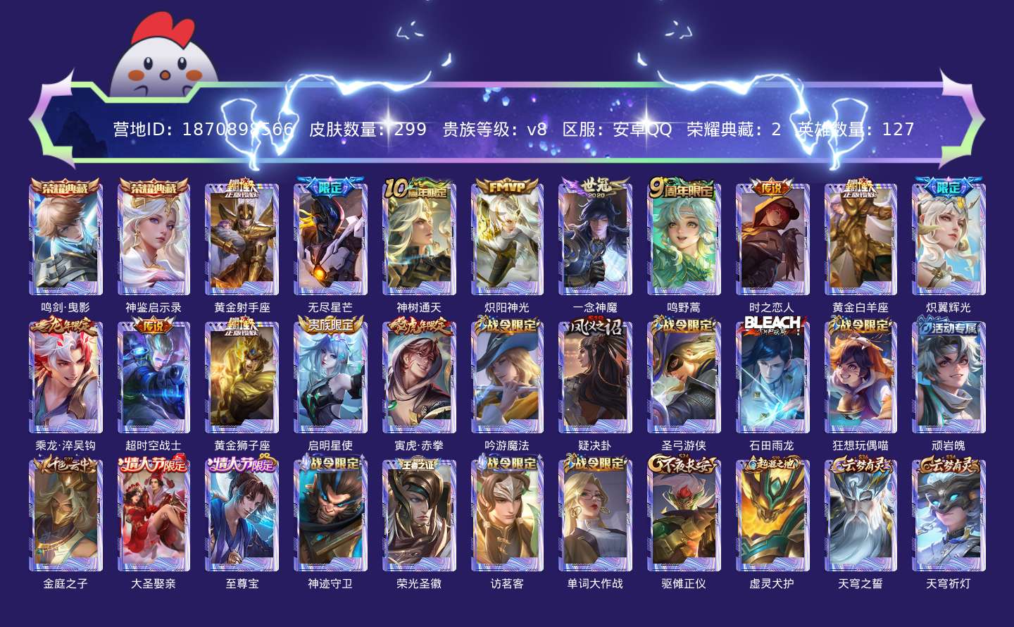 贵族等级:v8皮肤数:299传说品质14 情人节限定2 生肖限定5 荣耀典藏2 英雄数:127
