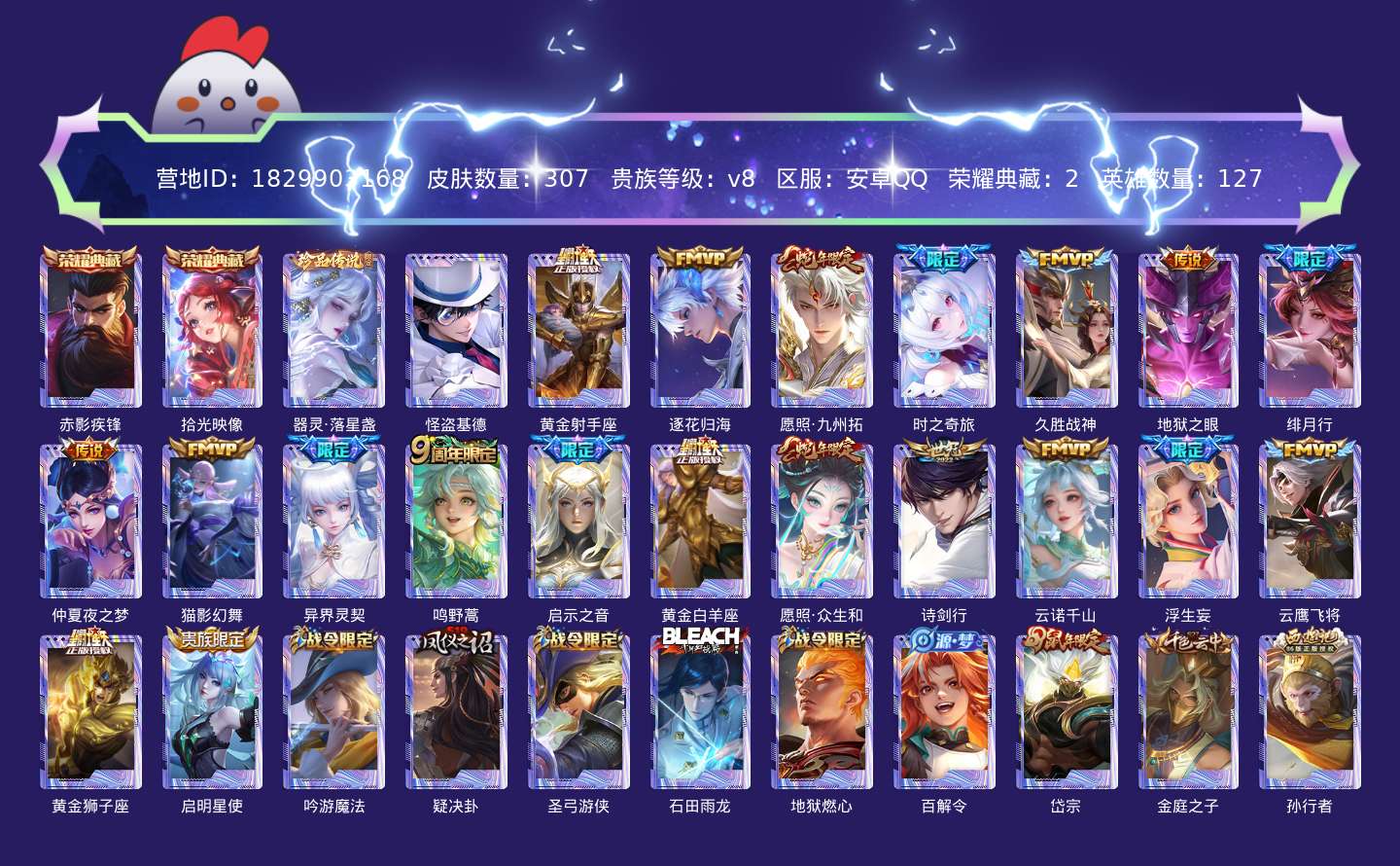 贵族等级:v8皮肤数:307传说品质20 荣耀典藏2 生肖限定5 情人节限定1 珍品传说2 英雄数:127