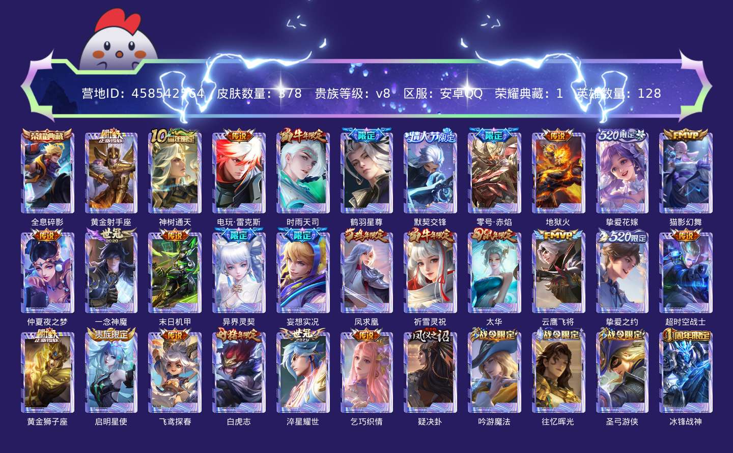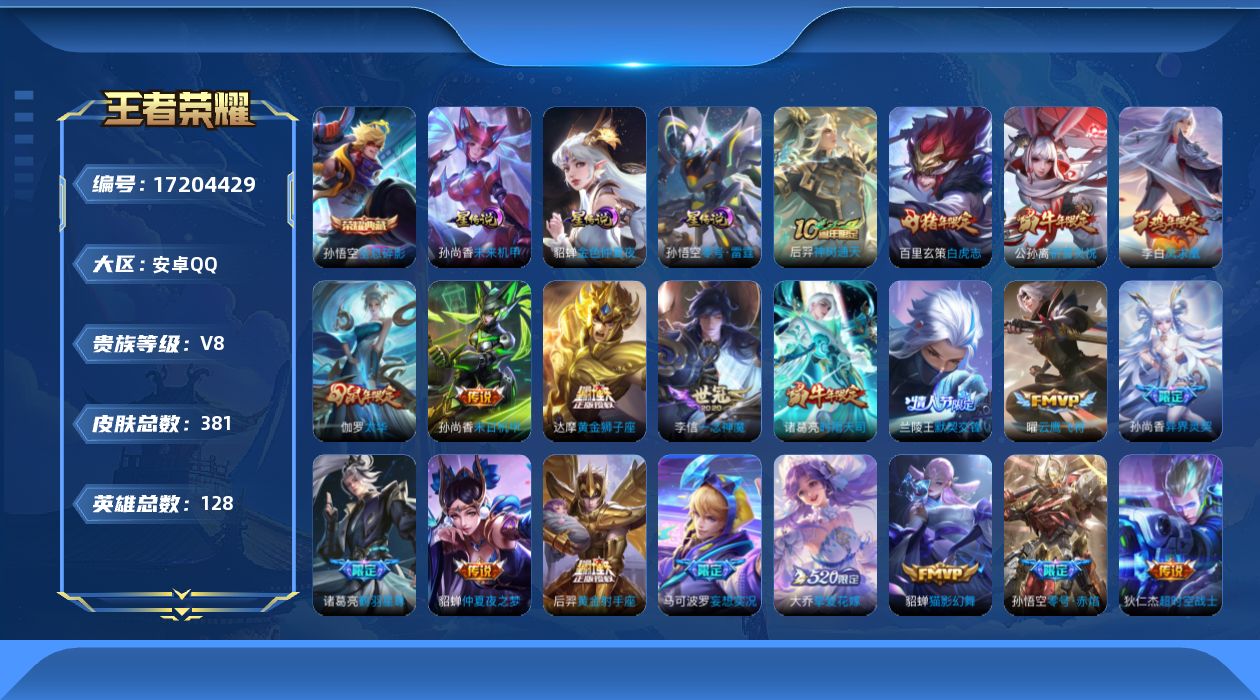 传说品质_后羿_黄金射手座传说品质_后羿_神树通天传说品质_澜_电玩·雷克斯传说品质_诸葛亮_时雨天司传说品质_诸葛亮_鹤羽星尊传说品质_兰陵王_默契交锋传说品质_孙悟空_零号·赤焰传说品质_孙悟空_地狱火传说品质_大乔_挚爱花嫁传说品质_貂蝉_猫影幻舞传说品质_貂蝉_仲夏夜之梦传说品质_李信_一念神魔传说品质_孙尚香_末日机甲传说品质_孙尚香_异界灵契传说品质_马可波罗_妄想实况传说品质_李白_凤求凰传说品质_公孙离_祈雪灵祝传说品质_伽罗_太华传说品质_曜_云鹰飞将传说品质_孙策_挚爱之约传说品质_狄仁杰_超时空战士传说品质_达摩_黄金狮子座传说品质_虞姬_启明星使传说品质_李元芳_飞鸢探春传说品质_百里玄策_白虎志传说品质_韩信_踏浪归传说品质_赵云_淬星耀世传说品质_王昭君_乞巧织情
