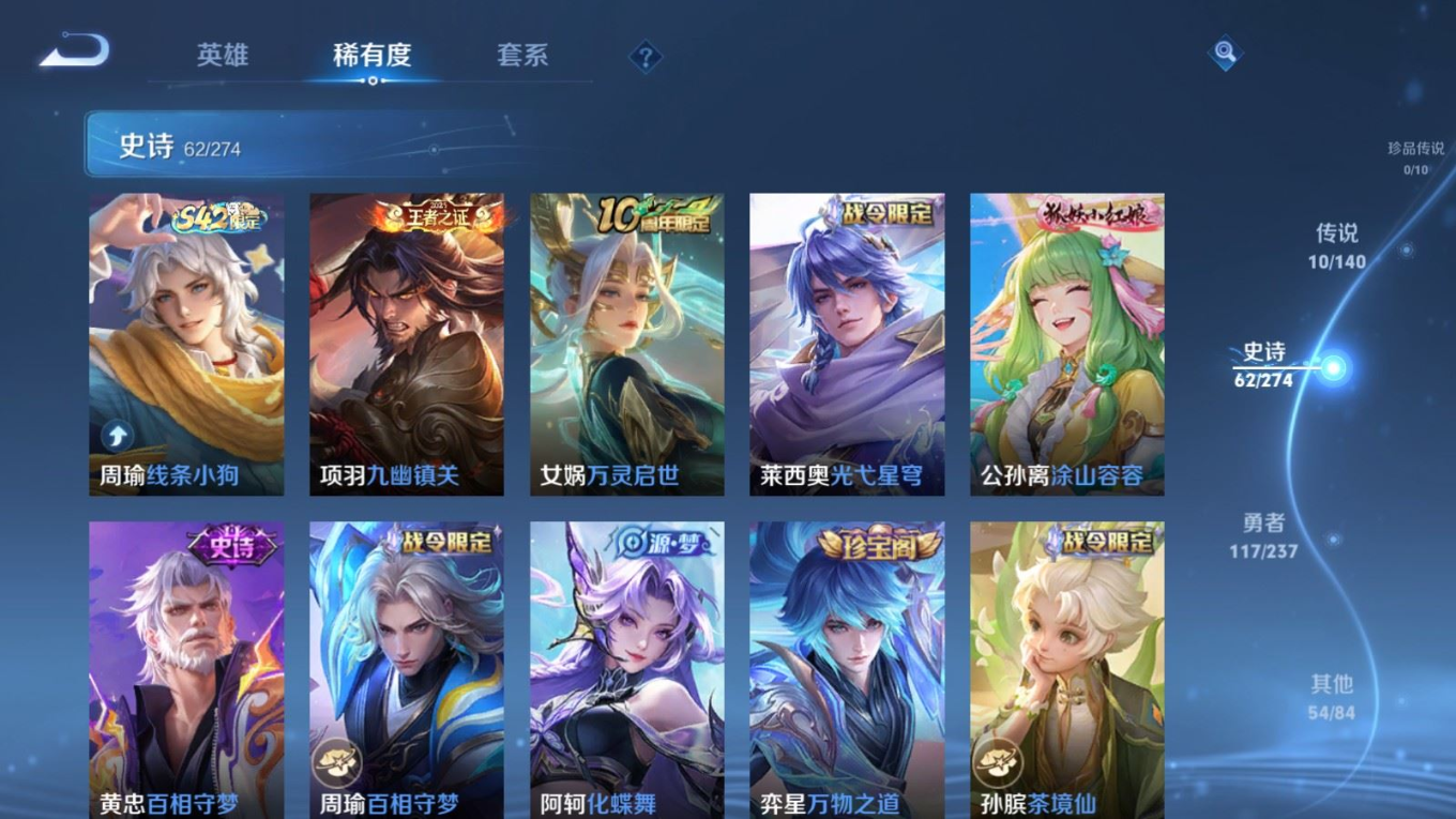 贵族等级:v7皮肤数:244传说品质10 生肖限定4 星界纪事1 荣耀典藏1 英雄数:128