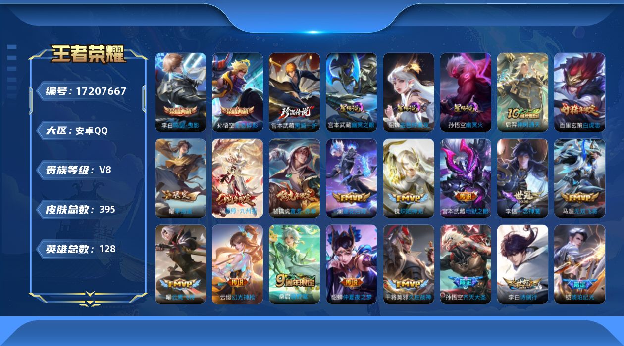 贵族等级:v8皮肤数:395传说品质23 生肖限定4 情人节限定2 荣耀典藏2 魔法世界2 珍品传说1 墨染江湖1 英雄数:128