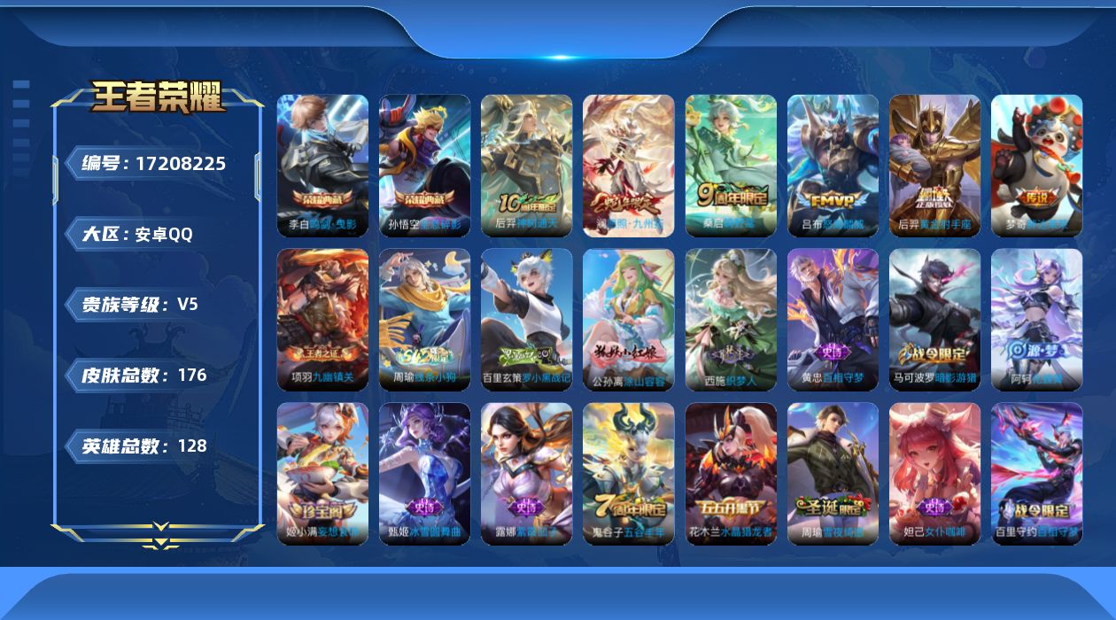 贵族等级:v5皮肤数:176传说品质6 生肖限定1 荣耀典藏2 青春校园1 英雄数:128