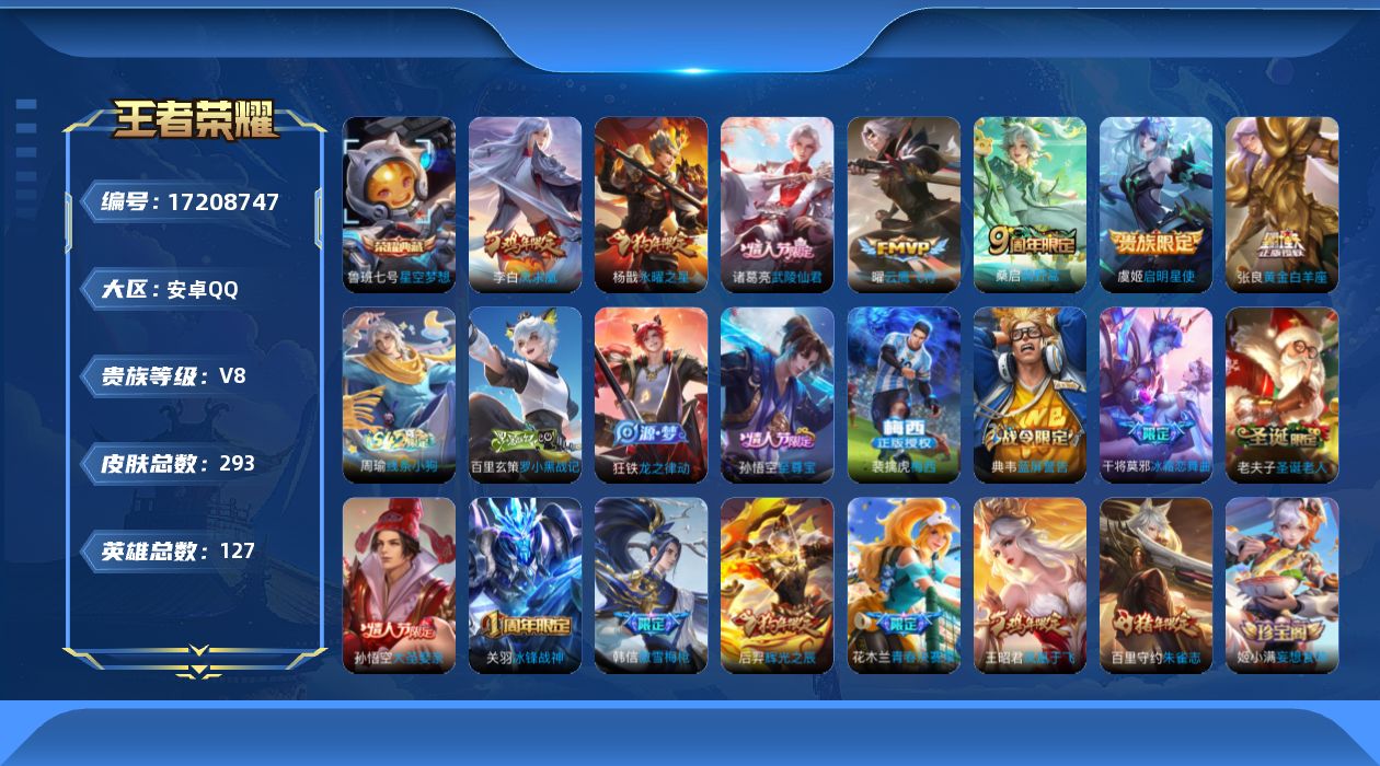 贵族等级:v8皮肤数:293生肖限定6 传说品质7 情人节限定3 荣耀典藏1 英雄数:127