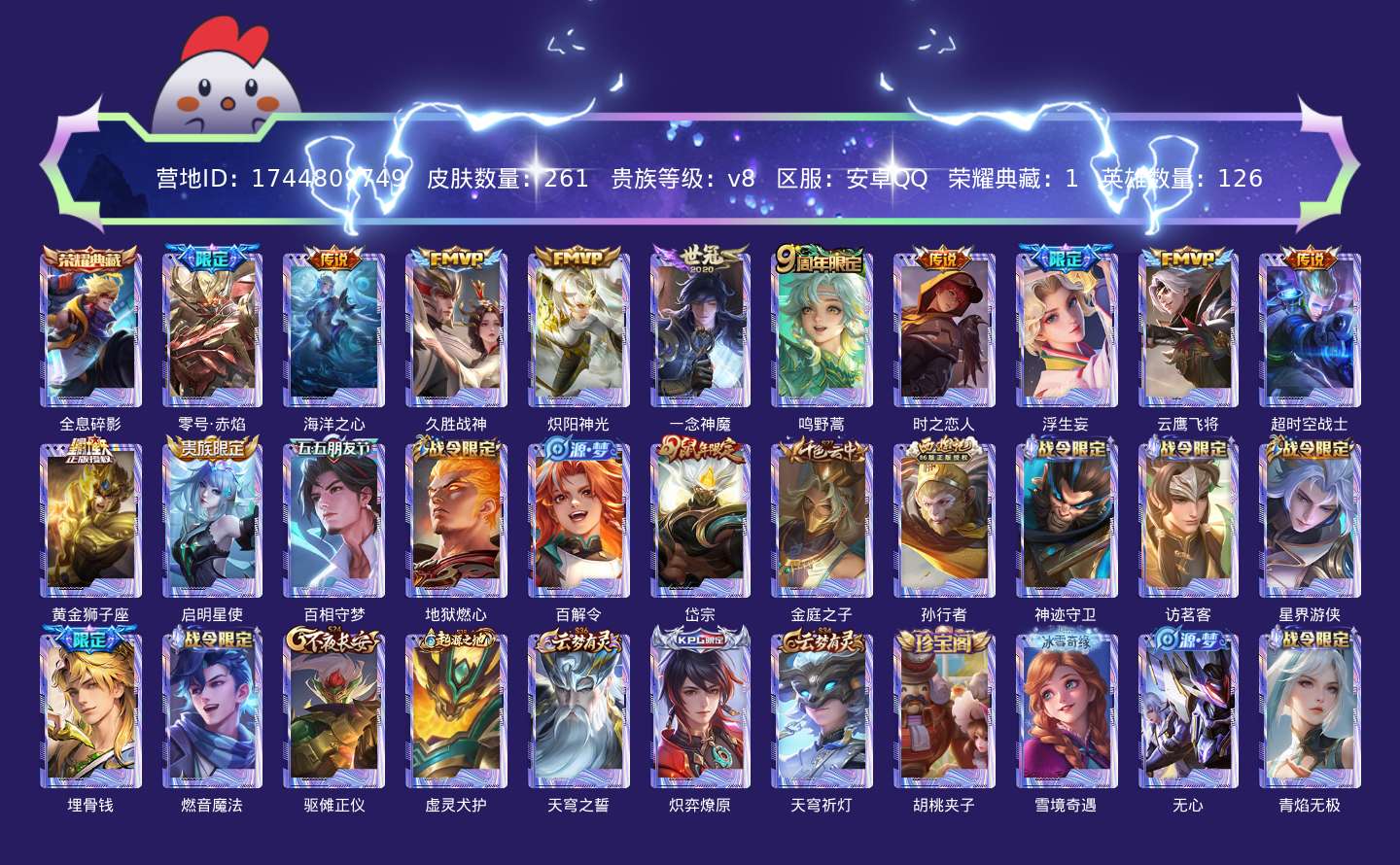 贵族等级:v8皮肤数:261生肖限定2 荣耀典藏1 传说品质12 英雄数:126