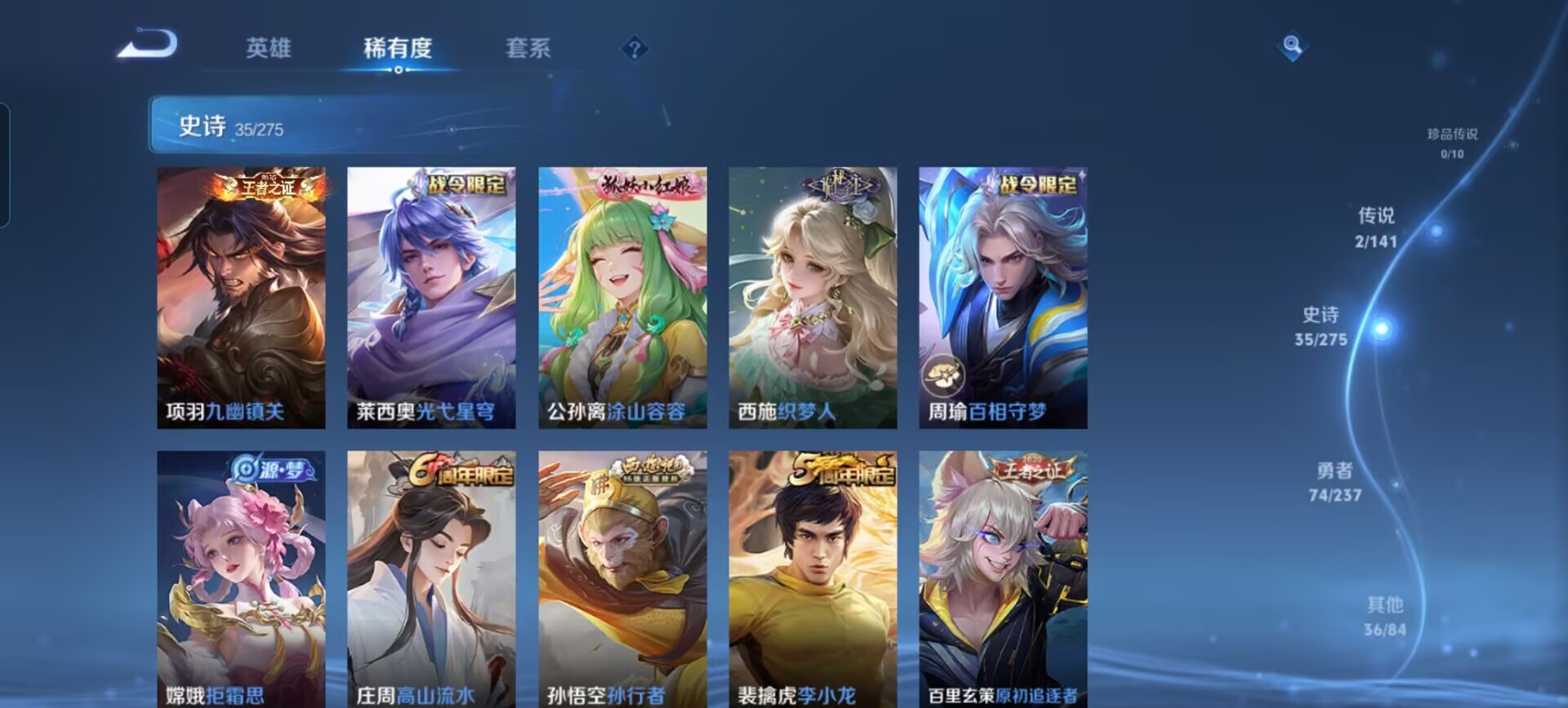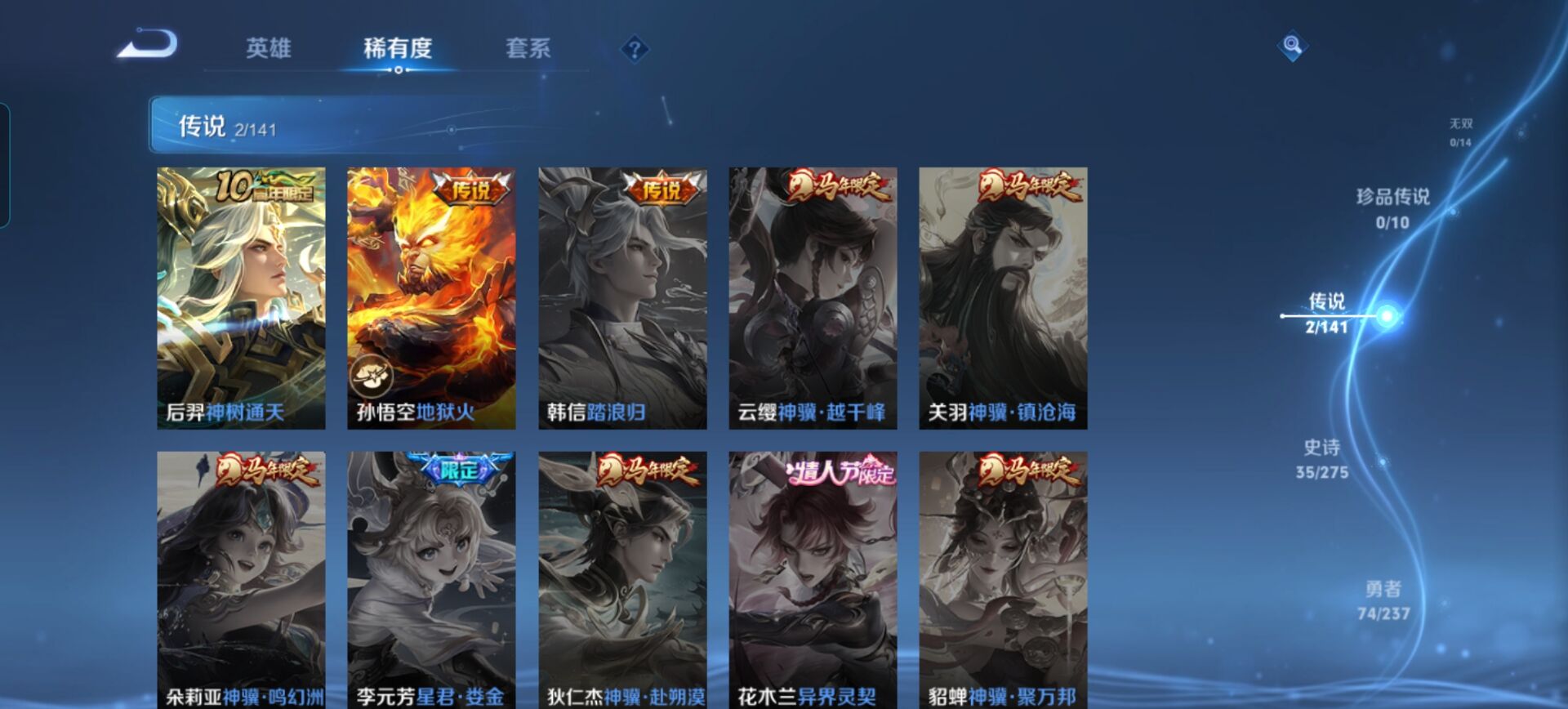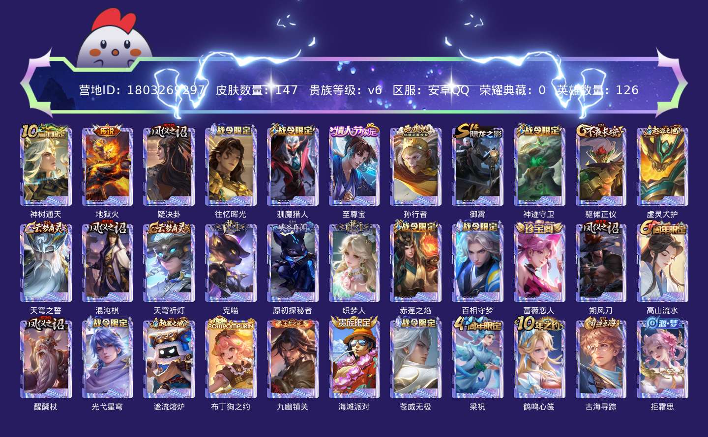 贵族等级:v6皮肤数:147传说品质2 情人节限定1 生肖限定1 英雄数:126