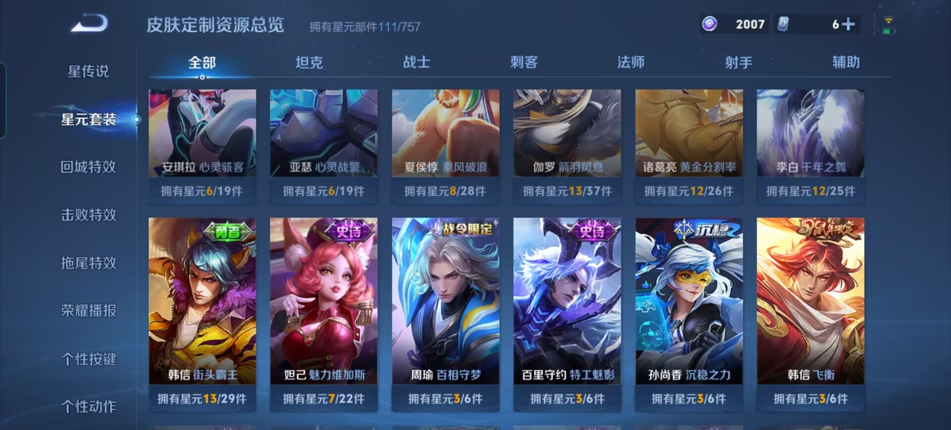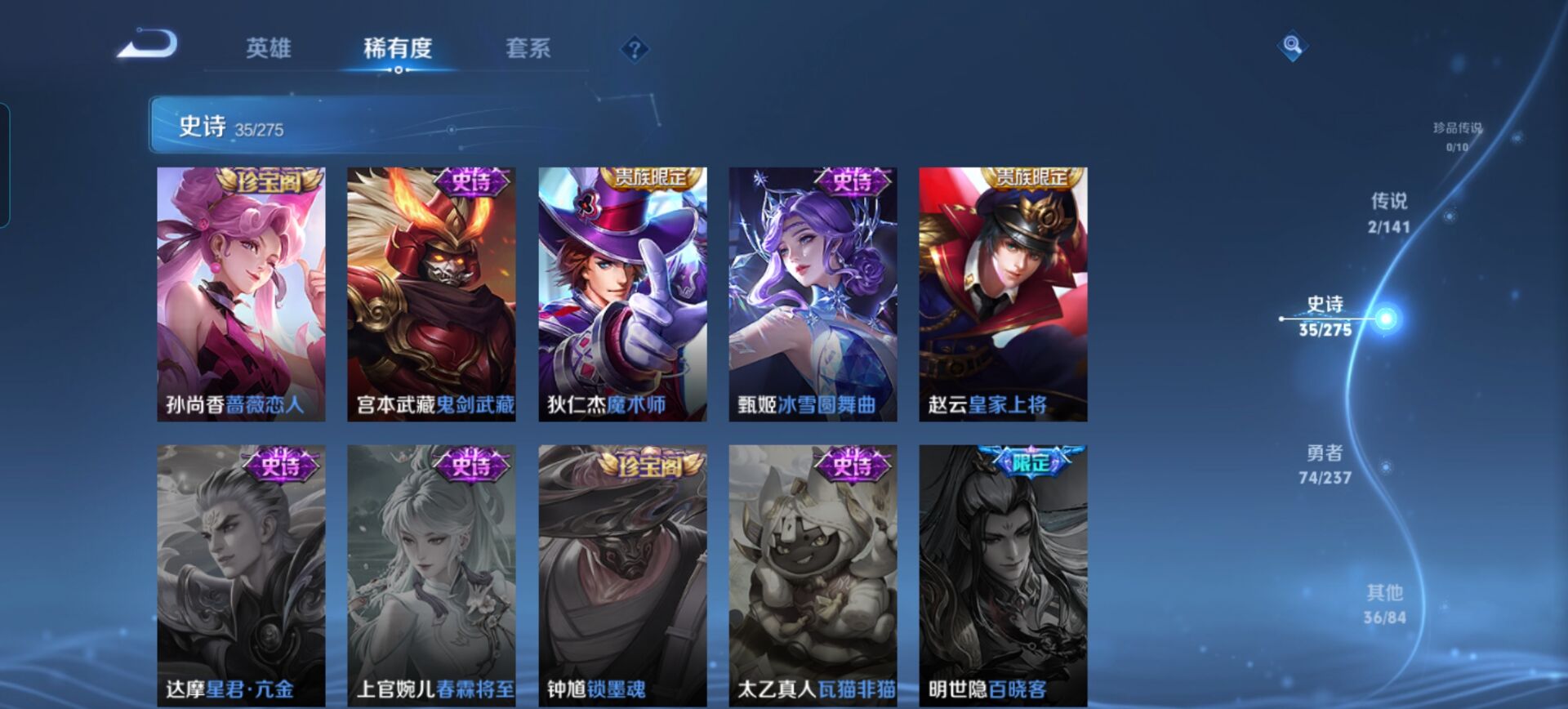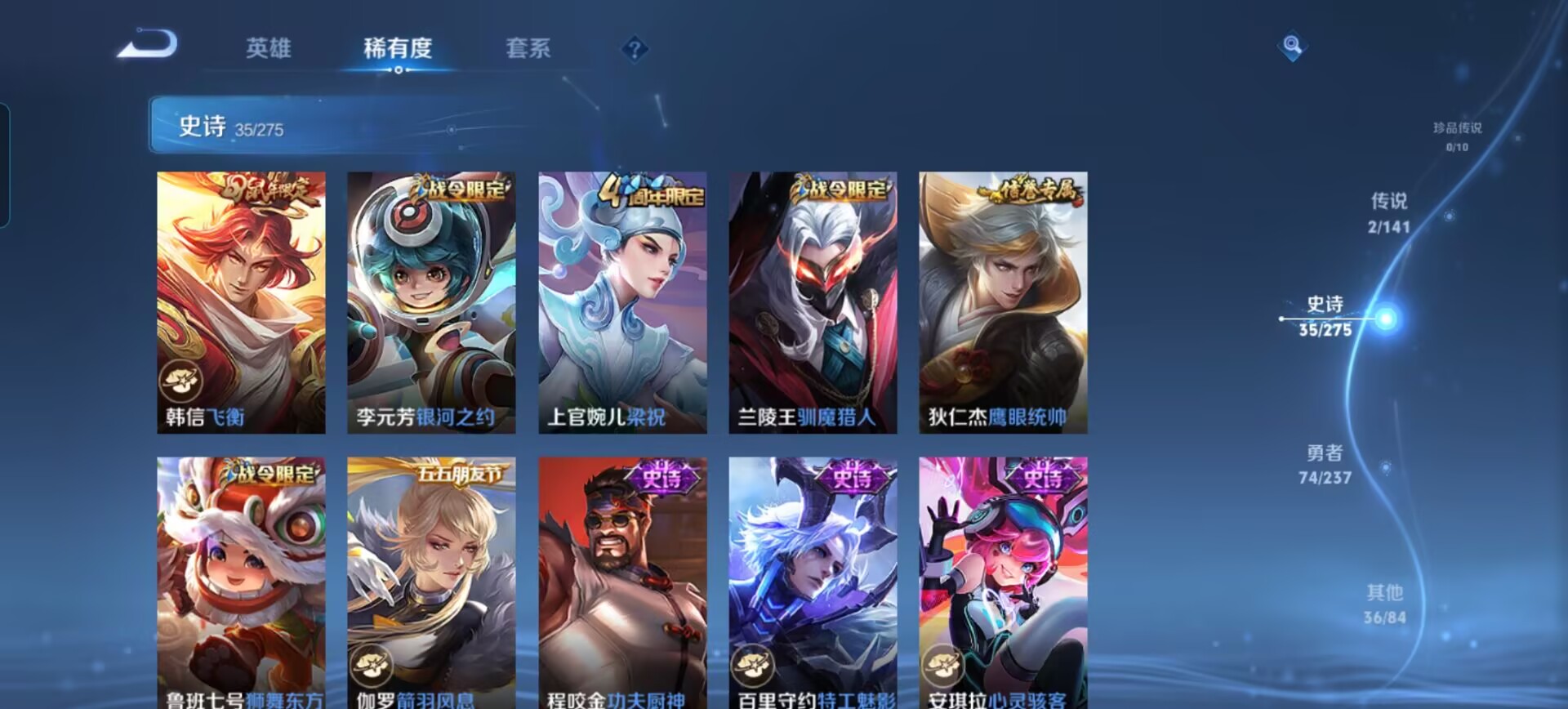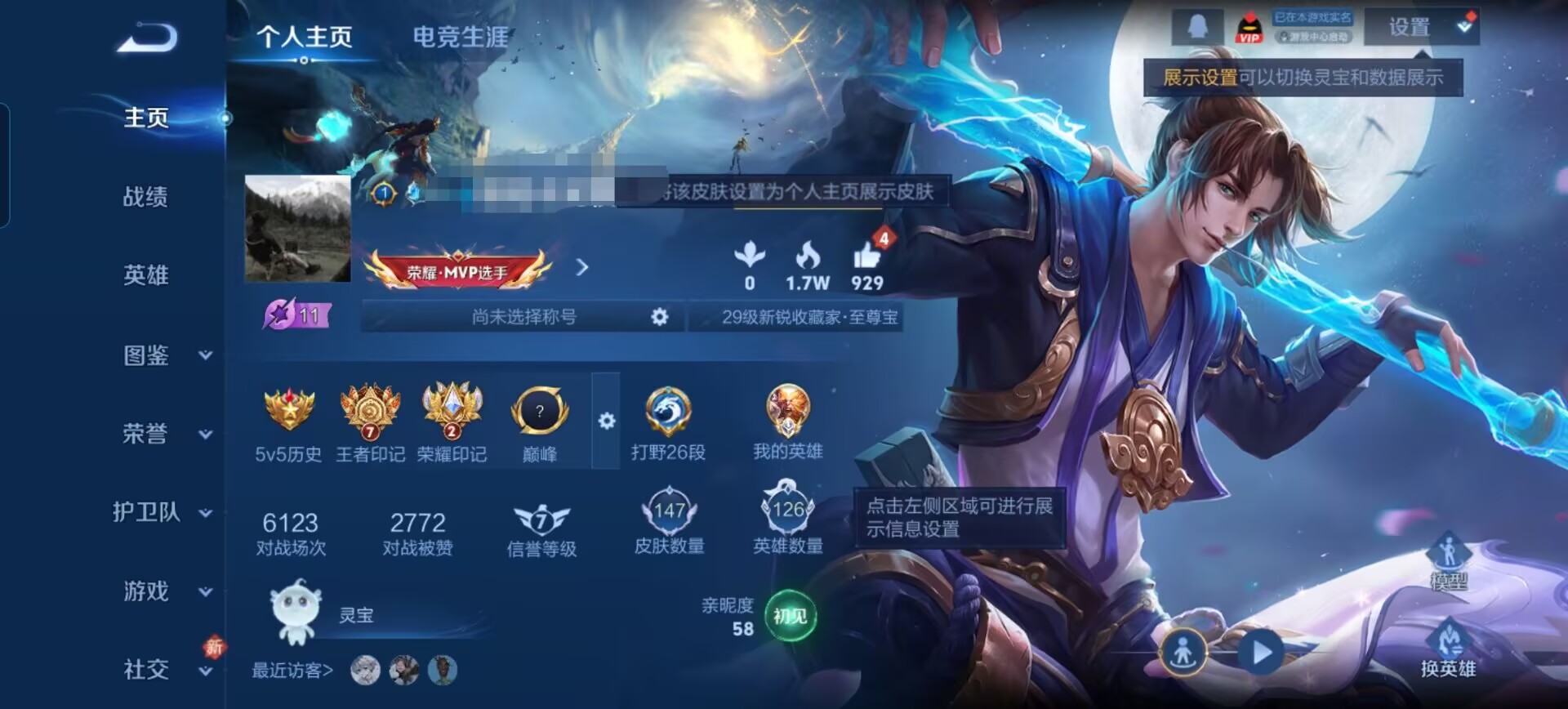 贵族等级:v6皮肤数:147传说品质2 情人节限定1 生肖限定1 英雄数:126
