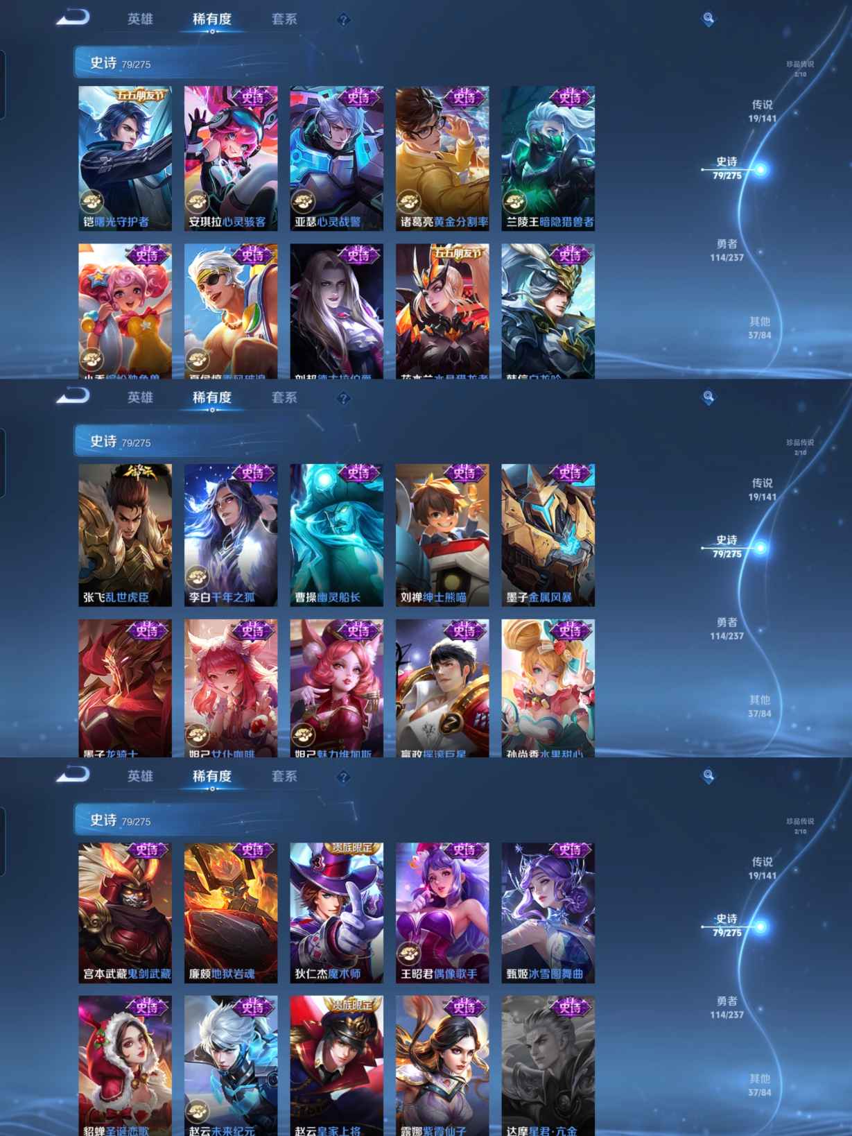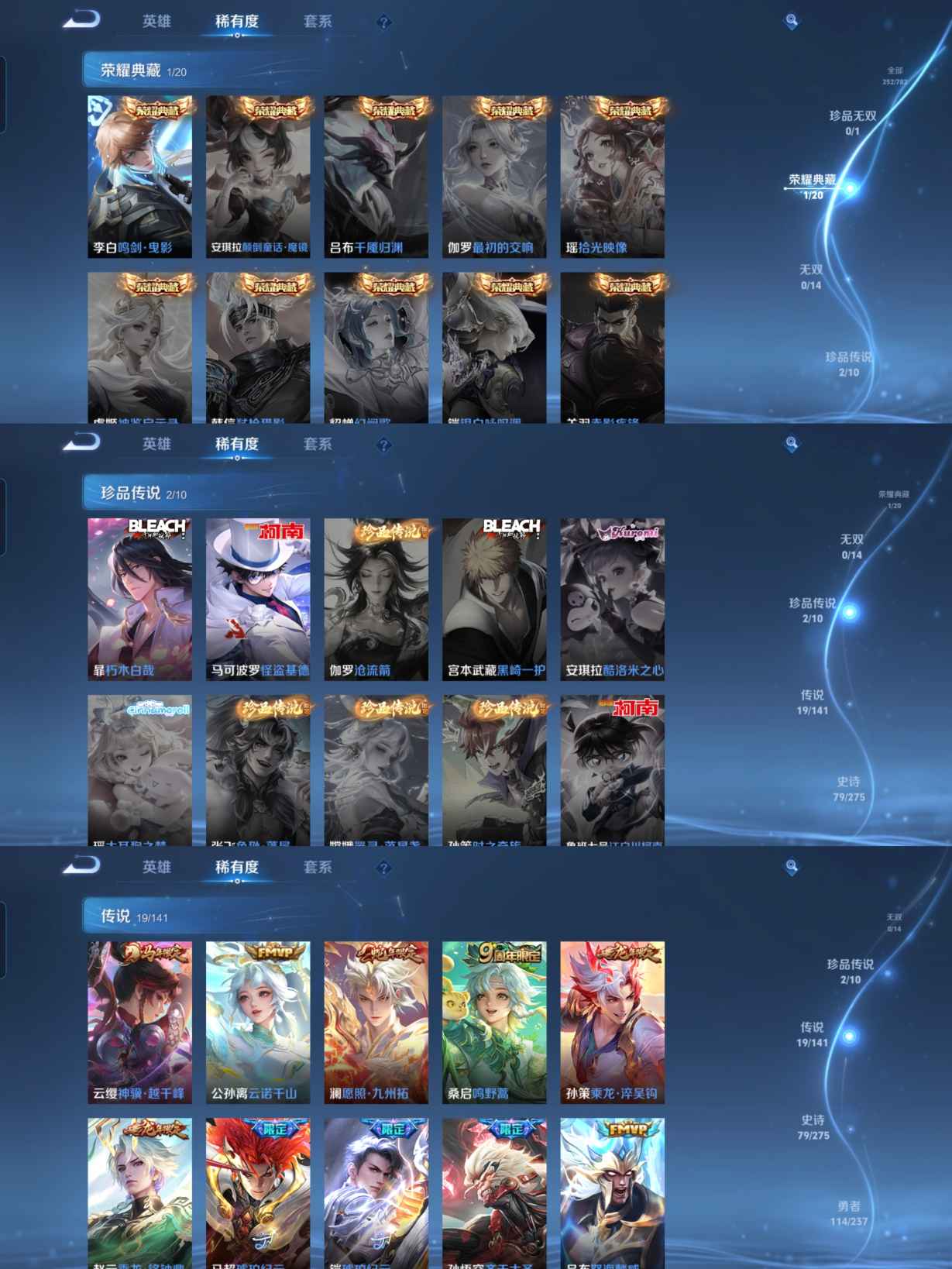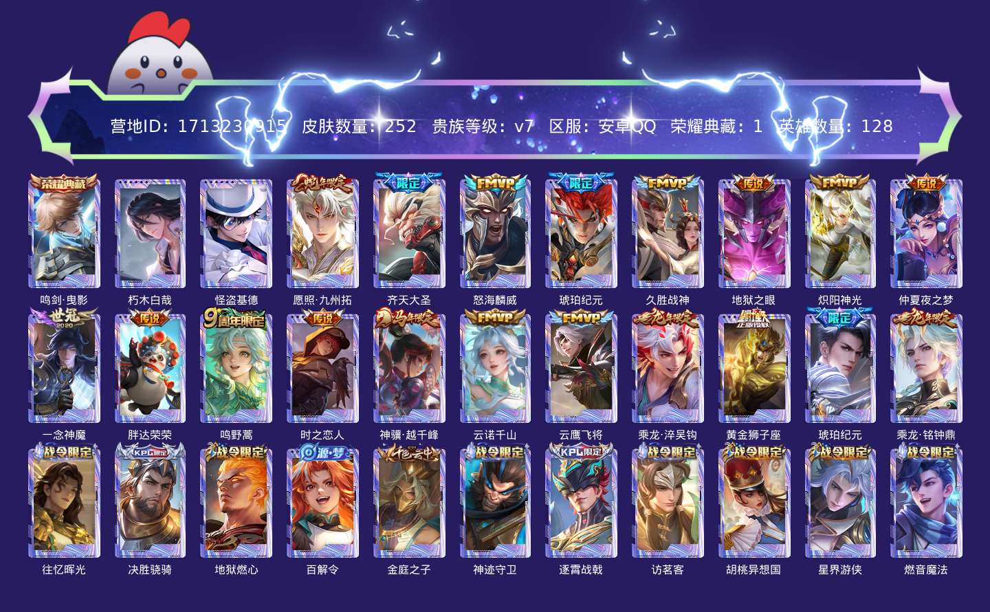 贵族等级:v7皮肤数:252传说品质19 生肖限定4 珍品传说2 荣耀典藏1 英雄数:128
