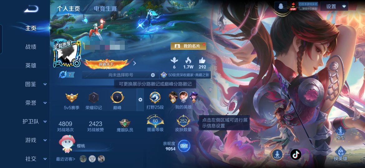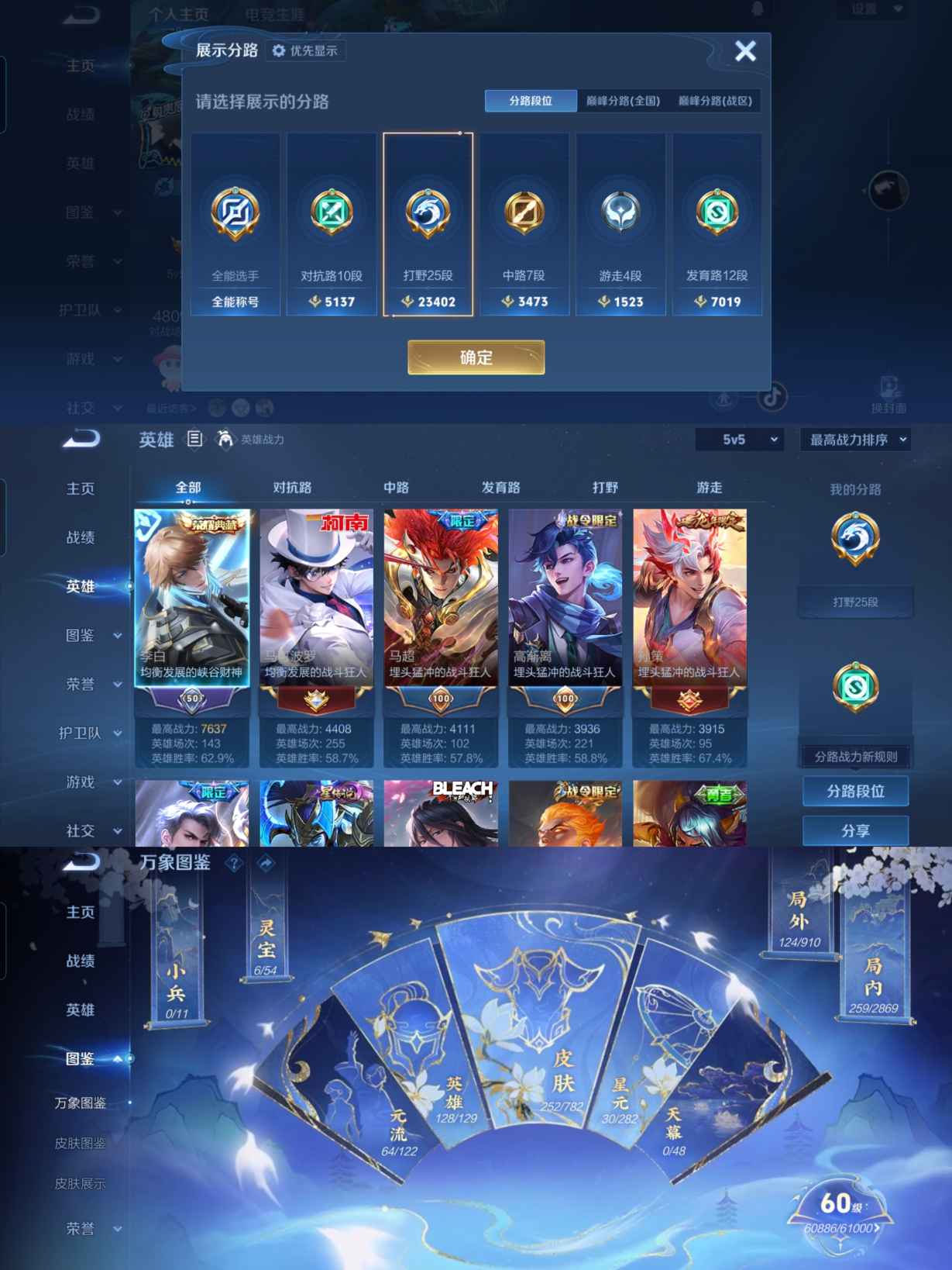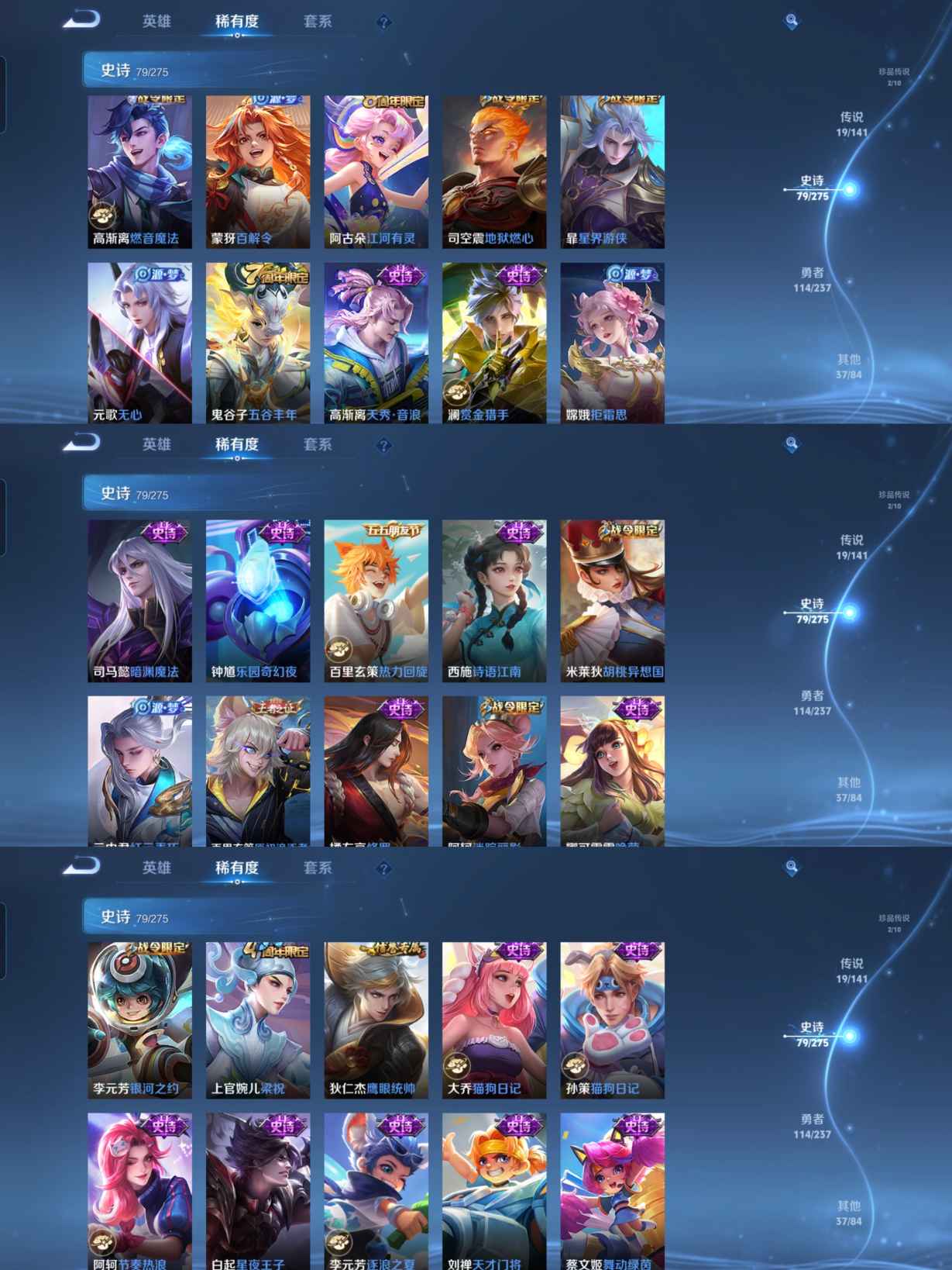 贵族等级:v7皮肤数:252传说品质19 生肖限定4 珍品传说2 荣耀典藏1 英雄数:128