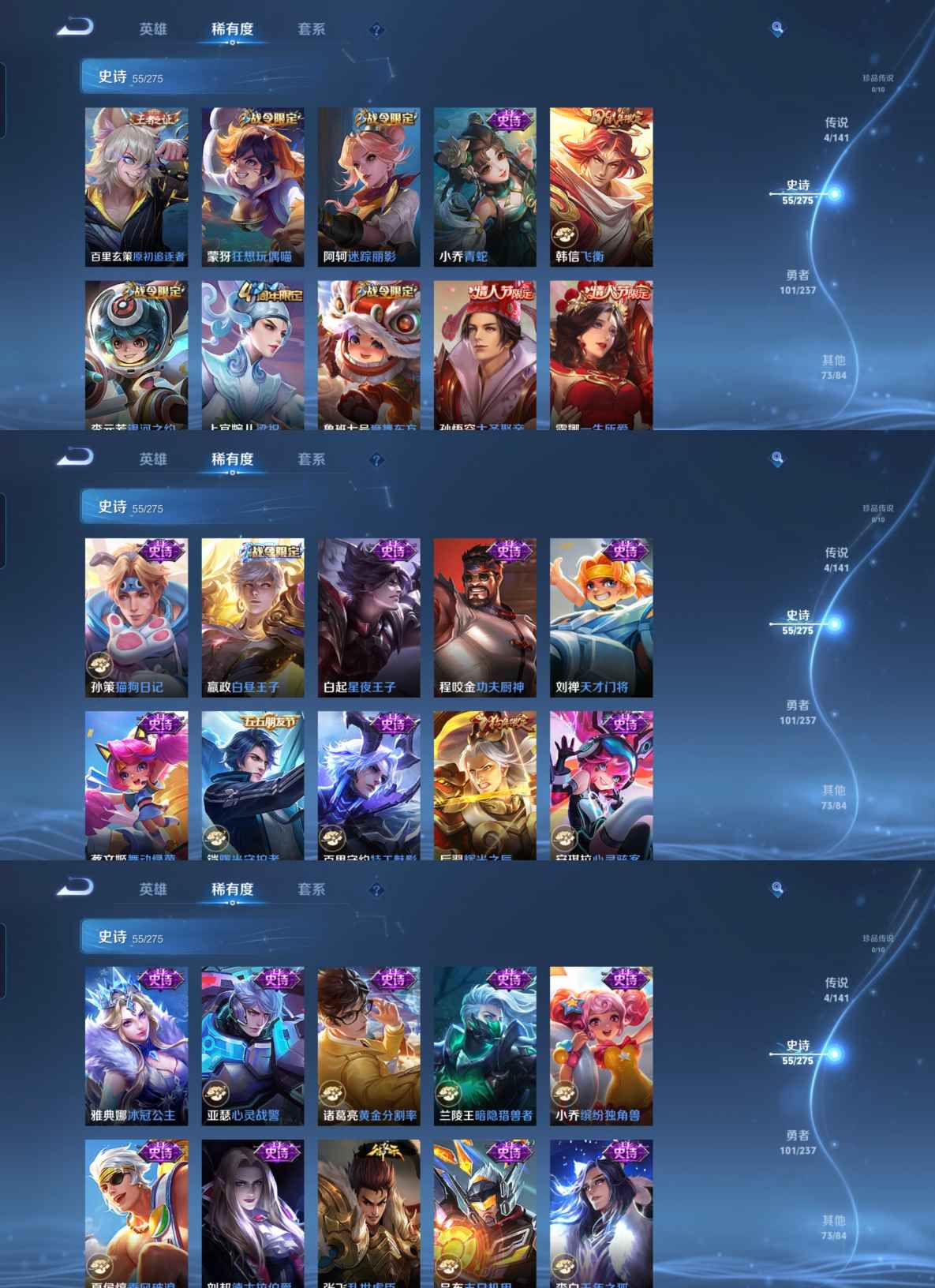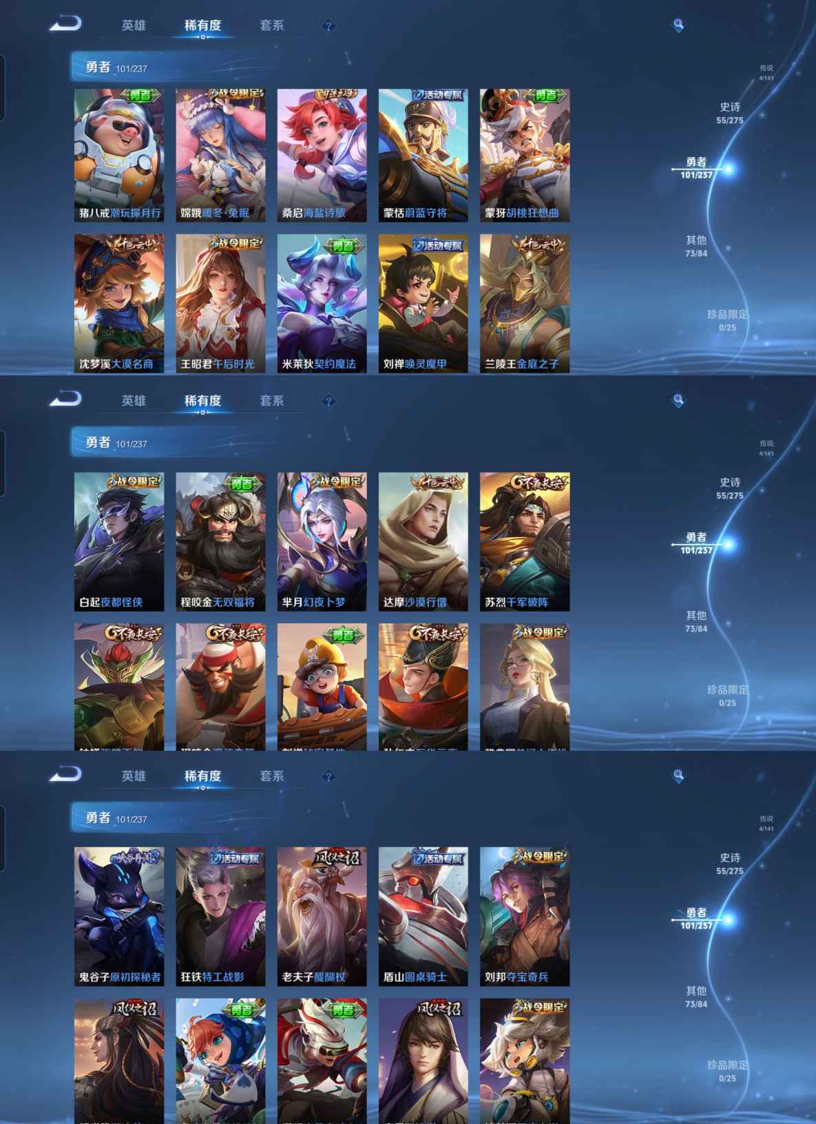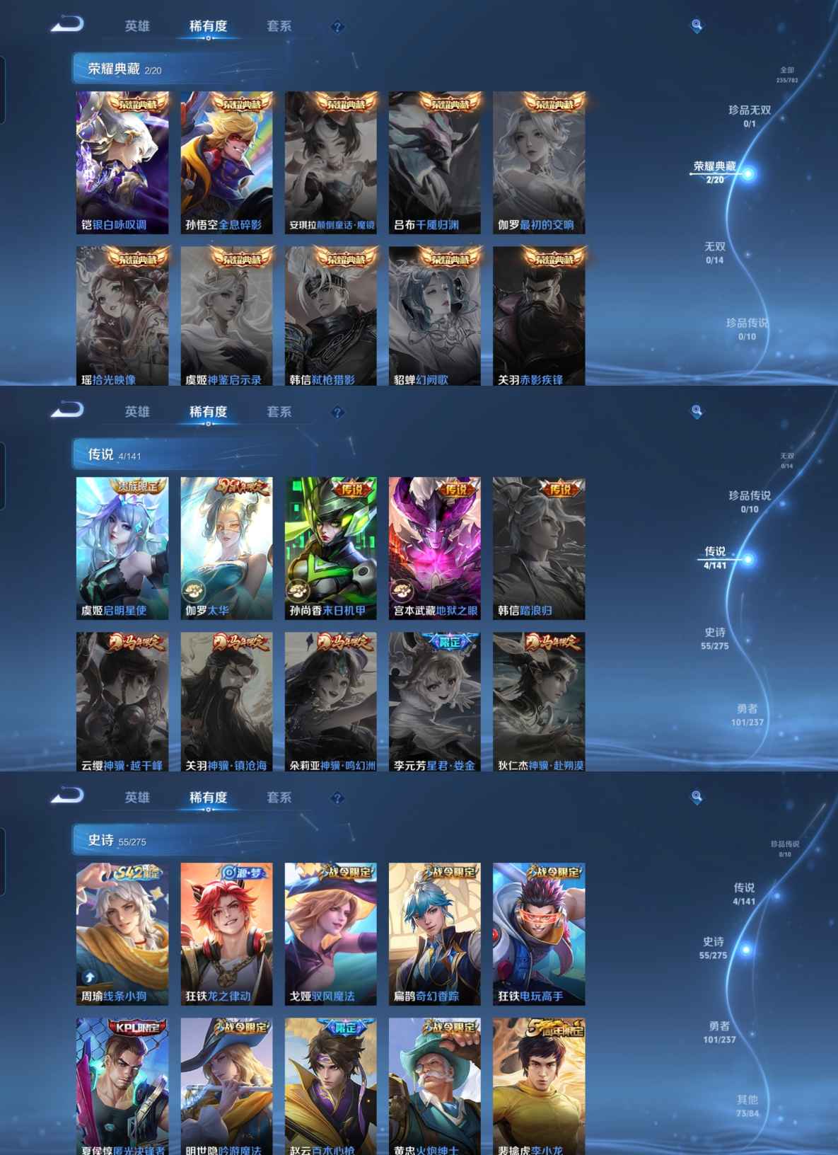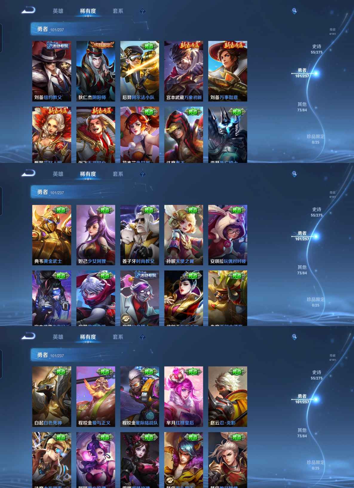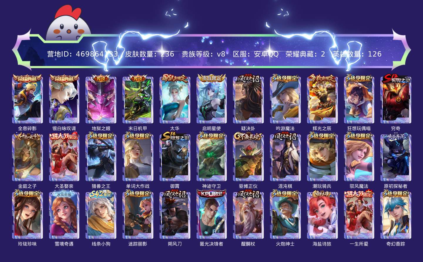 贵族等级:v8皮肤数:236生肖限定3 情人节限定2 荣耀典藏2 传说品质4 英雄数:126