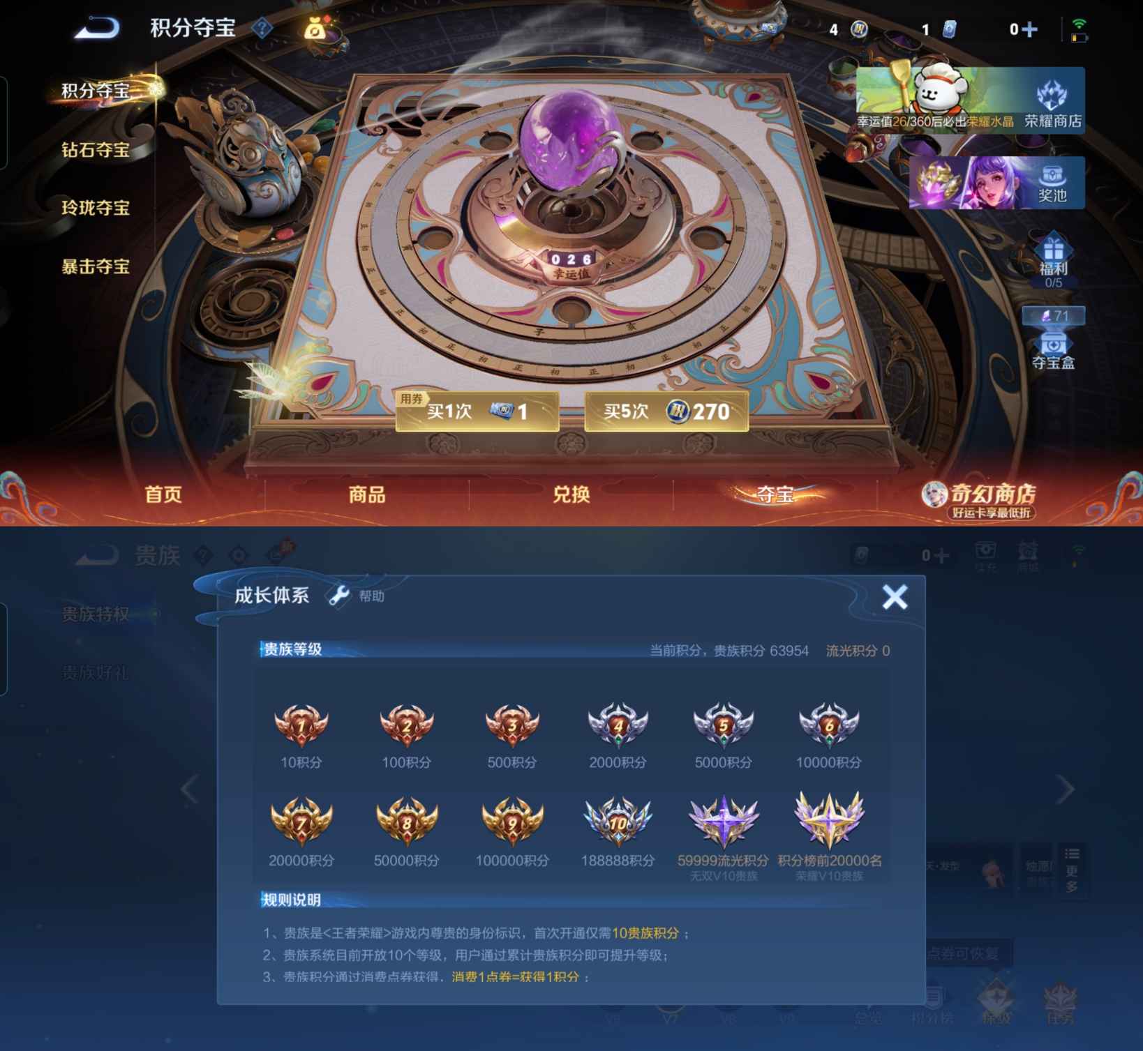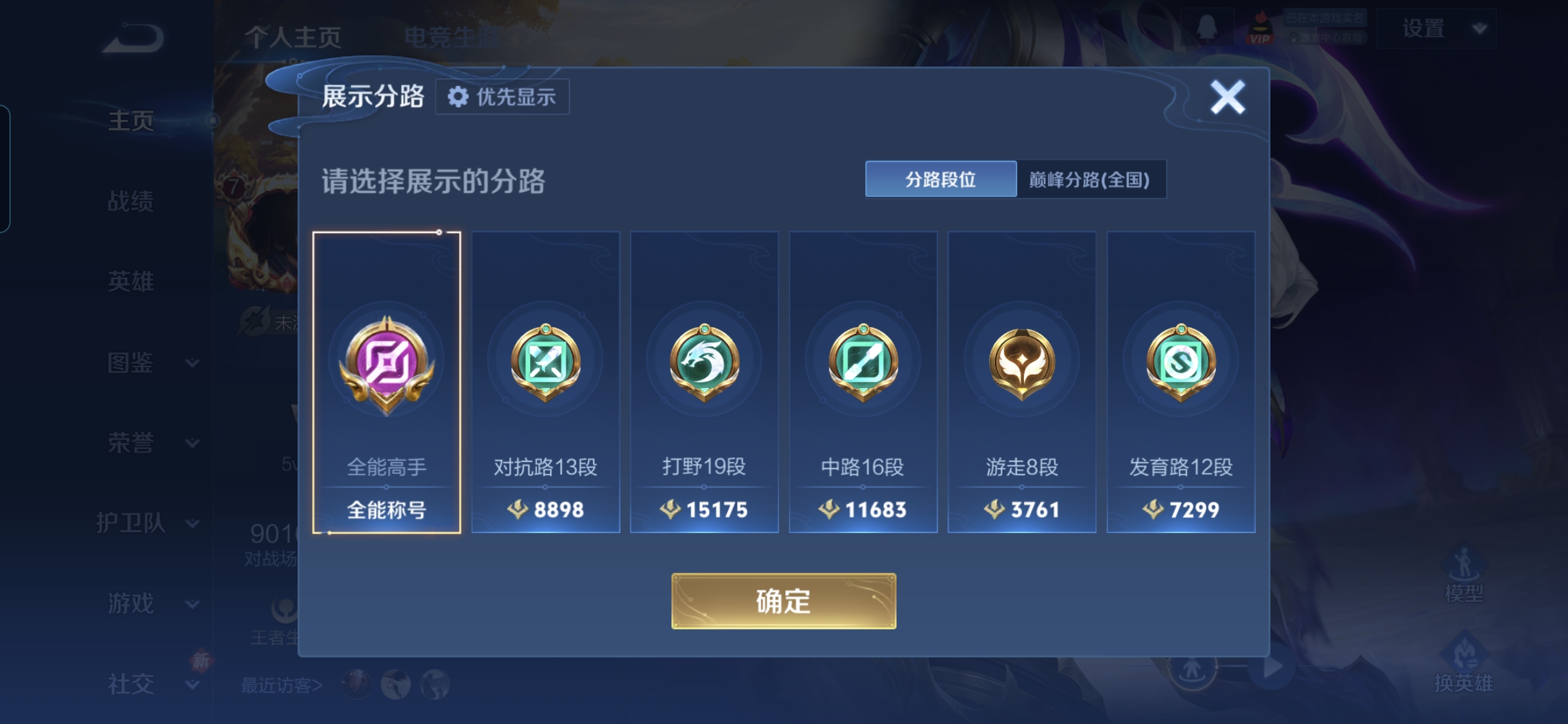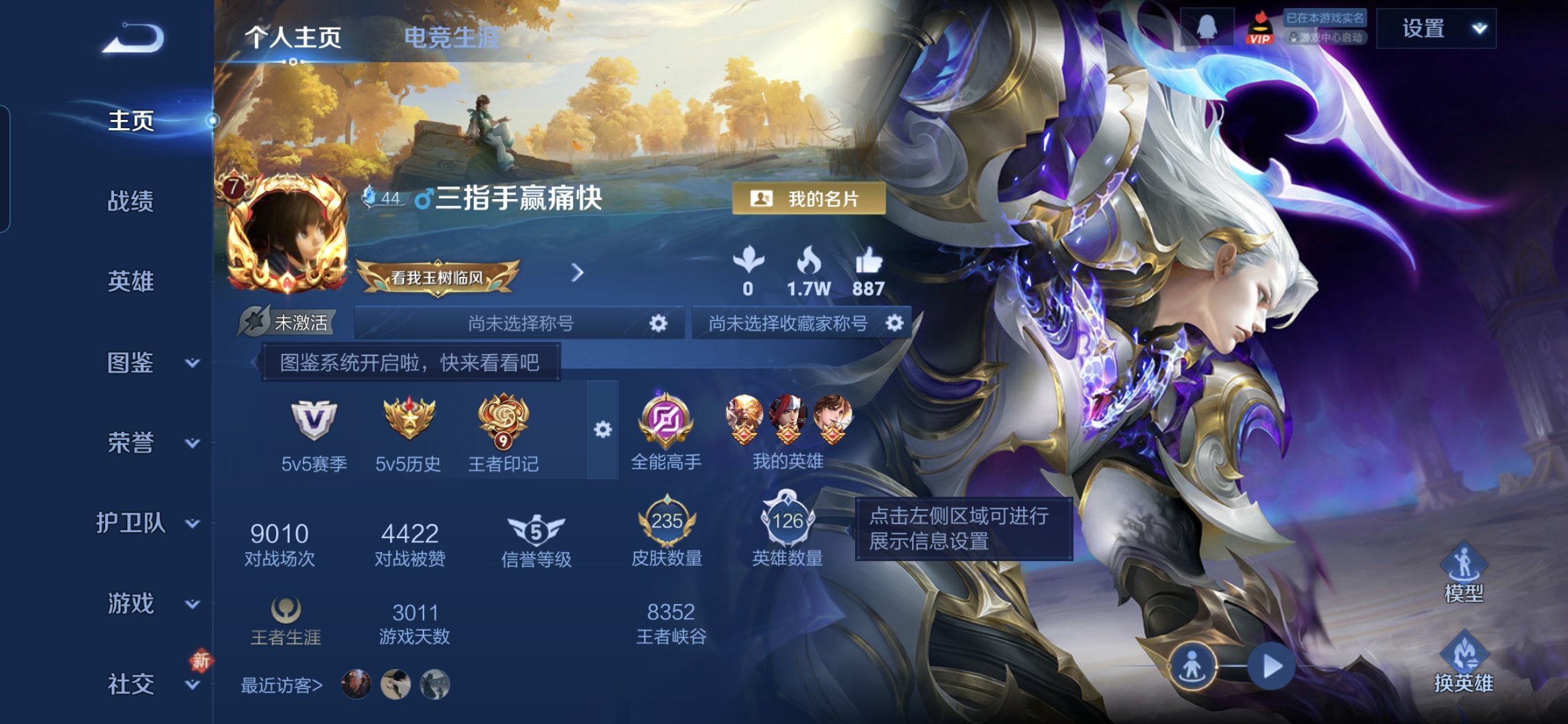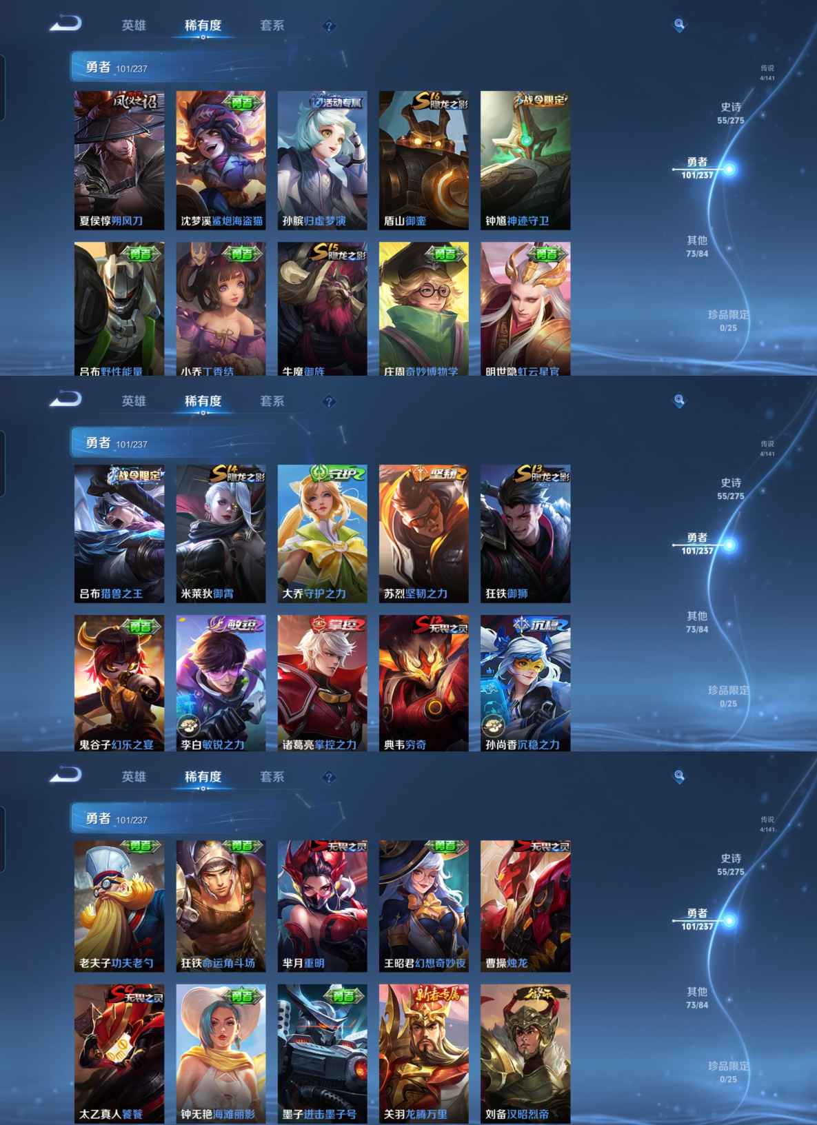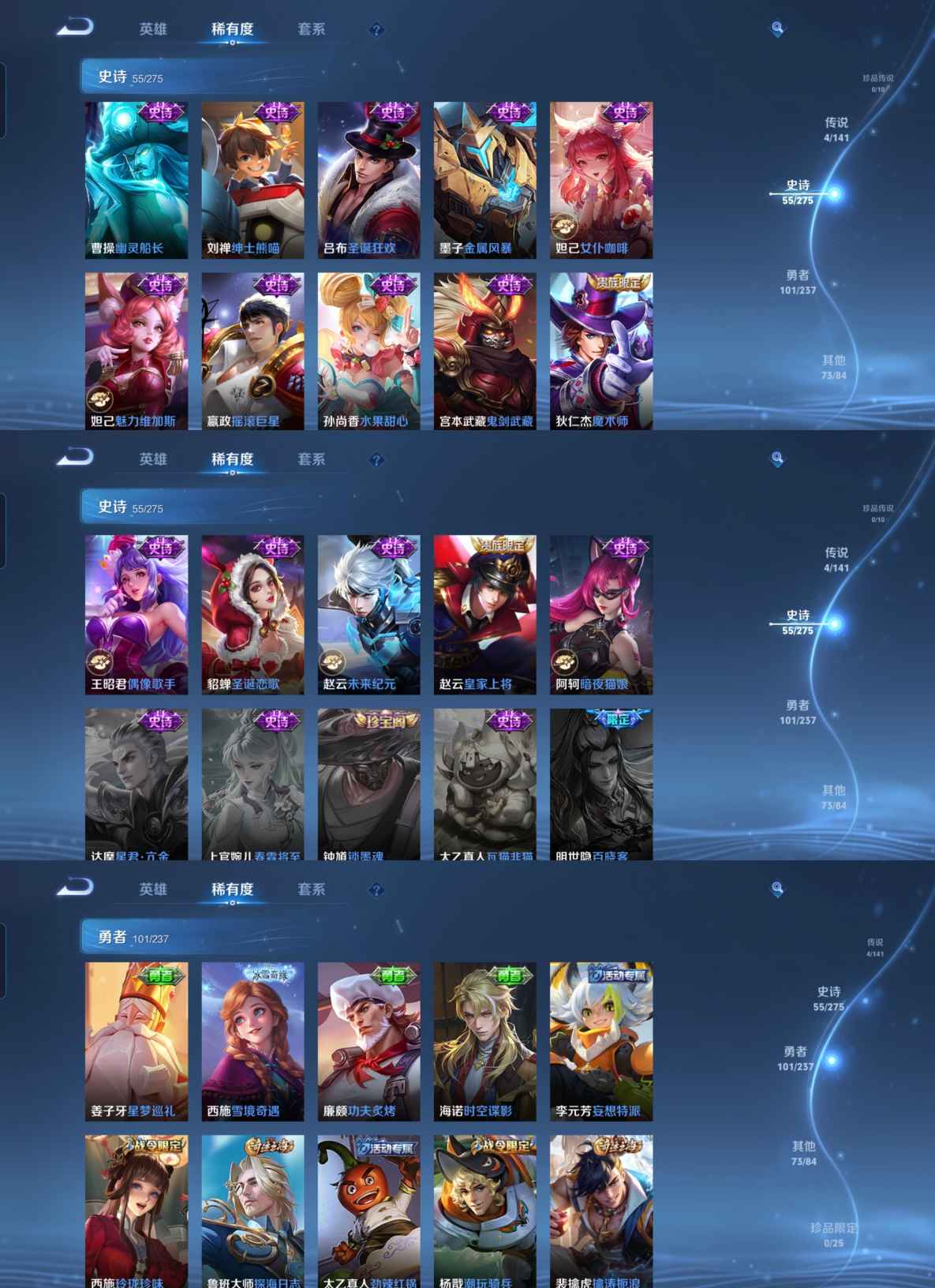 贵族等级:v8皮肤数:236生肖限定3 情人节限定2 荣耀典藏2 传说品质4 英雄数:126