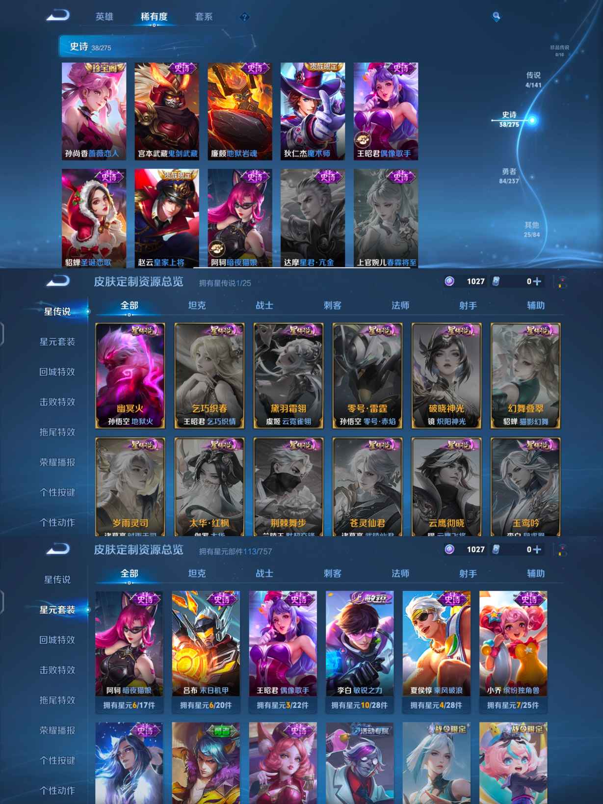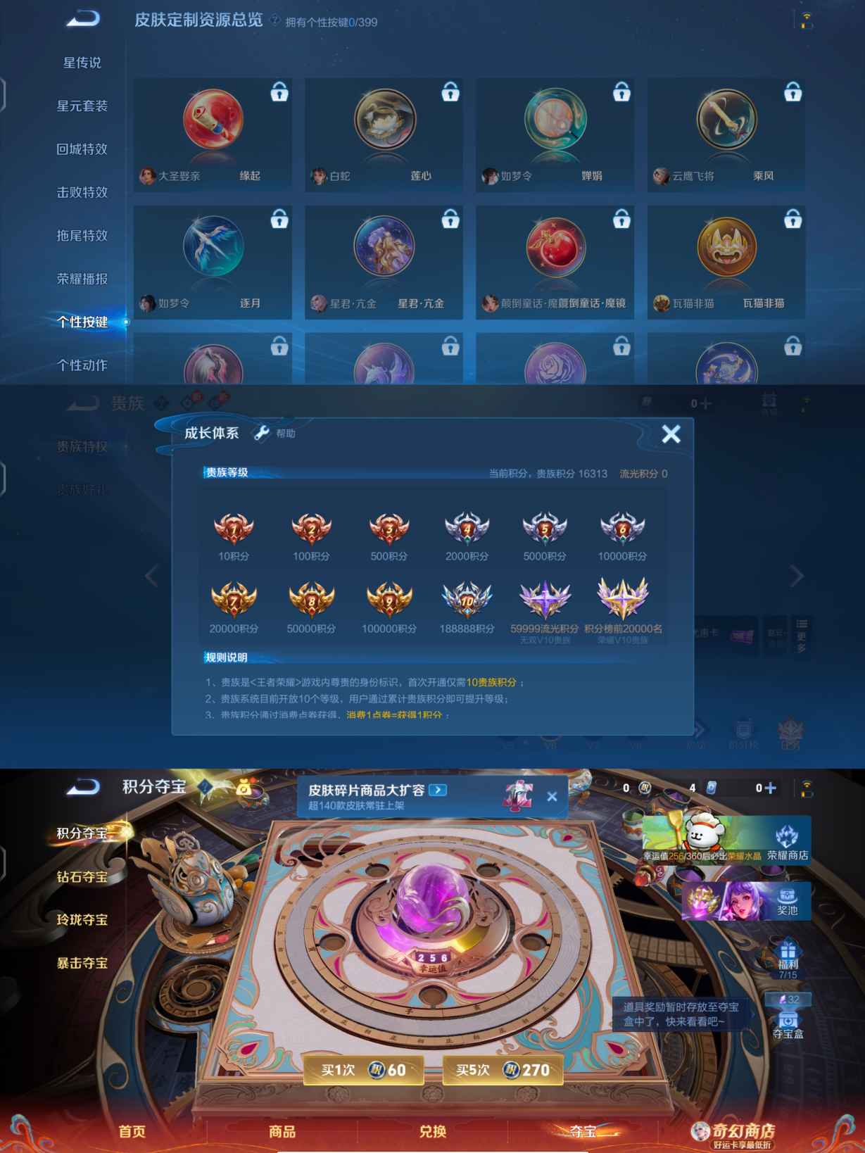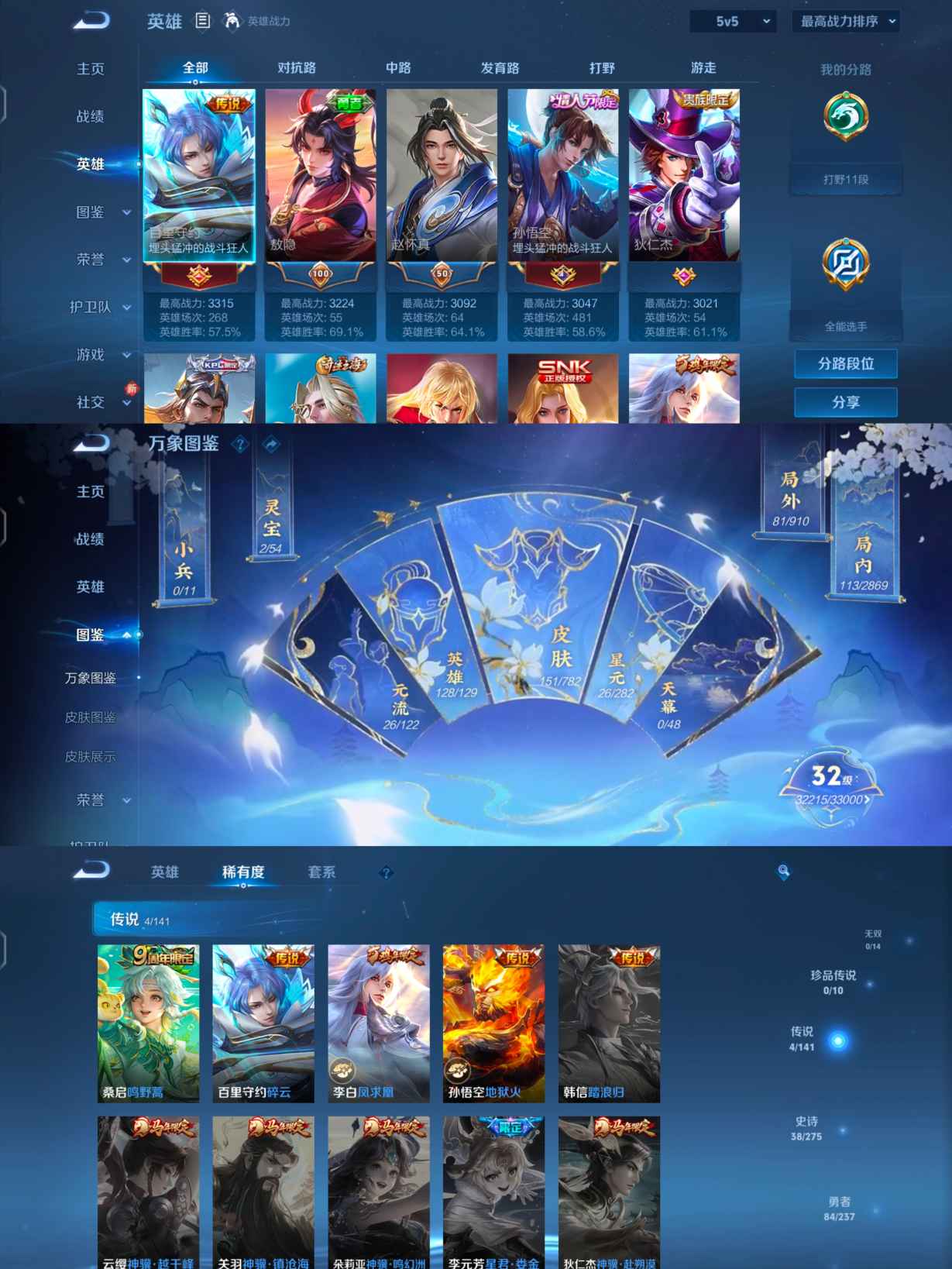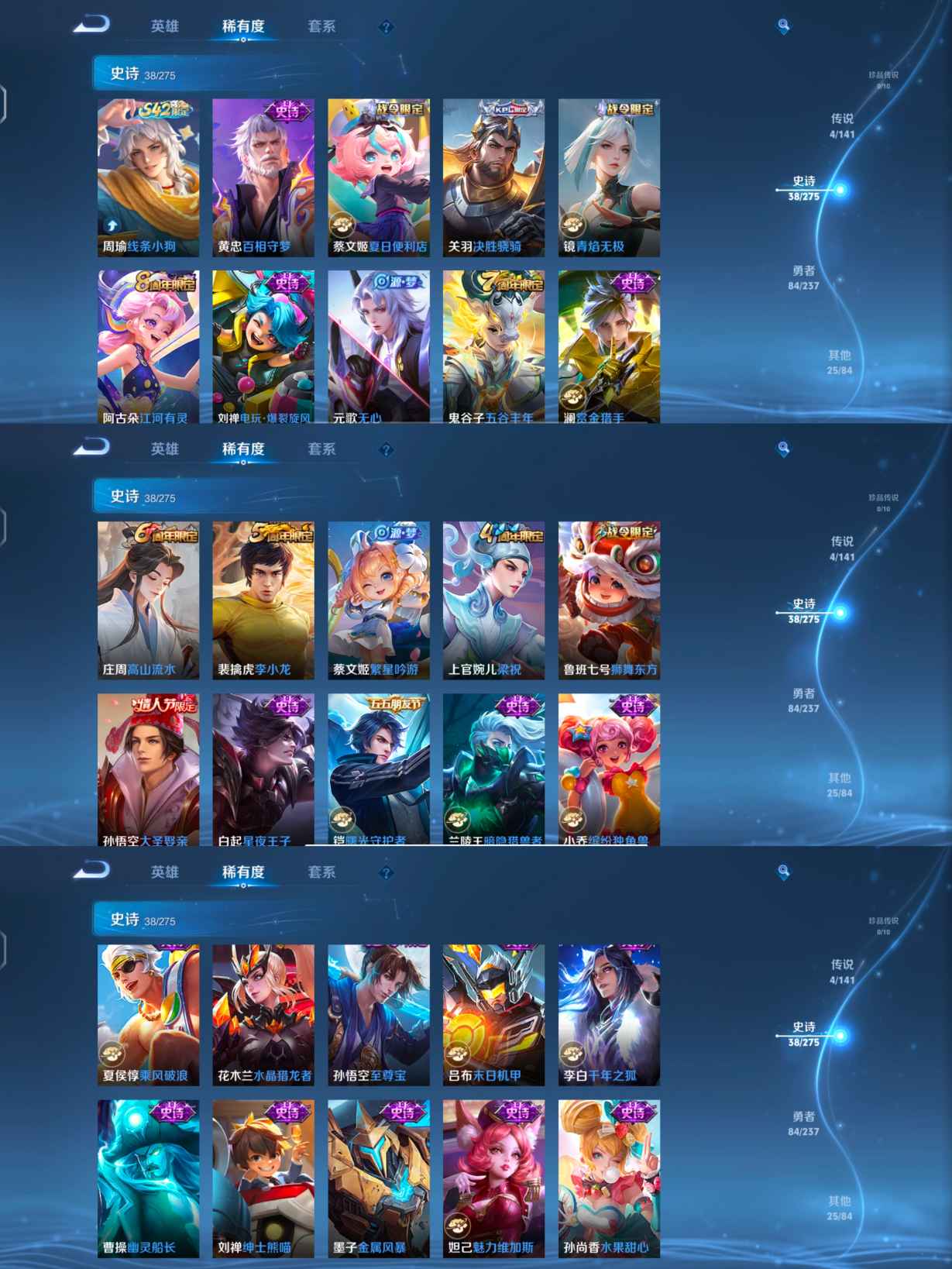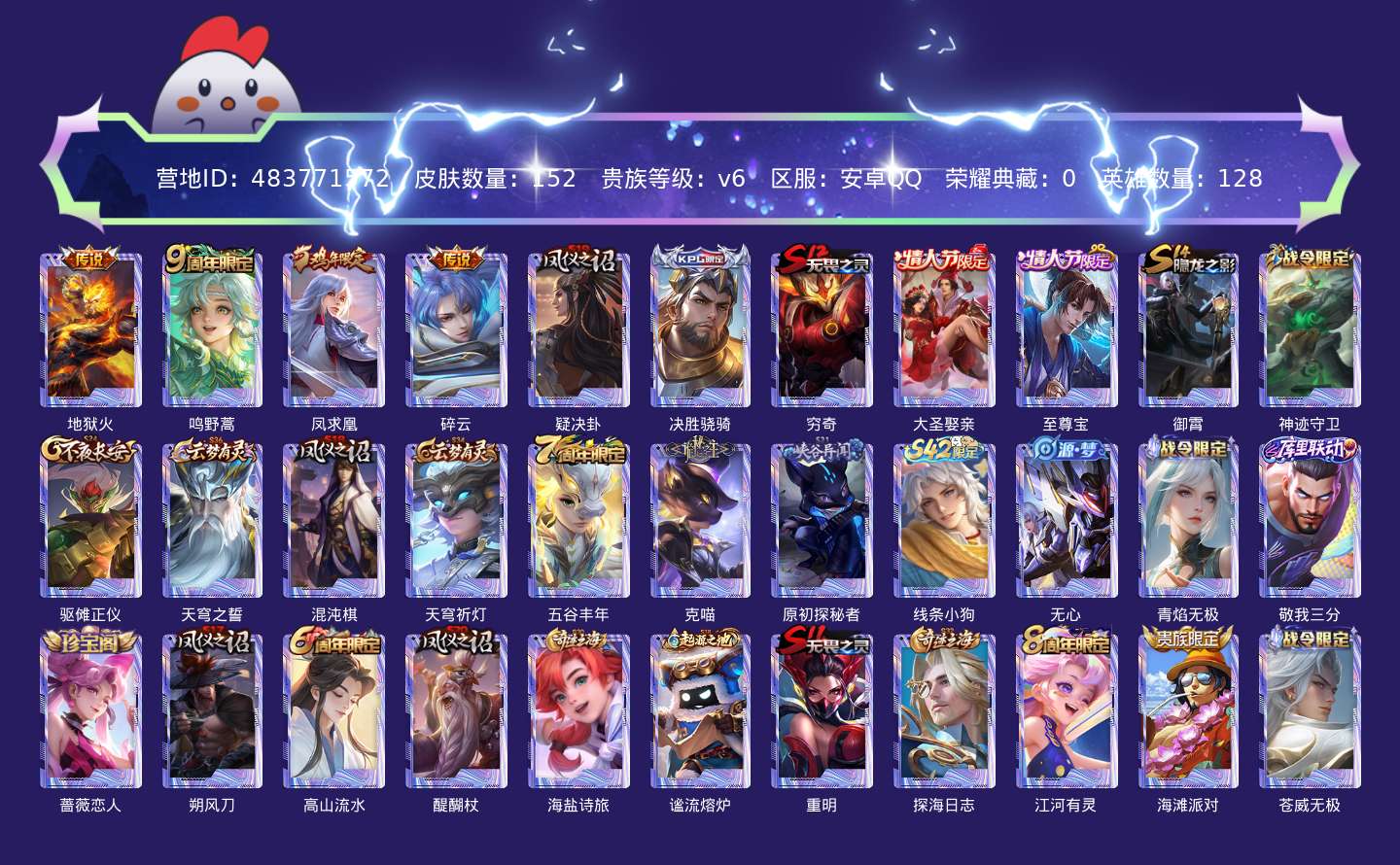 贵族等级:v6皮肤数:155情人节限定2 传说品质4 生肖限定1 英雄数:128