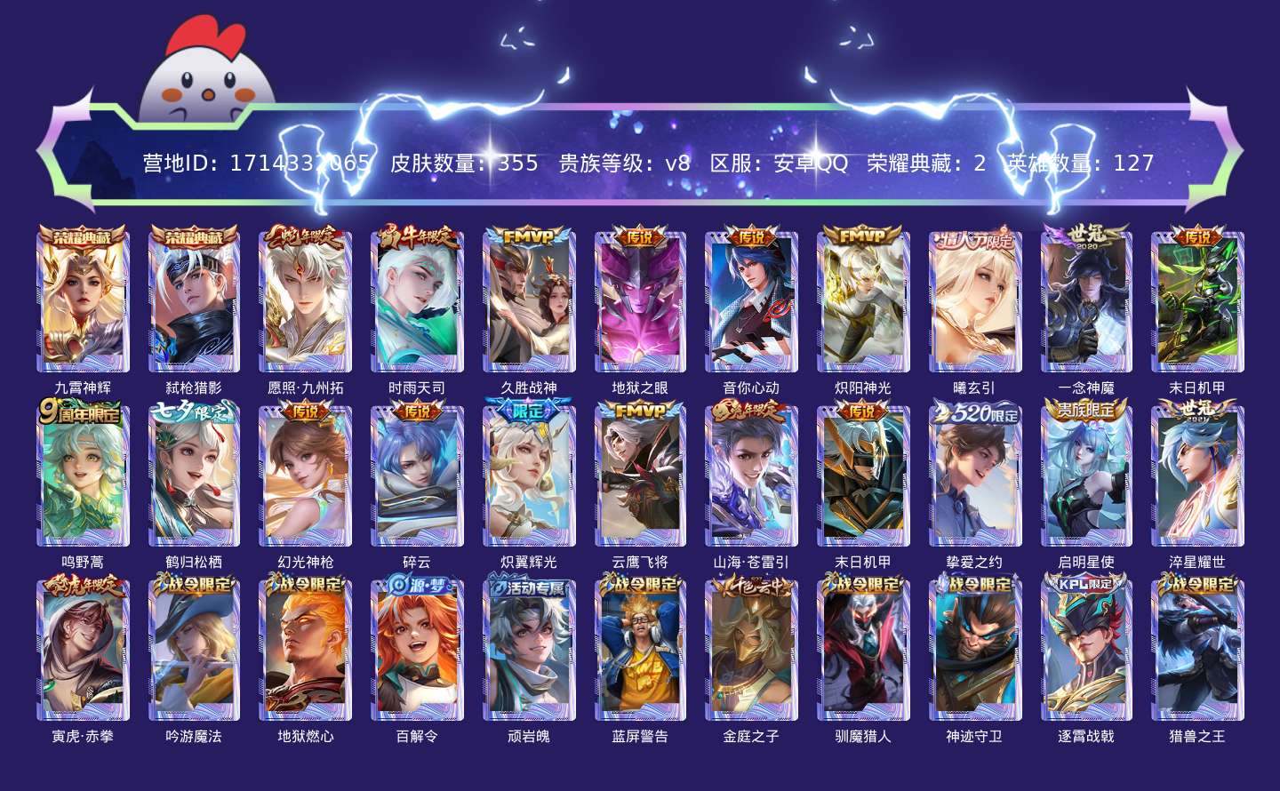 贵族等级:v8皮肤数:355传说品质21 生肖限定7 荣耀典藏2 情人节限定1 英雄数:127