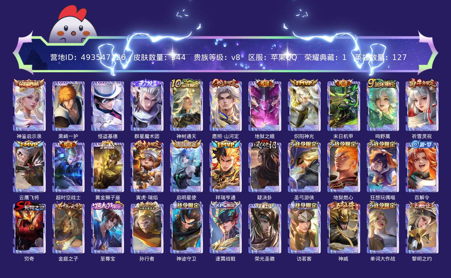 贵族等级:v8皮肤数:344传说品质13 生肖限定4 情人节限定1 珍品传说2 荣耀典藏1 无双1 英雄数:127