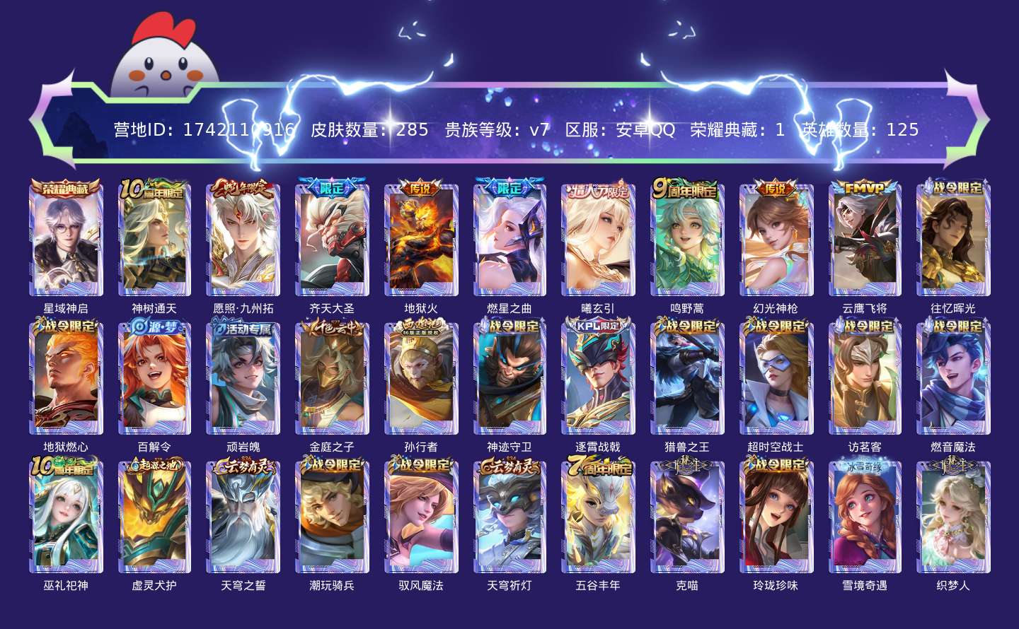 贵族等级:v7皮肤数:285传说品质9 生肖限定2 荣耀典藏1 情人节限定1 英雄数:125