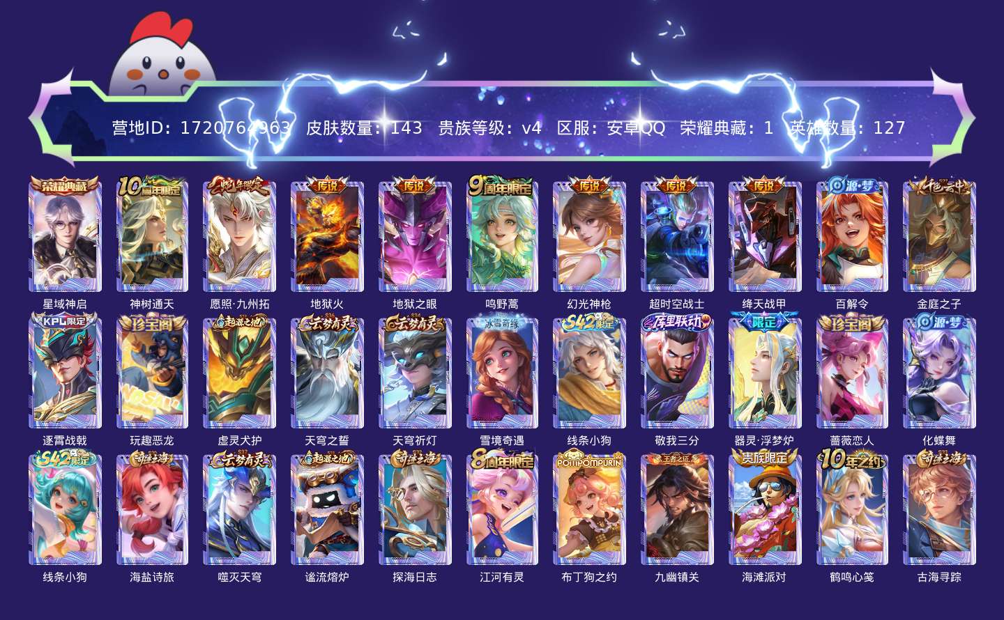 贵族等级:v4皮肤数:143传说品质8 生肖限定1 荣耀典藏1 英雄数:127