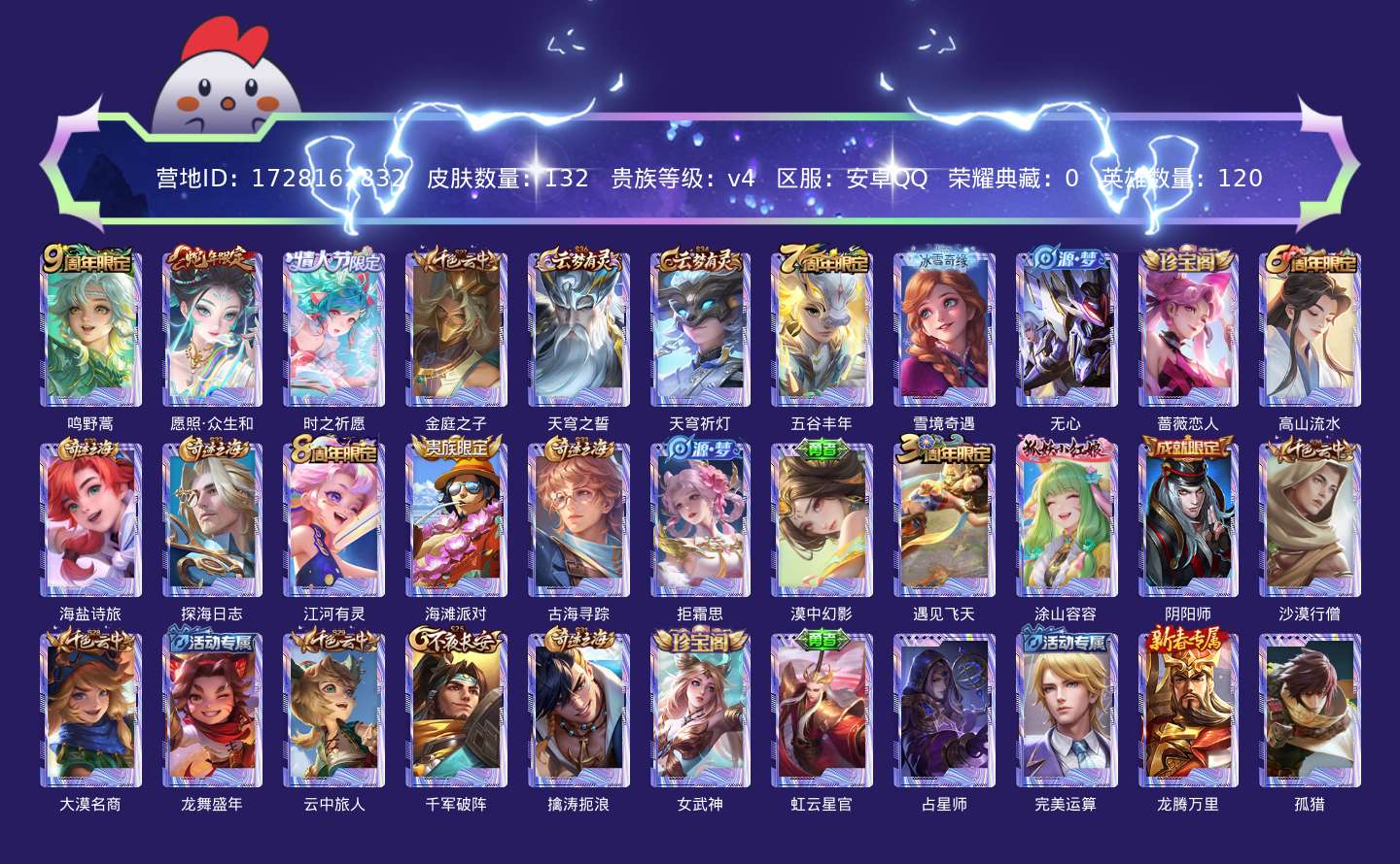 贵族等级:v4皮肤数:132传说品质3 生肖限定1 情人节限定1 英雄数:120